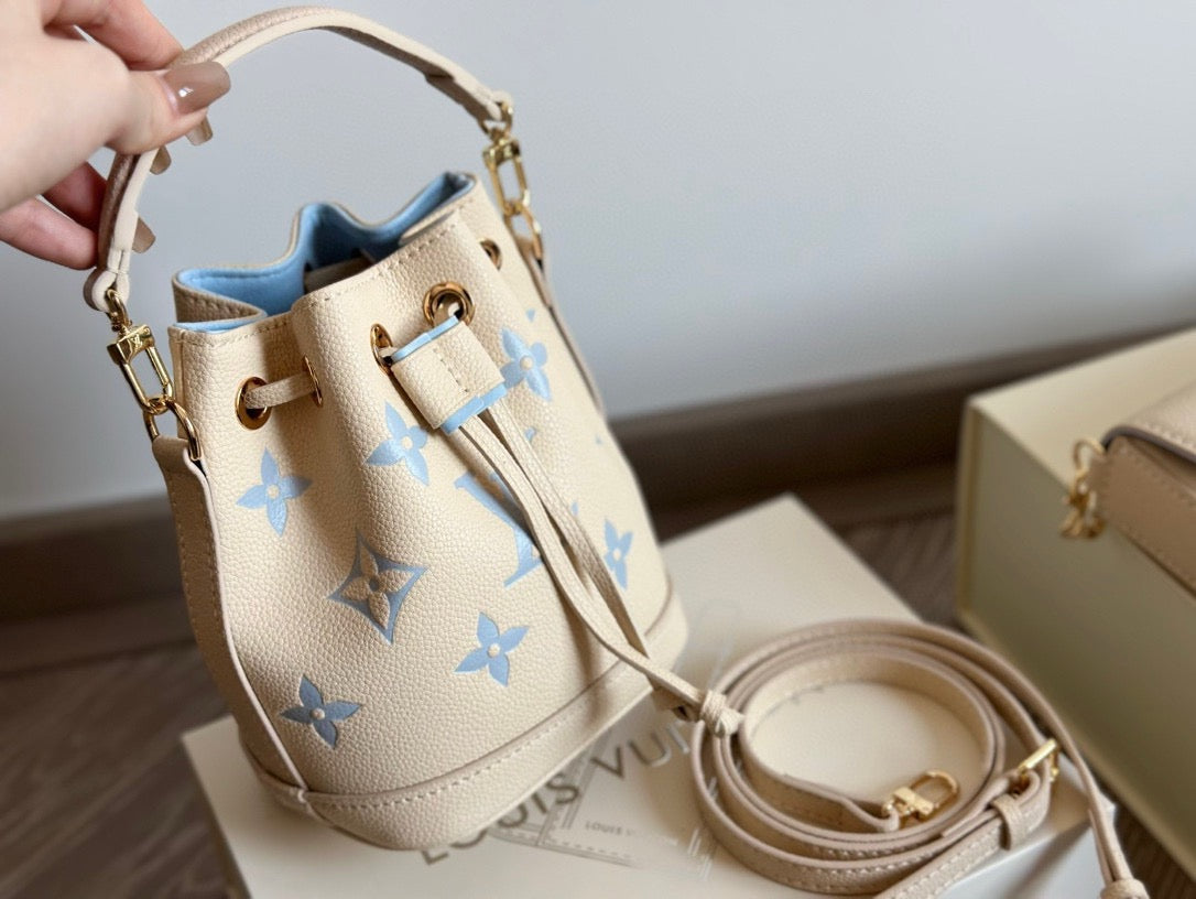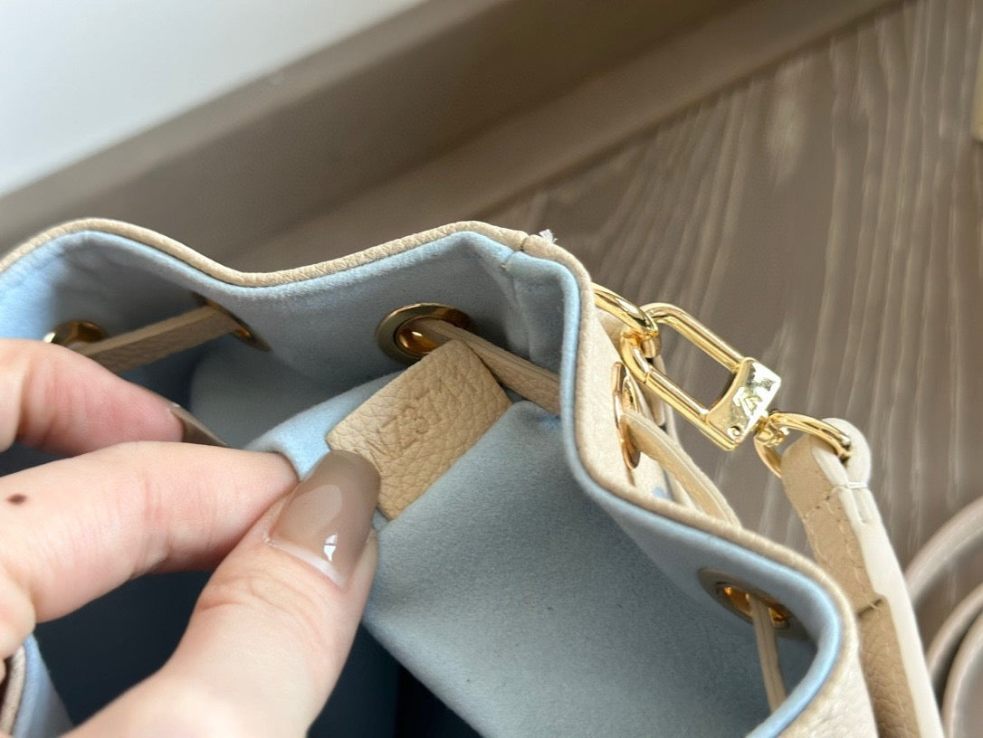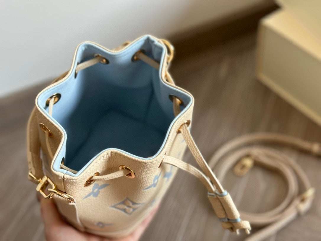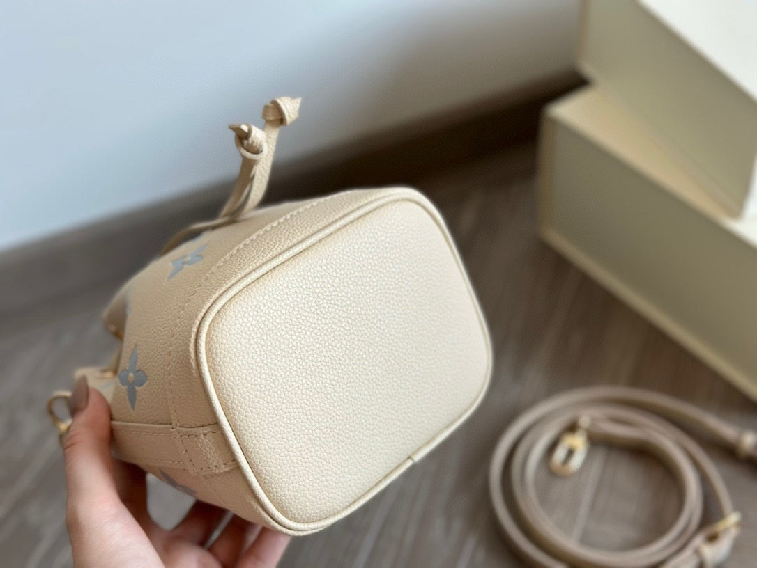 This bicolor version of the Nano Noé is crafted from supple Monogram Empreinte leather, embossed with the Monogram pattern. This miniature replica of the iconic Noé bag is a stylish way to carry everyday essentials. In addition to its practical drawstring closure, it features a removable handle and a removable, adjustable shoulder strap for different carry options.