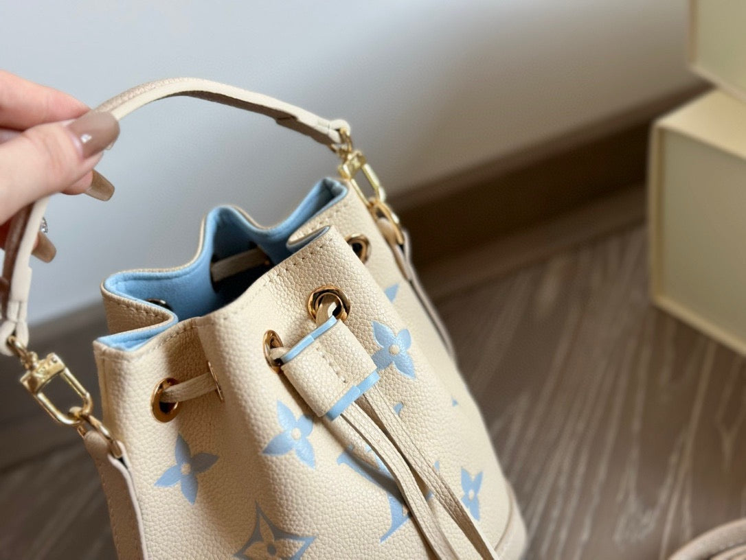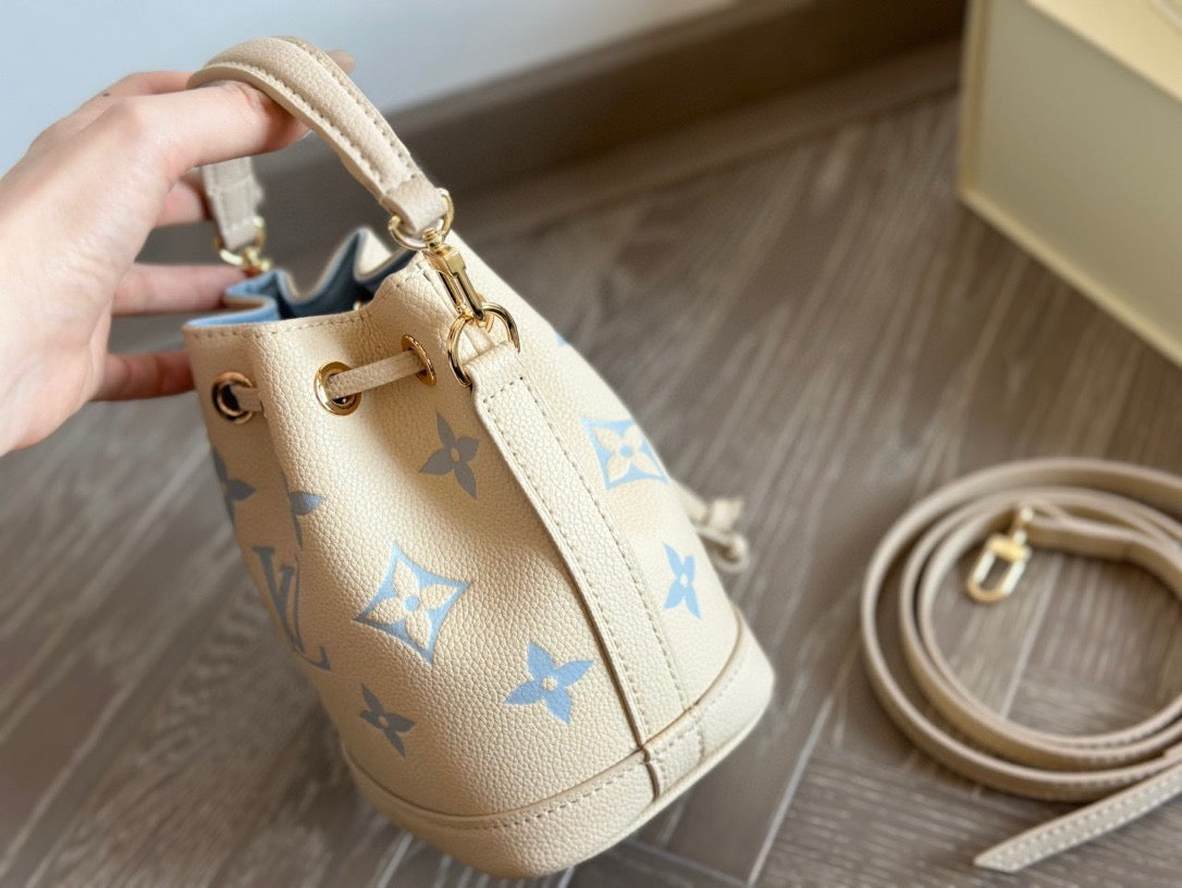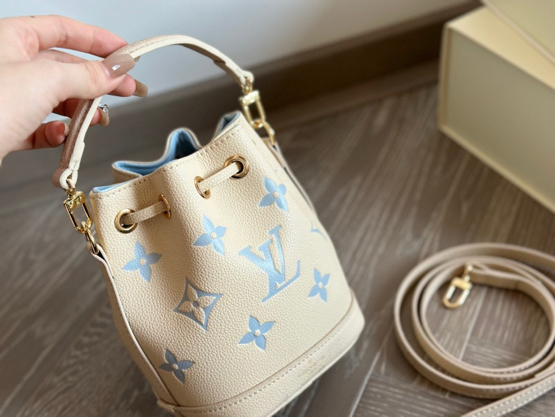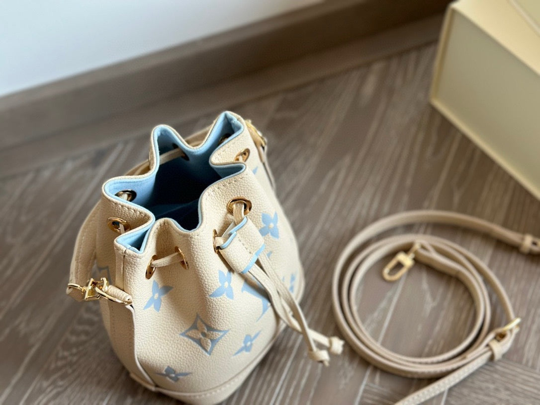 This bicolor version of the Nano Noé is crafted from supple Monogram Empreinte leather, embossed with the Monogram pattern. This miniature replica of the iconic Noé bag is a stylish way to carry everyday essentials. In addition to its practical drawstring closure, it features a removable handle and a removable, adjustable shoulder strap for different carry options.