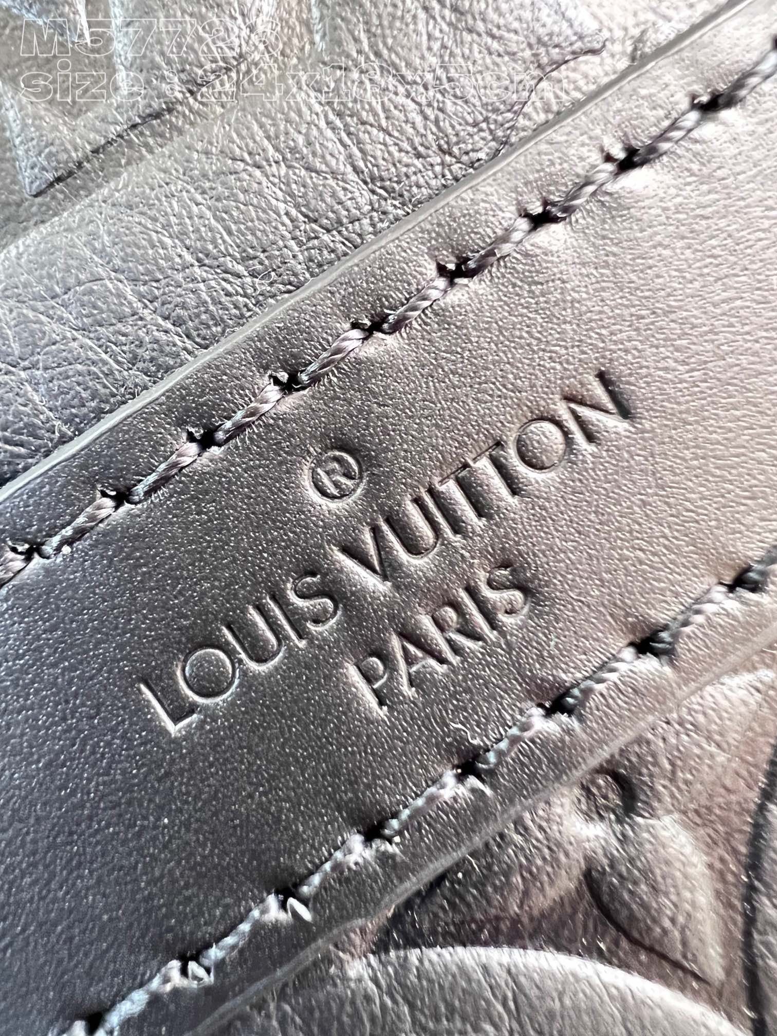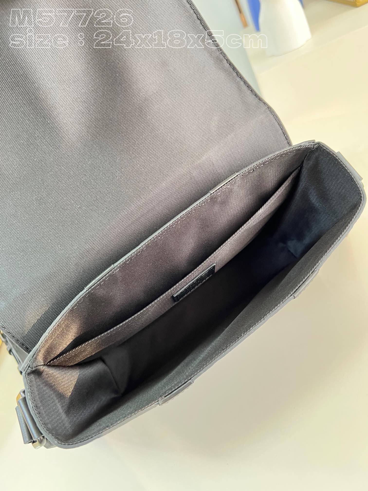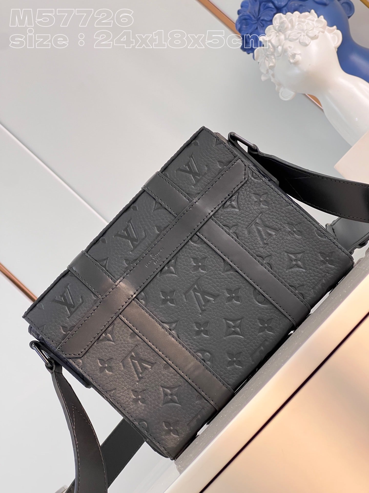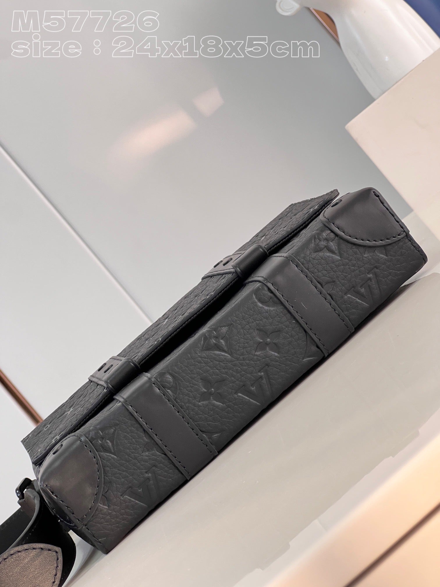 The Trunk Messenger is a small rectangular bag made from Monogram-embossed Taurillon leather and finished with matte-black rivets and reinforced black-leather corners, inspired by those on Louis Vuitton’s iconic trunks. It features a strap not adjustable or removeable and numerous pockets, inside and out, to keep things organized and accessible.