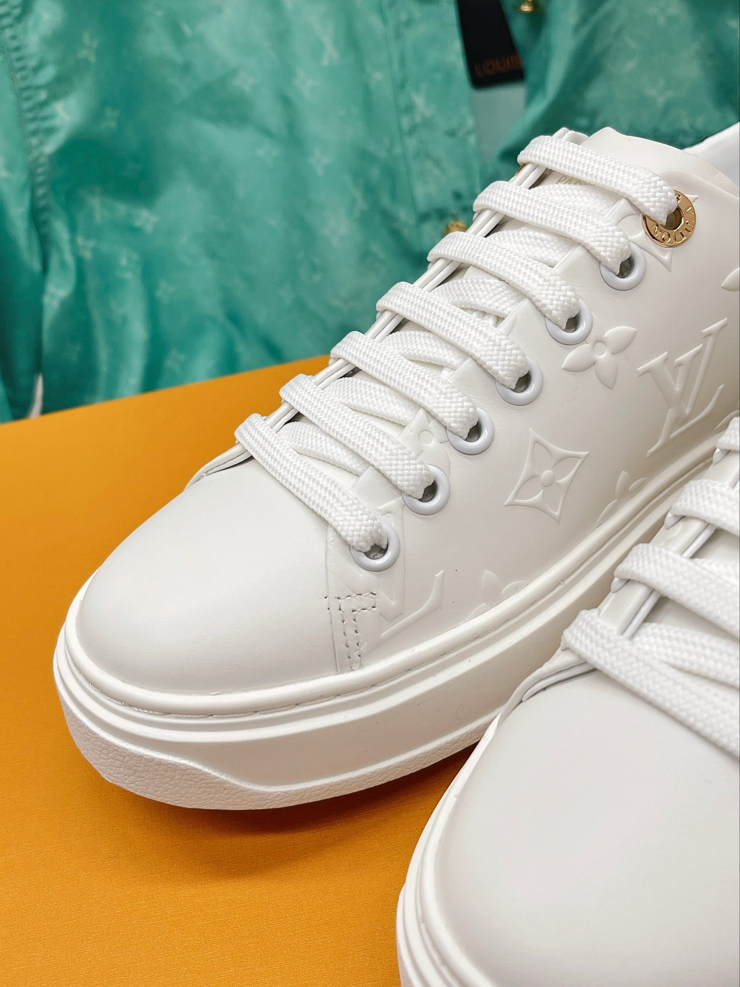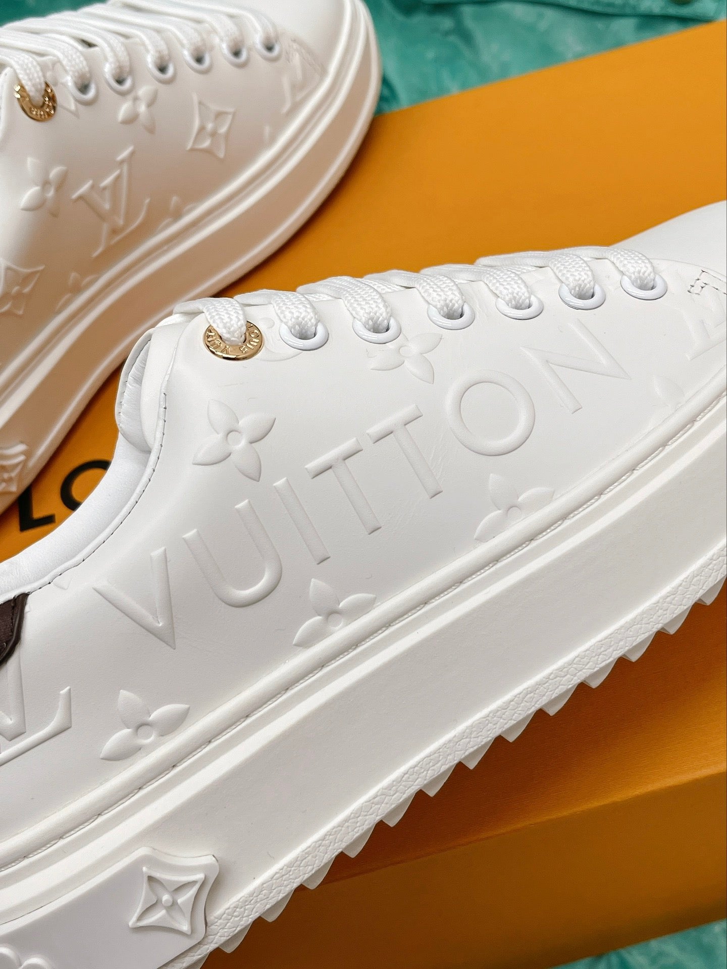 The emblematic Time Out sneaker is revisited in soft calf leather, which is debossed with the Louis Vuitton signature and the Monogram pattern. The design is complemented by a trim in recycled Monogram nylon at the back. This model is finished with an elevated rubber outsole with a 3-D pattern of Monogram Flowers.
