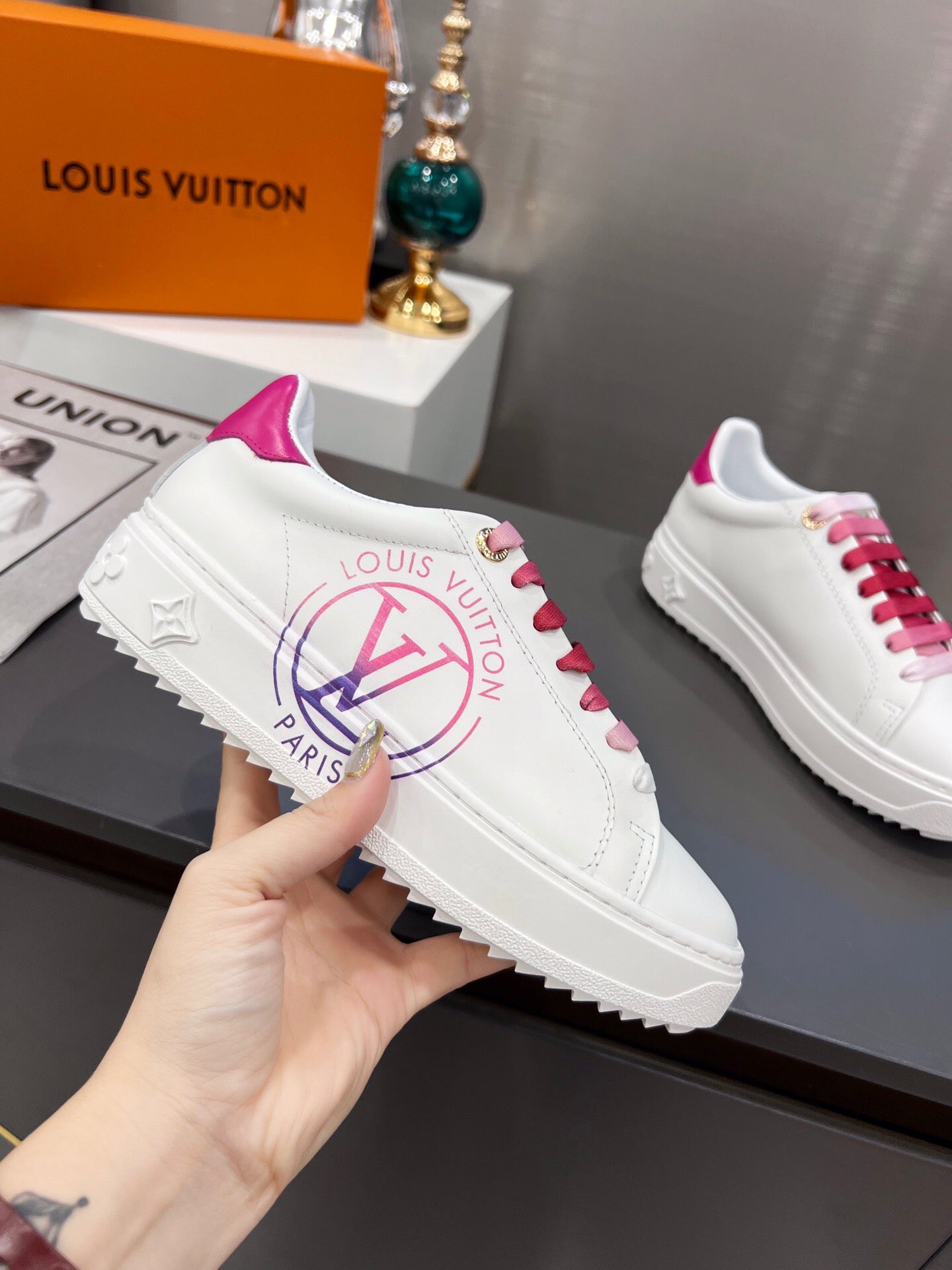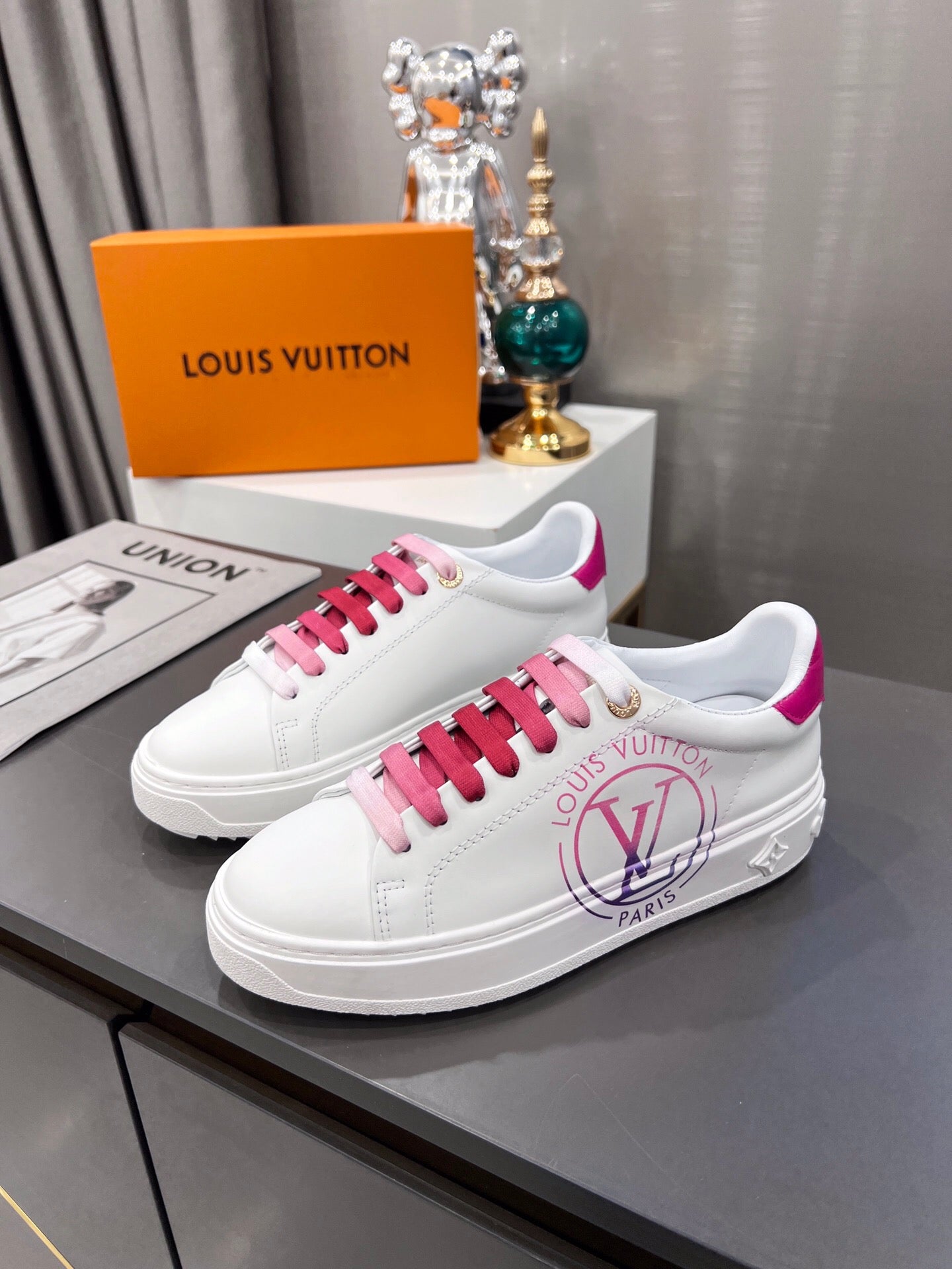 The emblematic Time Out sneaker is revisited in printed calf leather with a color-gradient effect on both the laces and the oversized LV Circle signature on the side. Other refined details of this design include Louis Vuitton-engraved, gold-tone eyelets and the 3-D pattern of Monogram Flowers on the distinctive elevated outsole.