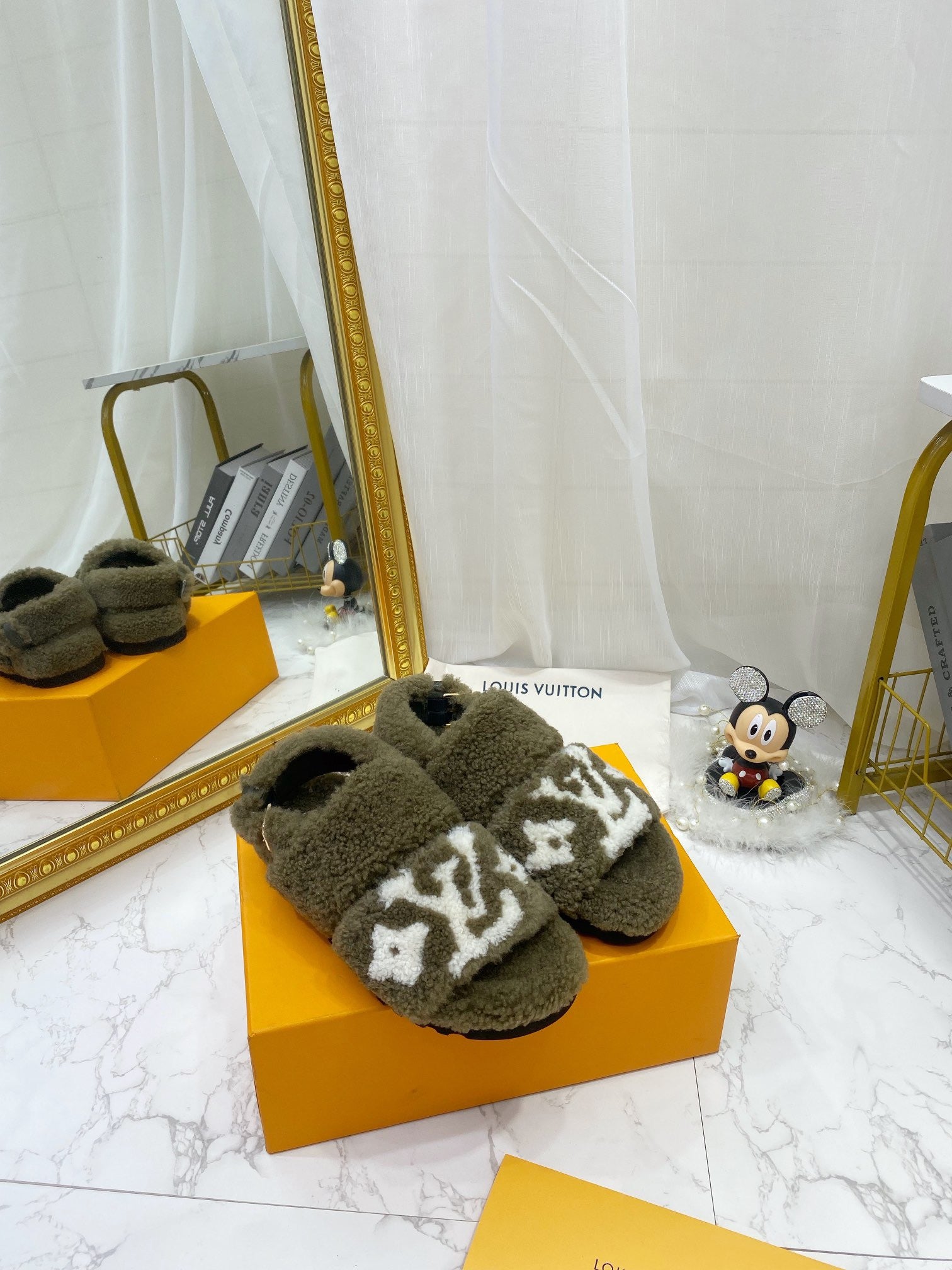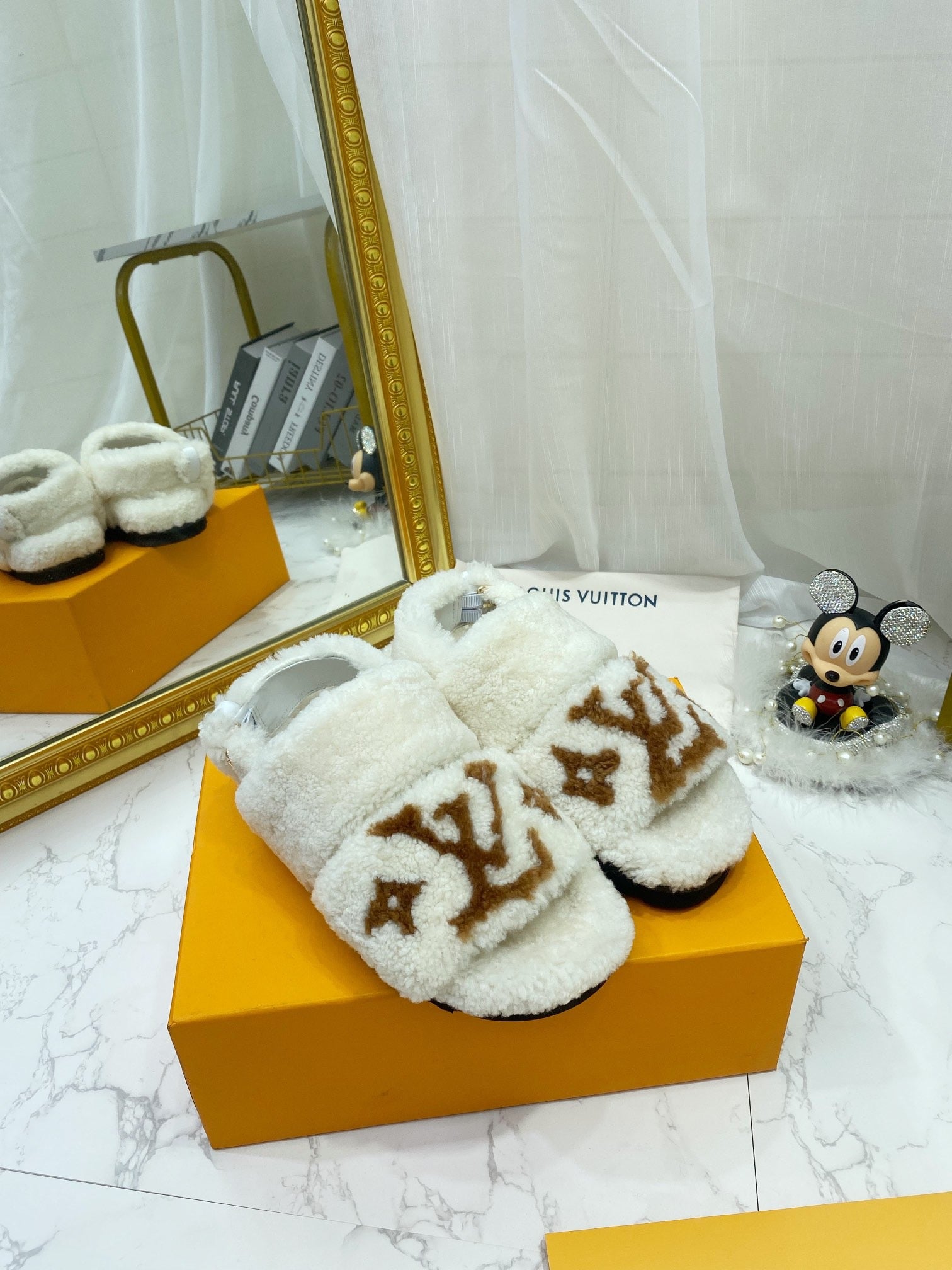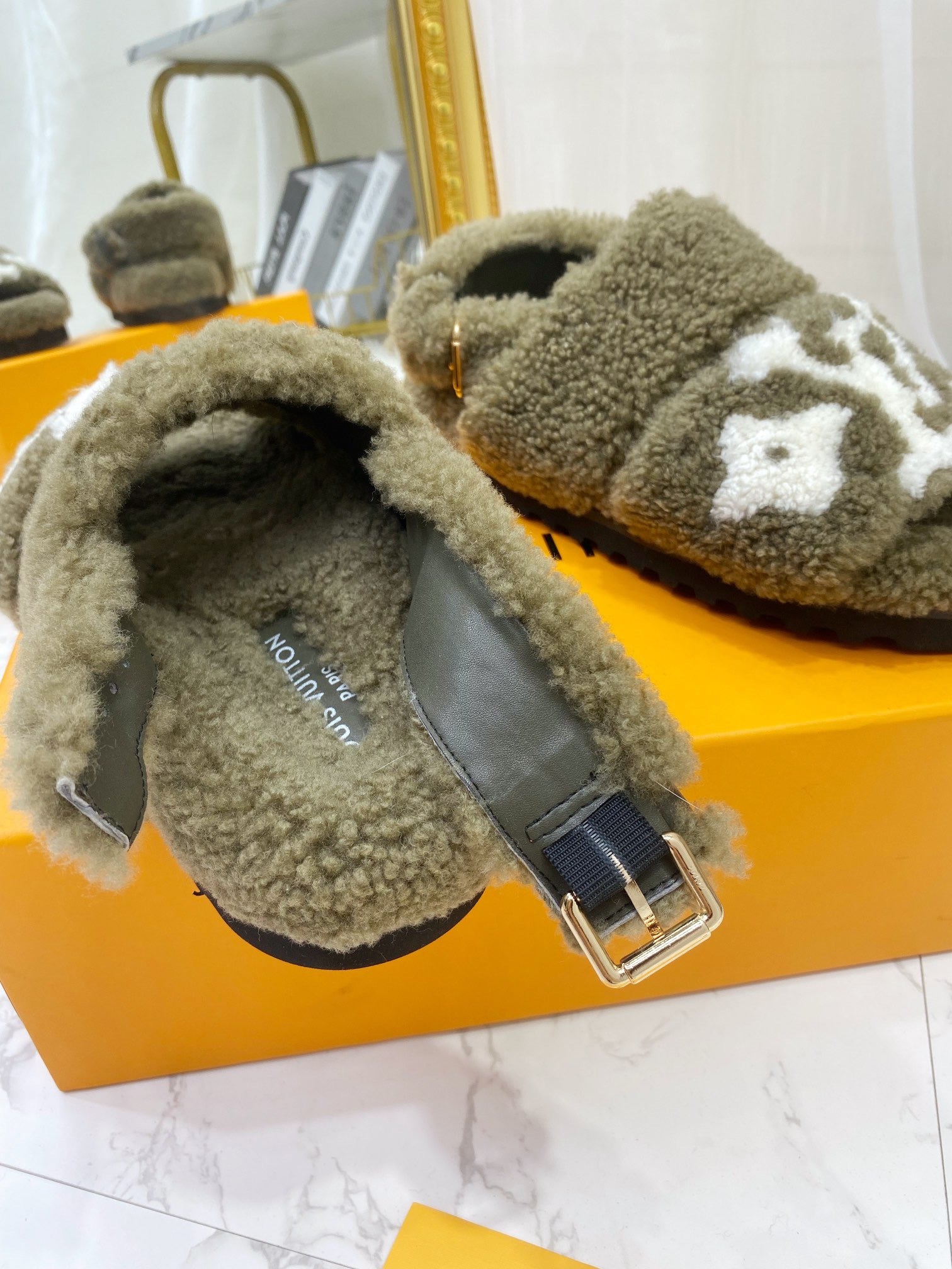 This wintry interpretation of the Paseo flat comfort mule comes in fluffy shearling for instant warmth and softness. The wide front strap is embellished with the LV Initials and Monogram Flowers in a contrasting shade. Suitable for indoor and outdoor wear, this model is finished with a treaded rubber outsole.