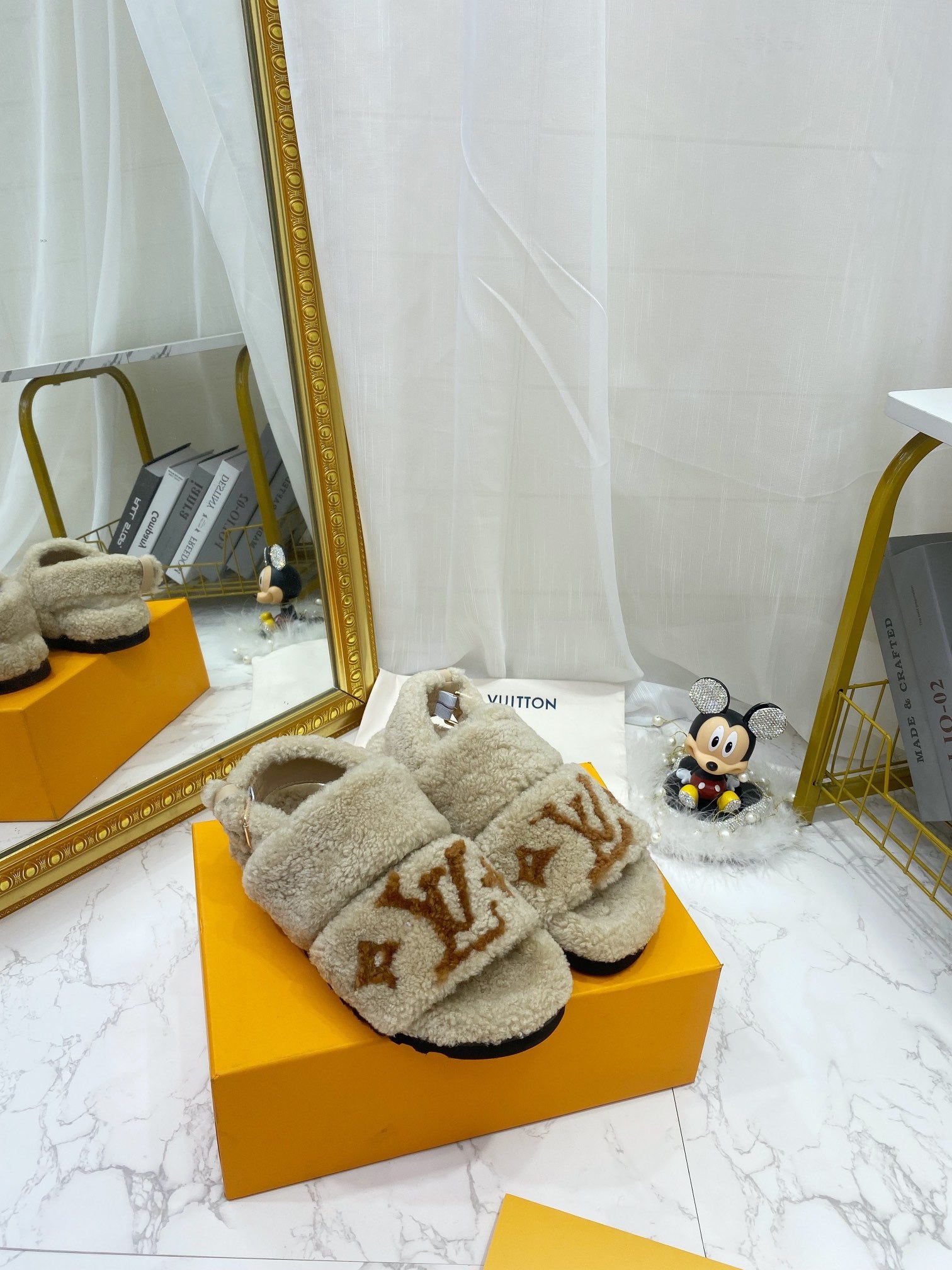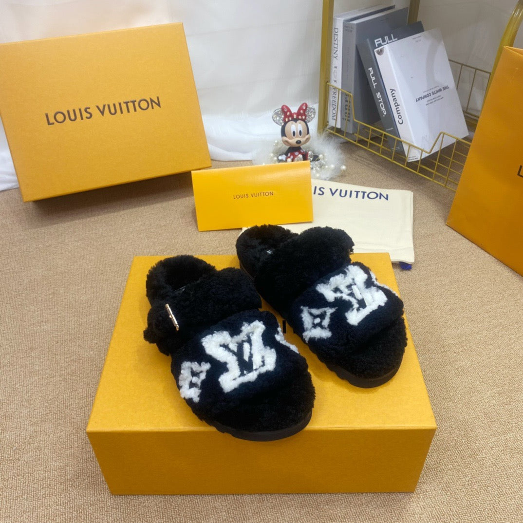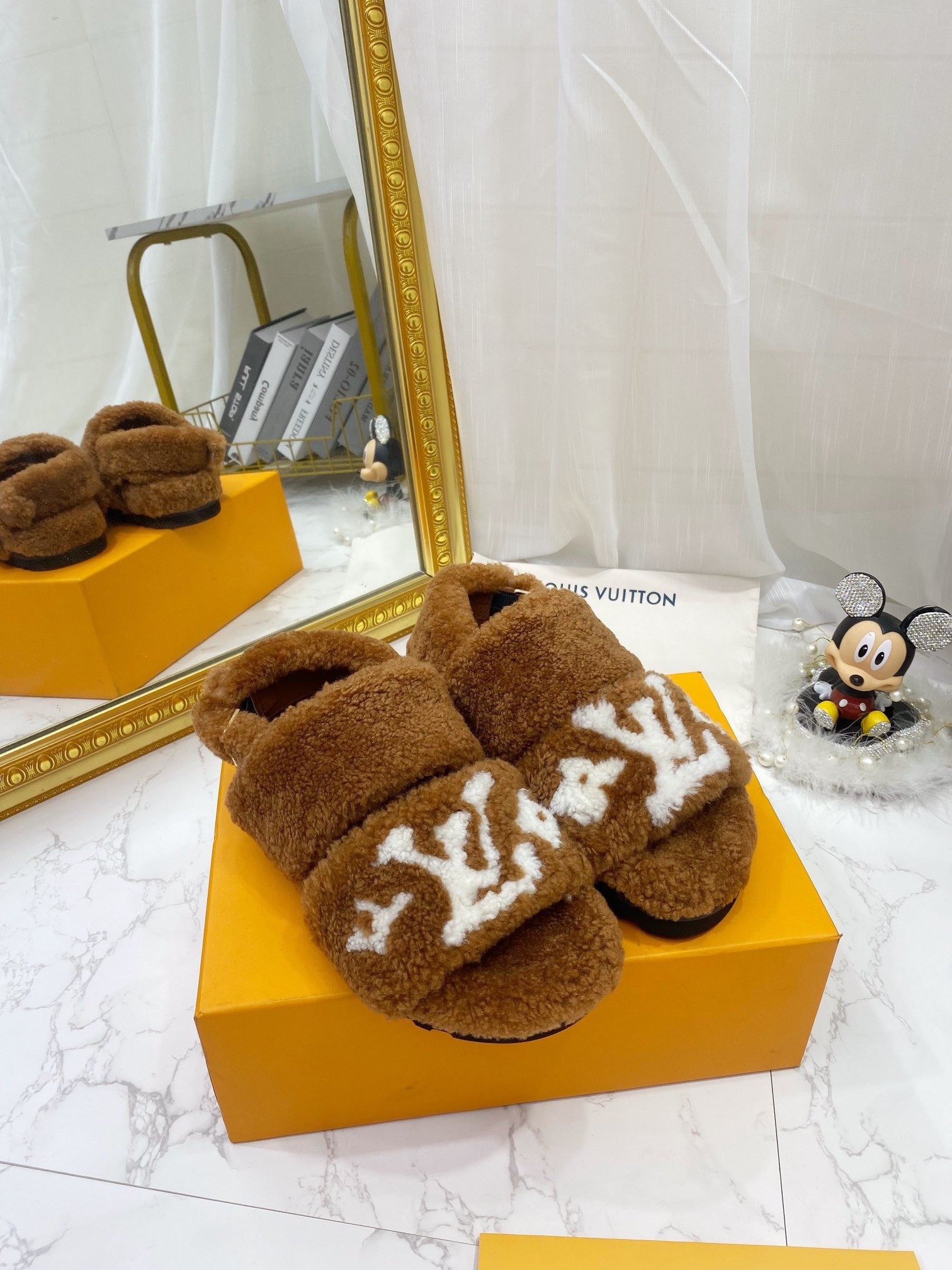This wintry interpretation of the Paseo flat comfort mule comes in fluffy shearling for instant warmth and softness. The wide front strap is embellished with the LV Initials and Monogram Flowers in a contrasting shade. Suitable for indoor and outdoor wear, this model is finished with a treaded rubber outsole.