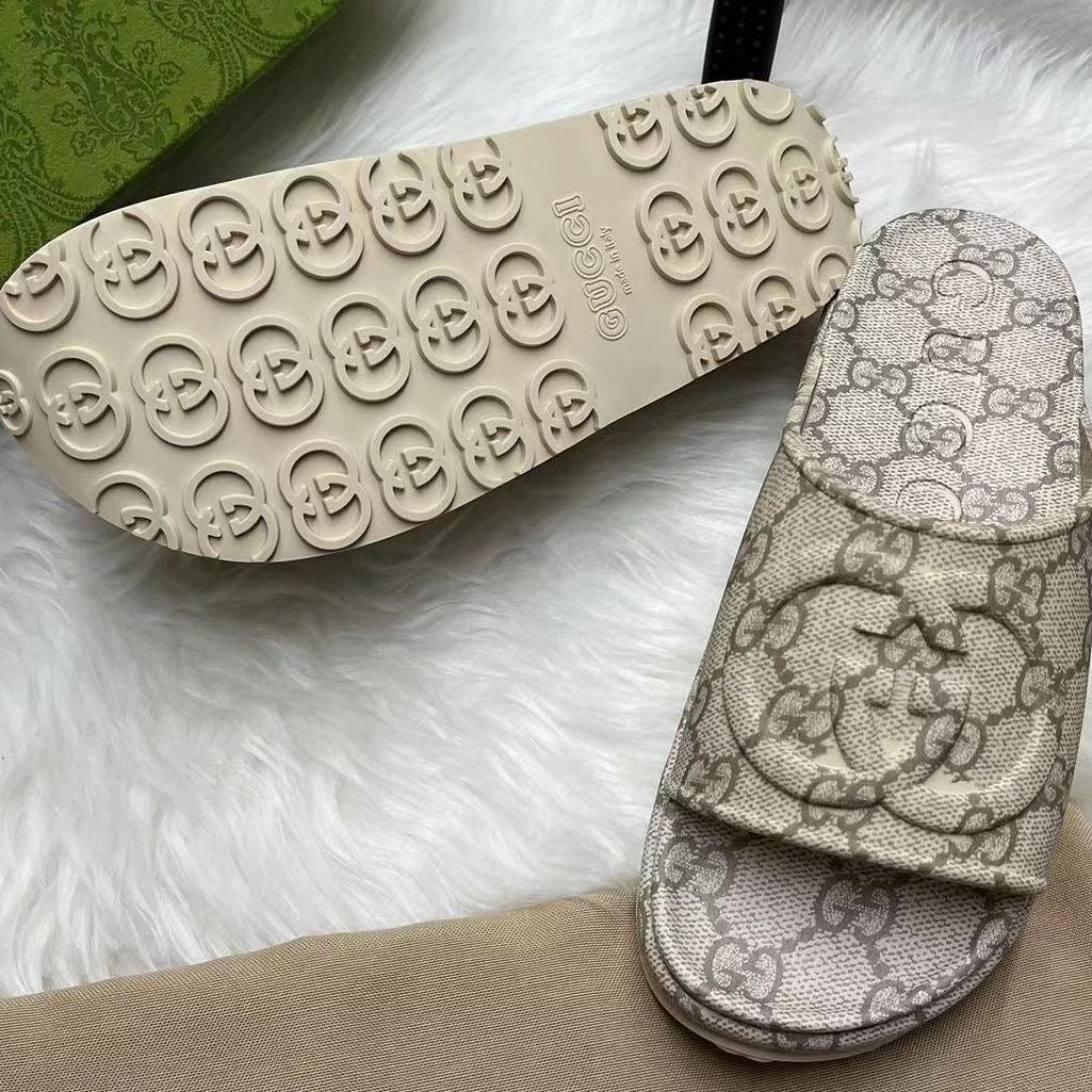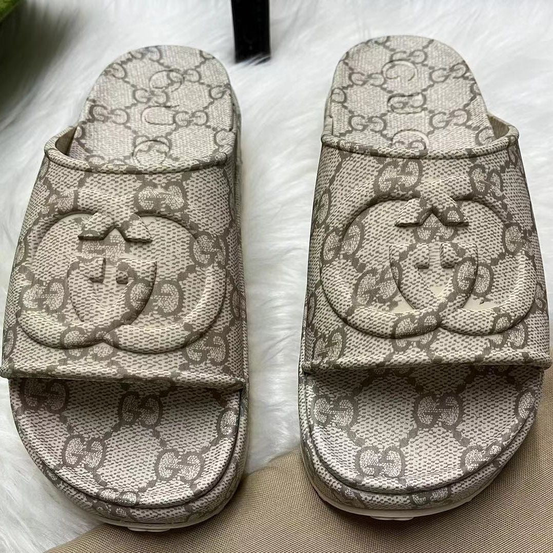 Intrinsically linked to the '90s, rubber adds a retro note to the latest collections. This pair of beige and ebony slide sandals accentuates the aesthetic with an embossed Interlocking G detail and chunky sole.