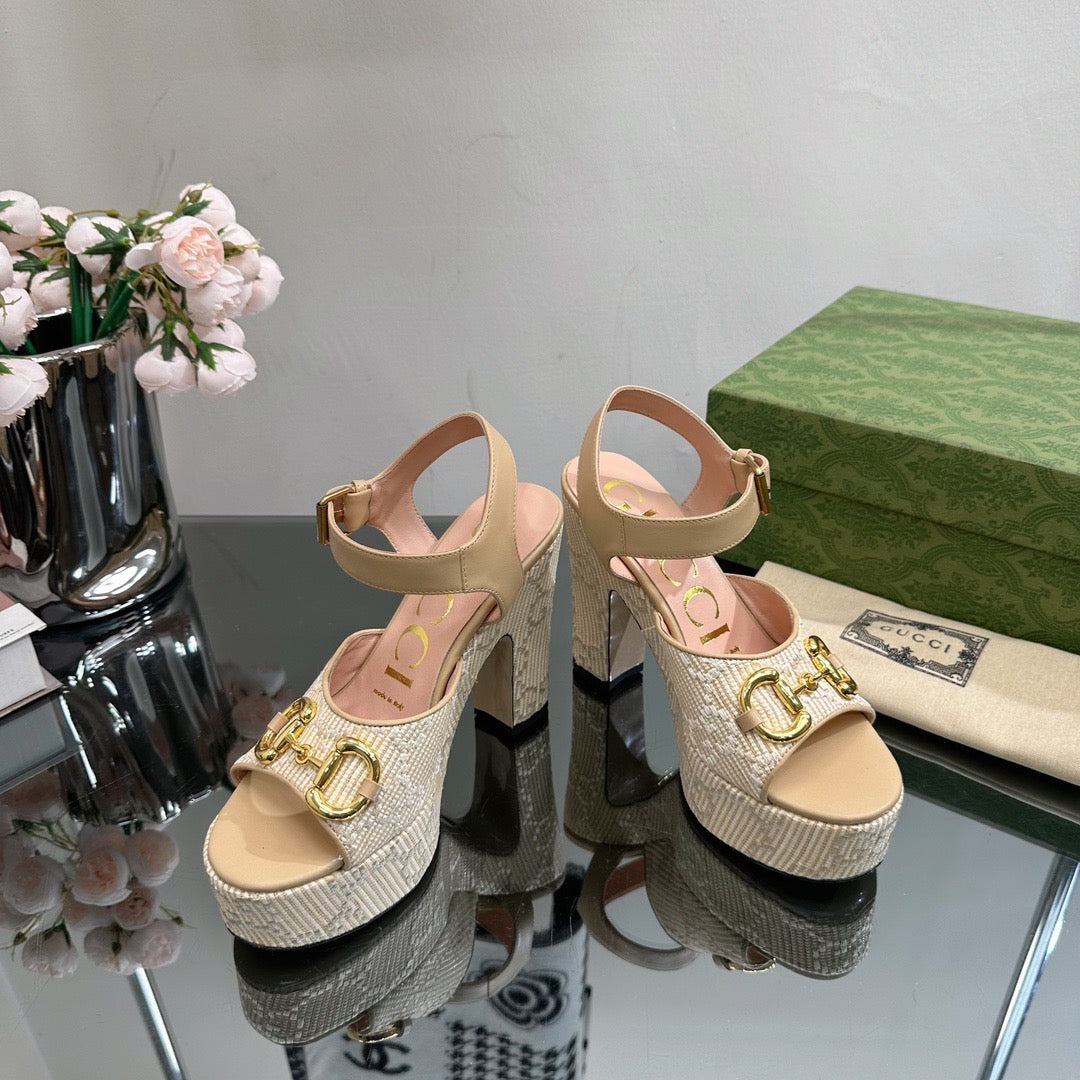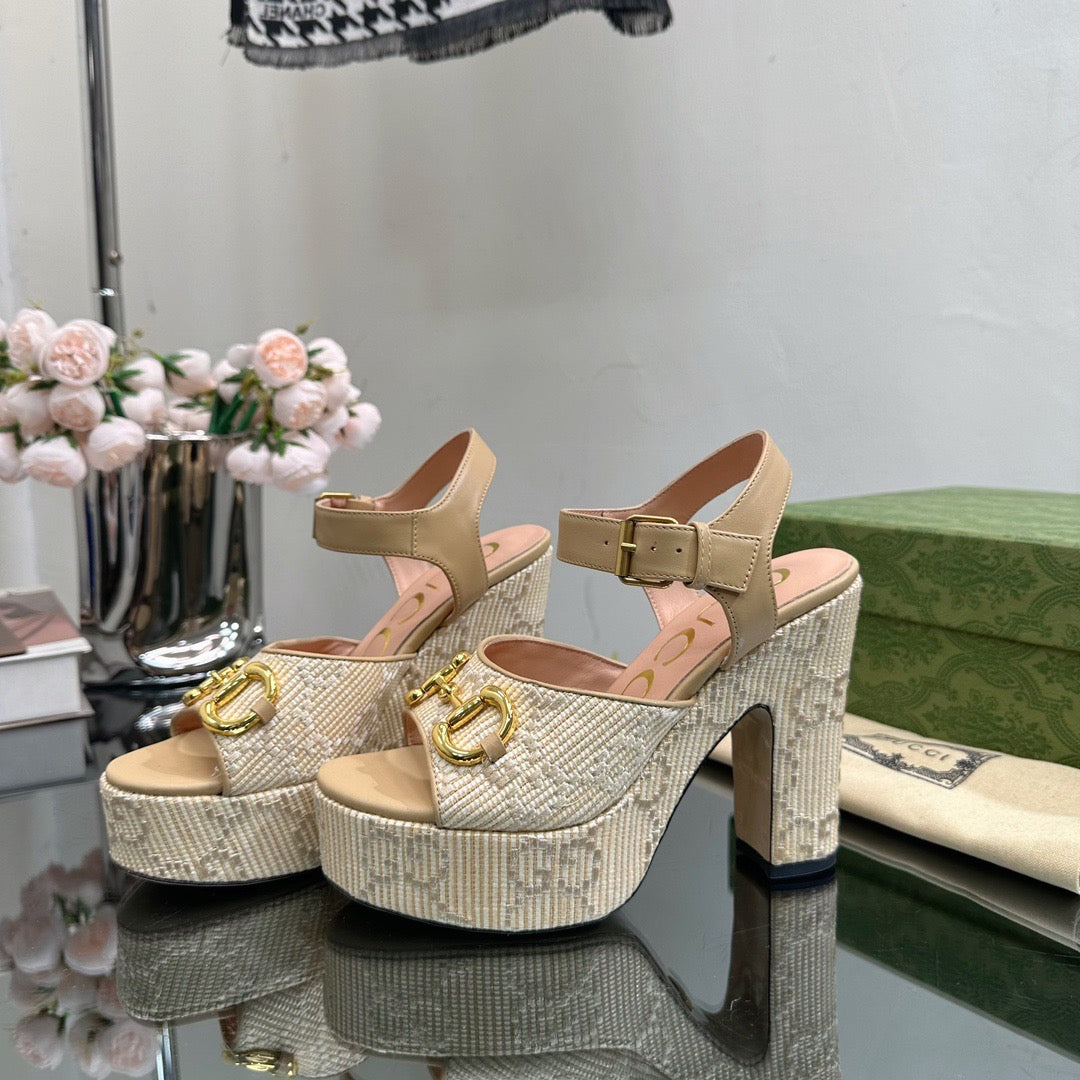 With a defined block heel, the platform sandal is introduced with the House's Horsebit hardware in gold-toned metal. Presented in natural raffia, this style is enhanced by the signature GG motif, celebrating Gucci's Founder.