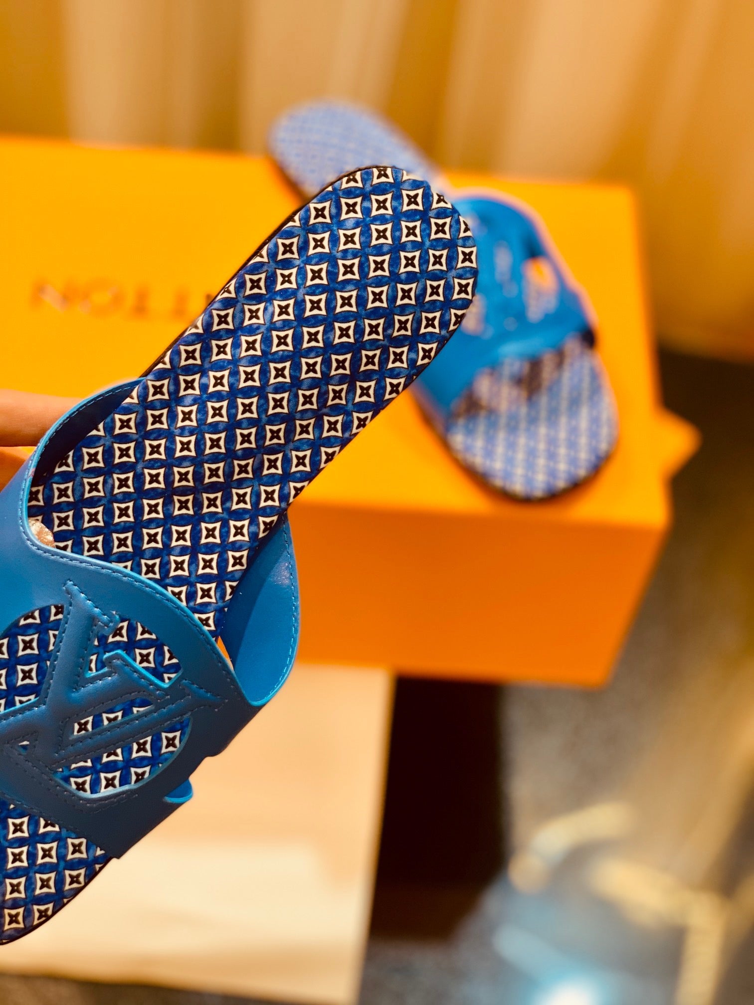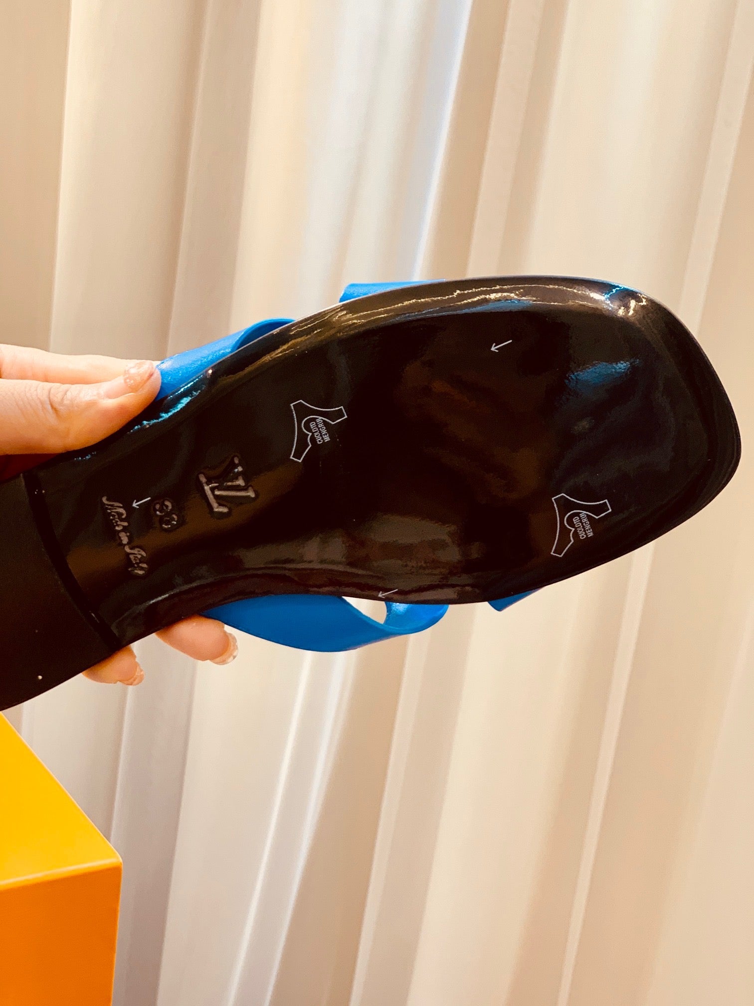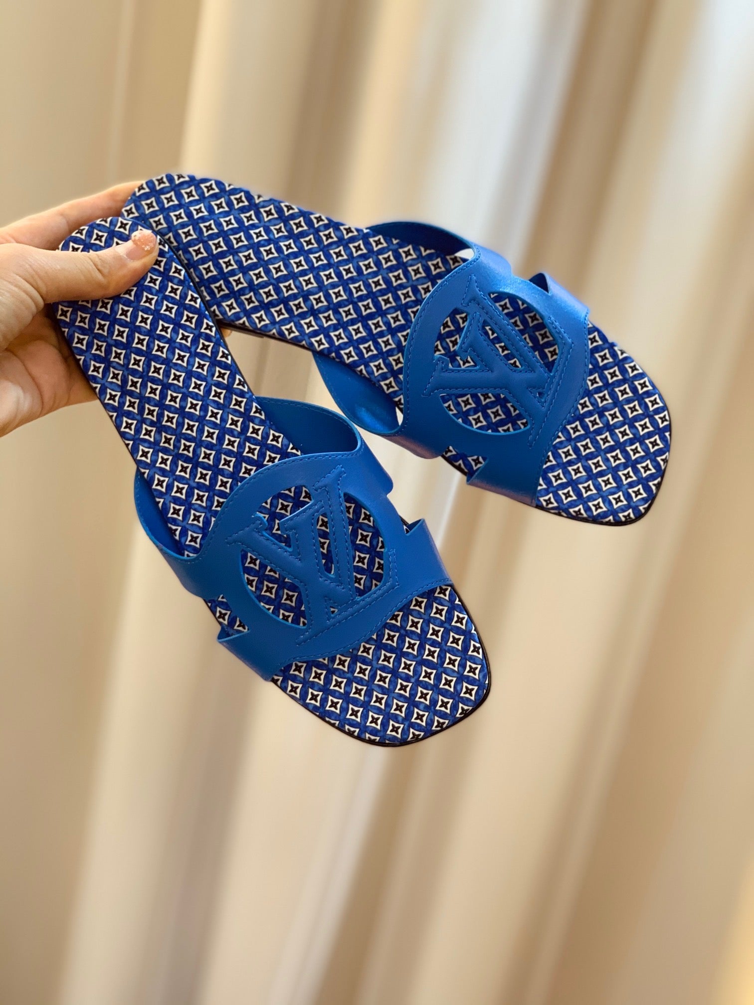 The LV Isola flat mule is a timeless style fashioned from soft calfskin. It has a wide front strap which is distinguished by an oversized LV Circle signature cut out of the leather. This model is finished with a durable monobloc outsole, crafted from several layers of leather, while a padded insole provides extra comfort. This animation features a colorful geometric pattern on the insole.