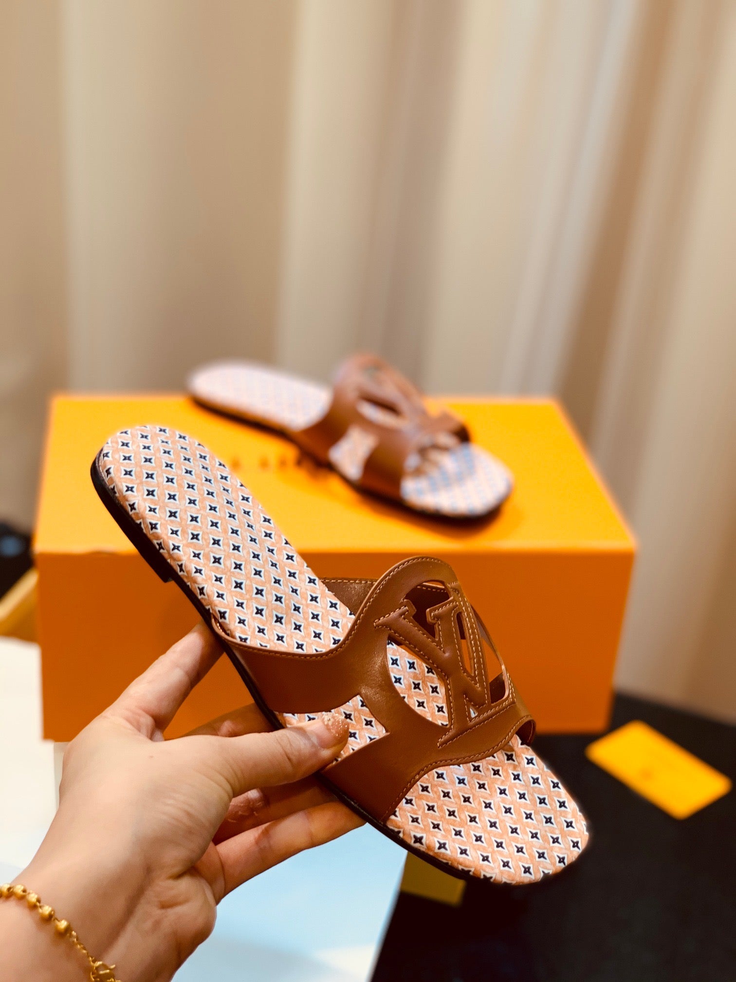 The LV Isola flat mule is a timeless style fashioned from soft calfskin. It has a wide front strap which is distinguished by an oversized LV Circle signature cut out of the leather. This model is finished with a durable monobloc outsole, crafted from several layers of leather, while a padded insole provides extra comfort. This animation features a colorful geometric pattern on the insole.