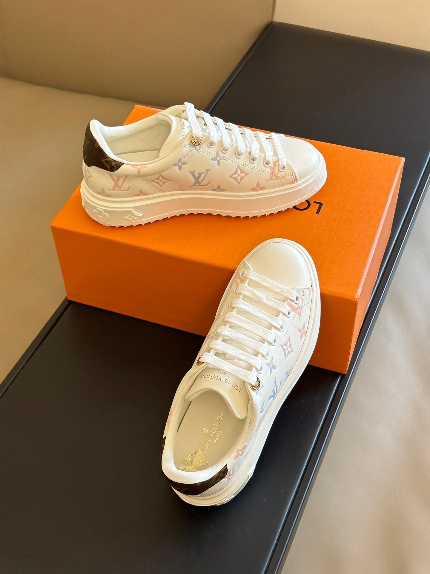 The emblematic Time Out sneaker is revisited in soft calf leather, which is debossed with the Louis Vuitton signature and the Monogram pattern. The design is complemented by a trim in recycled Monogram nylon at the back. This model is finished with an elevated rubber outsole with a 3-D pattern of Monogram Flowers.