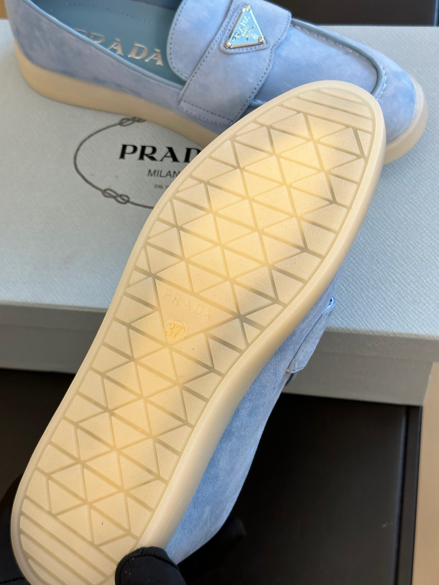 These suede leather loafers express classic allure and are distinguished by the pinched stitch seam on the upper. The enameled metal triangle logo stands out on the front.