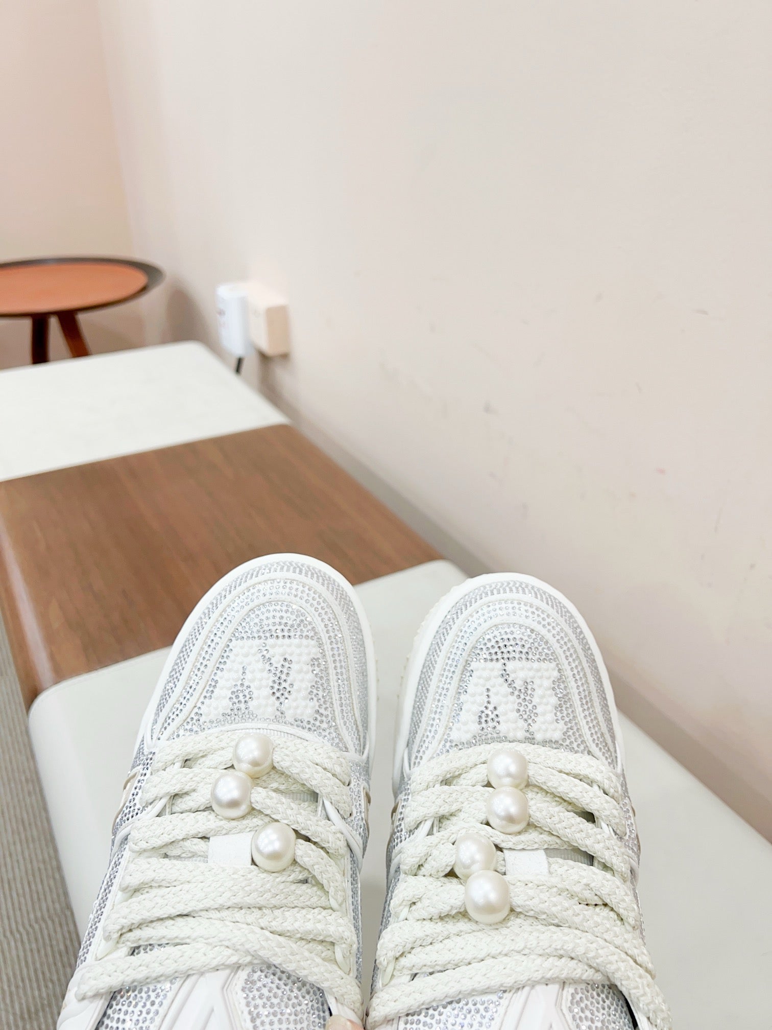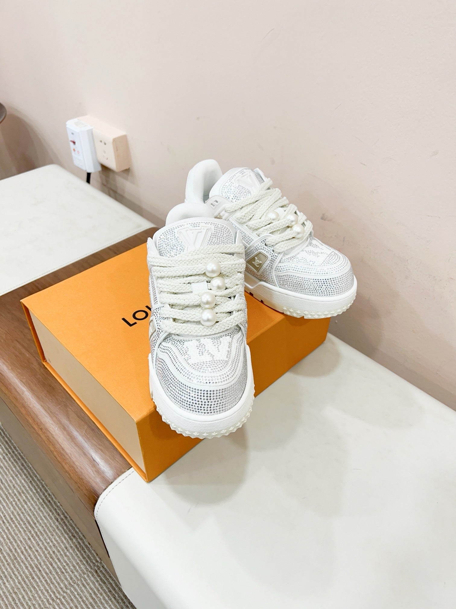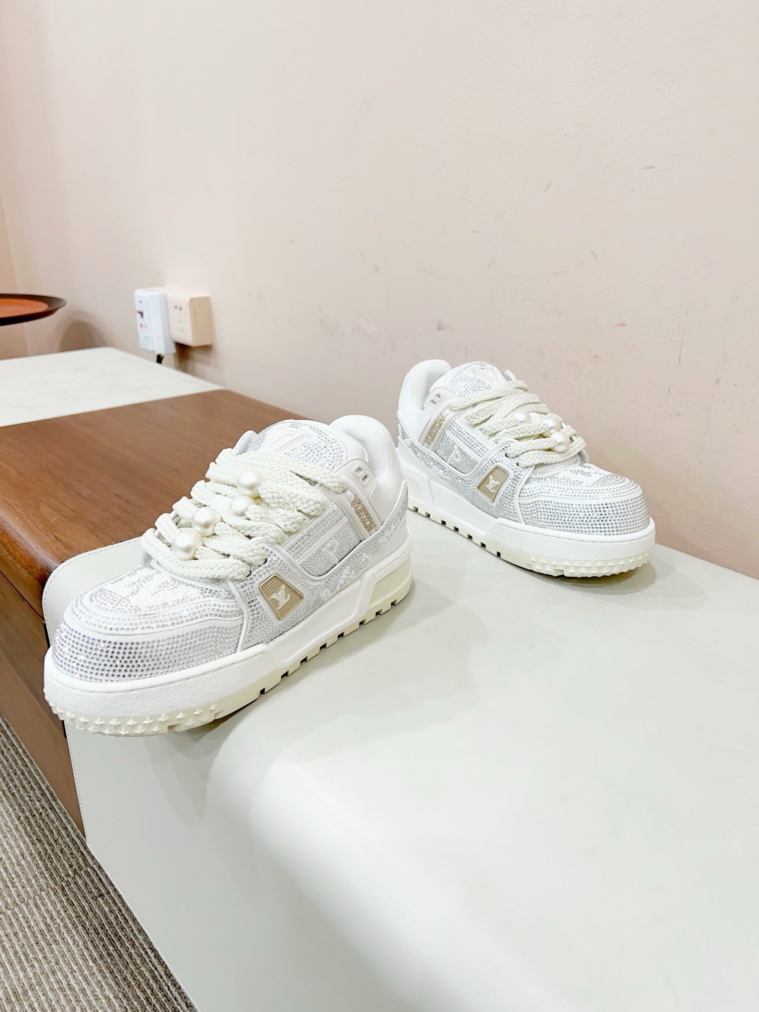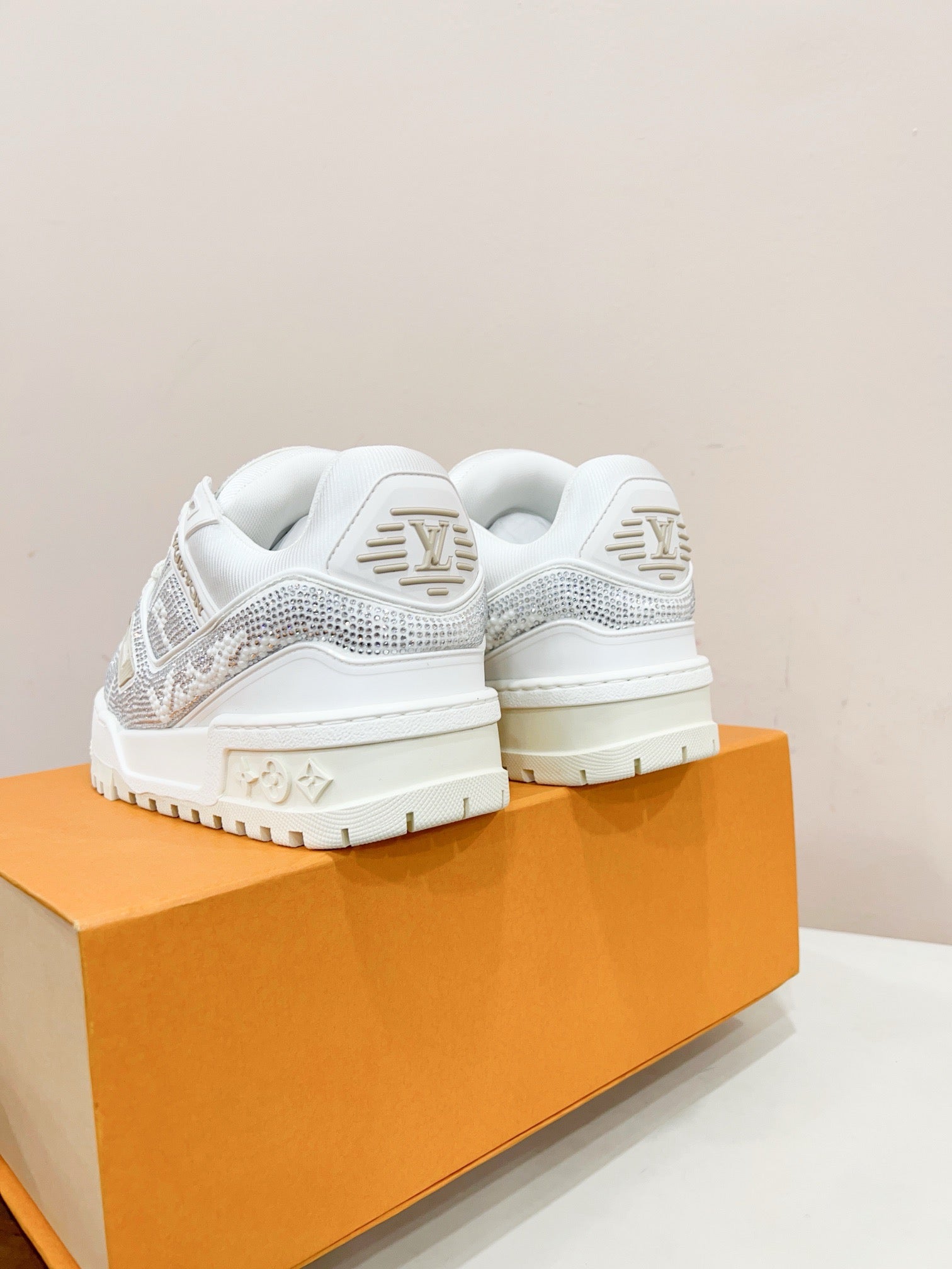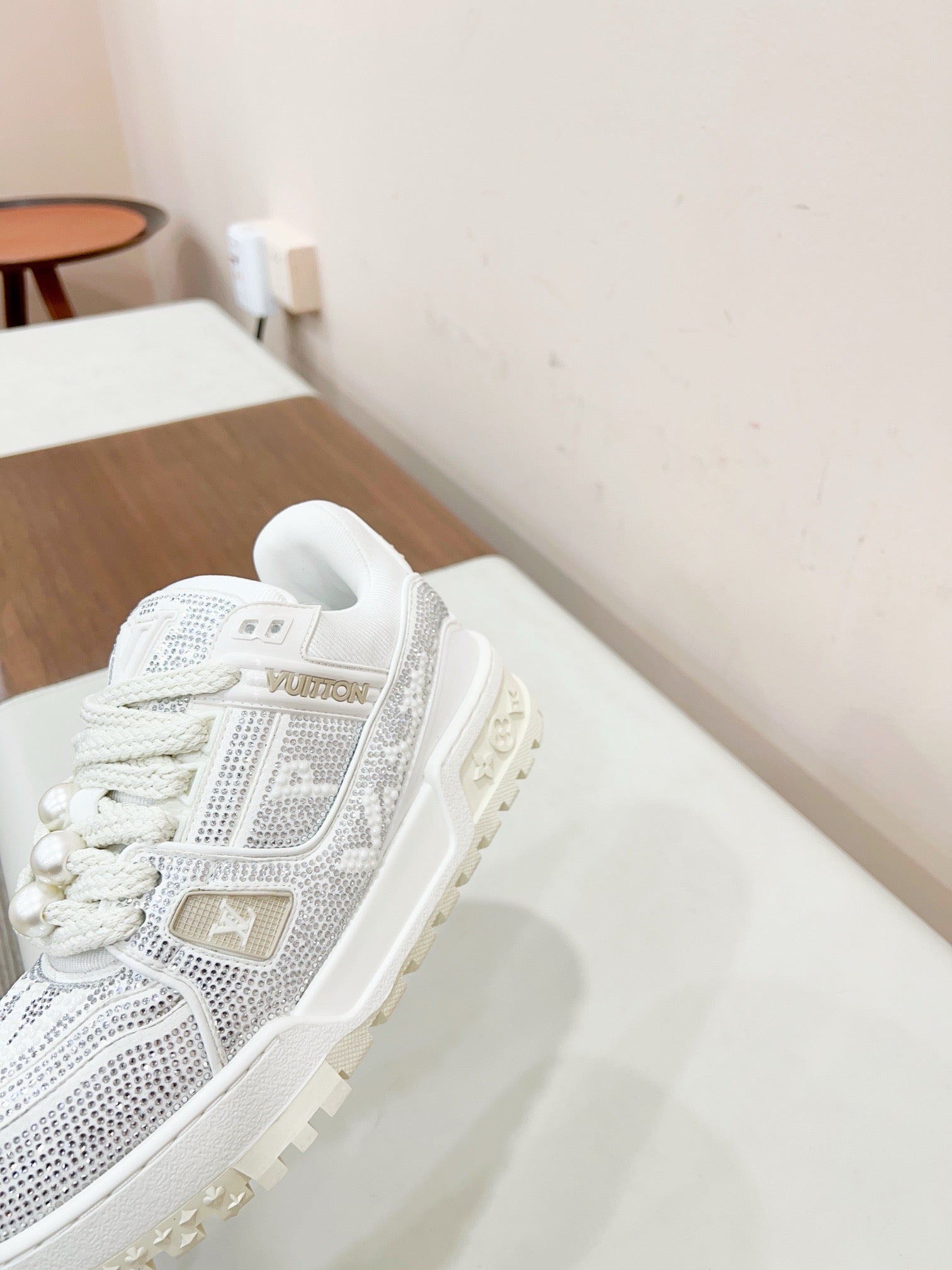 The LV Trainer Maxi sneaker reinterprets the iconic LV Trainer sneaker with a fashionable, oversized fit. This exceptional interpretation is covered with glittering Swarovski™ crystals and features Men's Creative Director Pharrell Williams' P initial, as well as the Vuitton signature, in lighter-colored crystals on the side. This model is finished with thick textile laces.