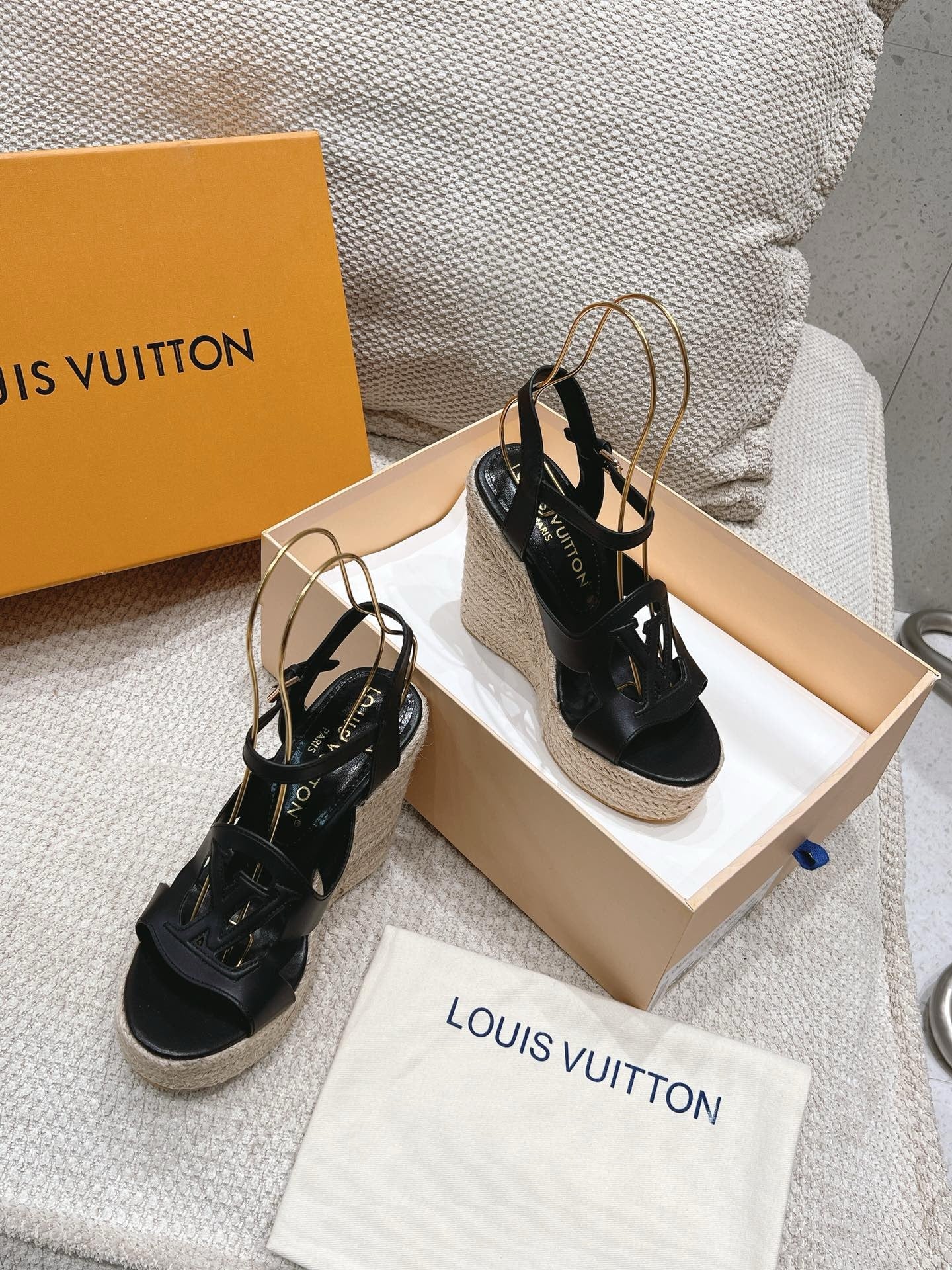 The LV Isola wedge sandal combines an upper in smooth calfskin with a comfortable braided-rope sole, which references the classic espadrille. The distinctive LV Circle motif, which is cut out of the upper, is the signature of the LV Isola line. This relaxed yet elegant model is fastened around the ankle with a gold-tone buckle.
