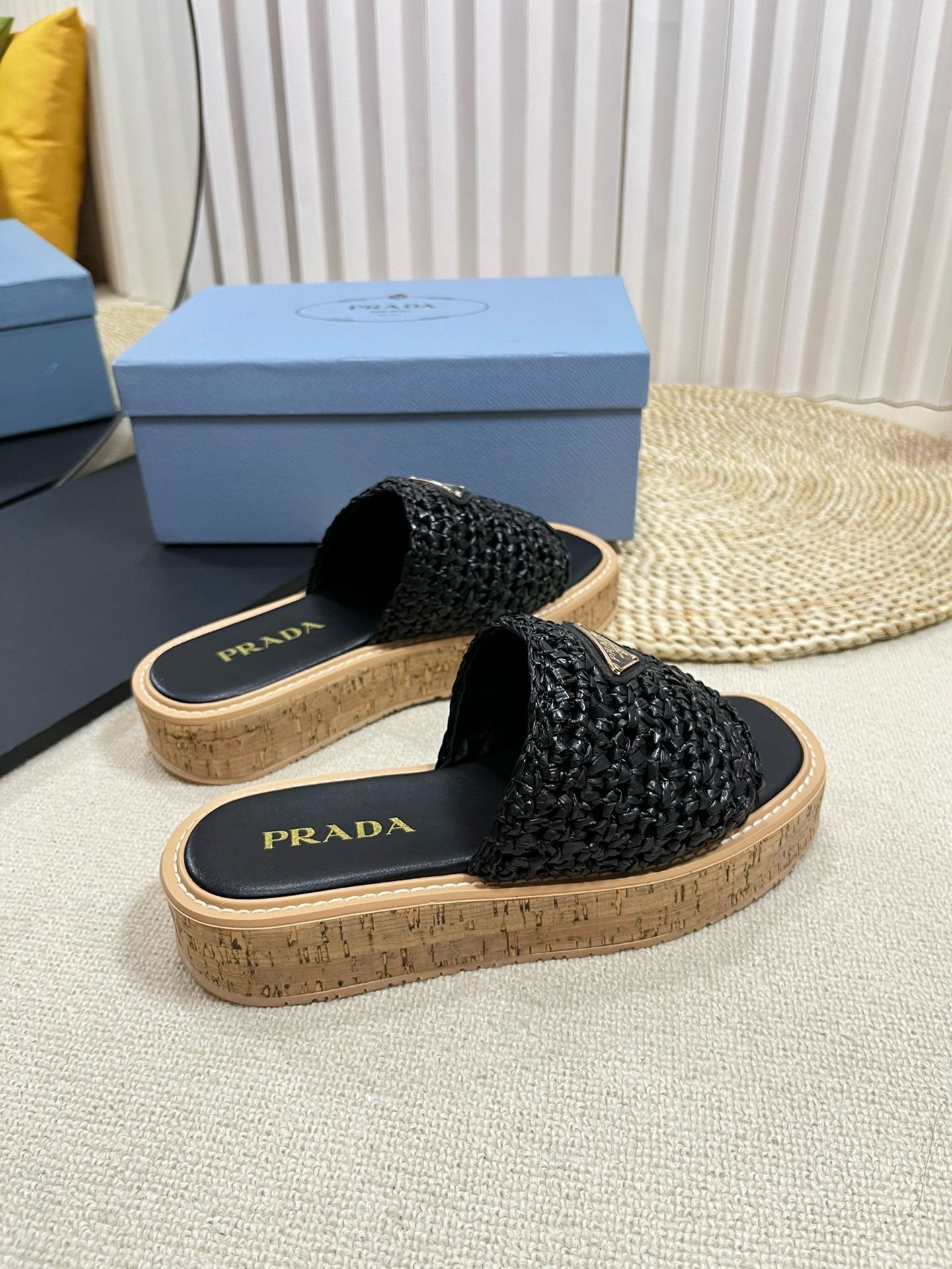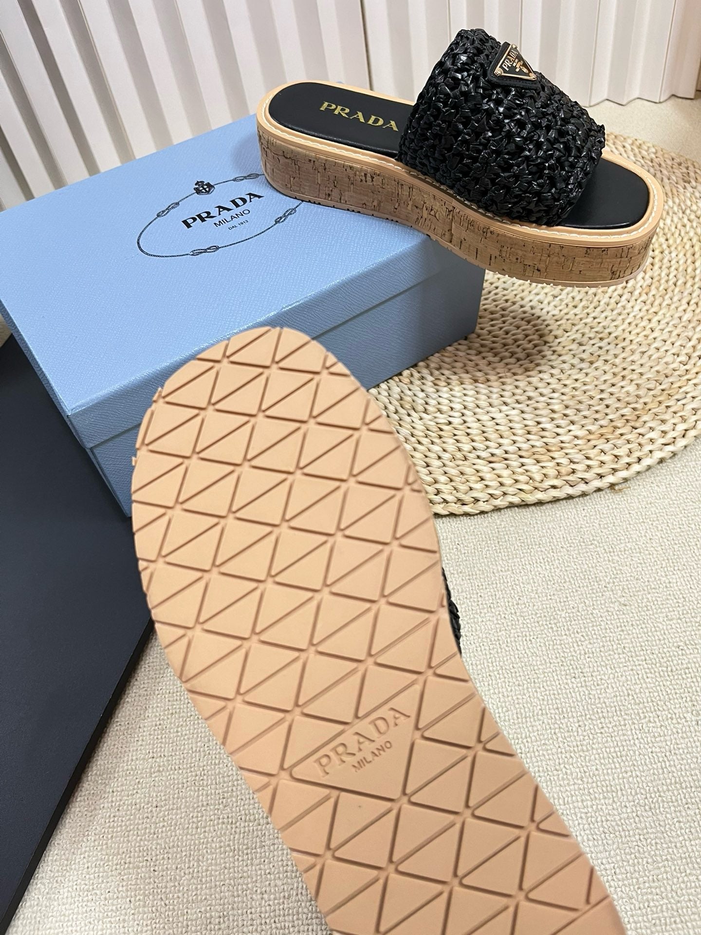 A simple yet sophisticated crochet pattern enhances the design of these flatform sandals decorated with Prada's metal triangle logo that gives the sandal an iconic note.