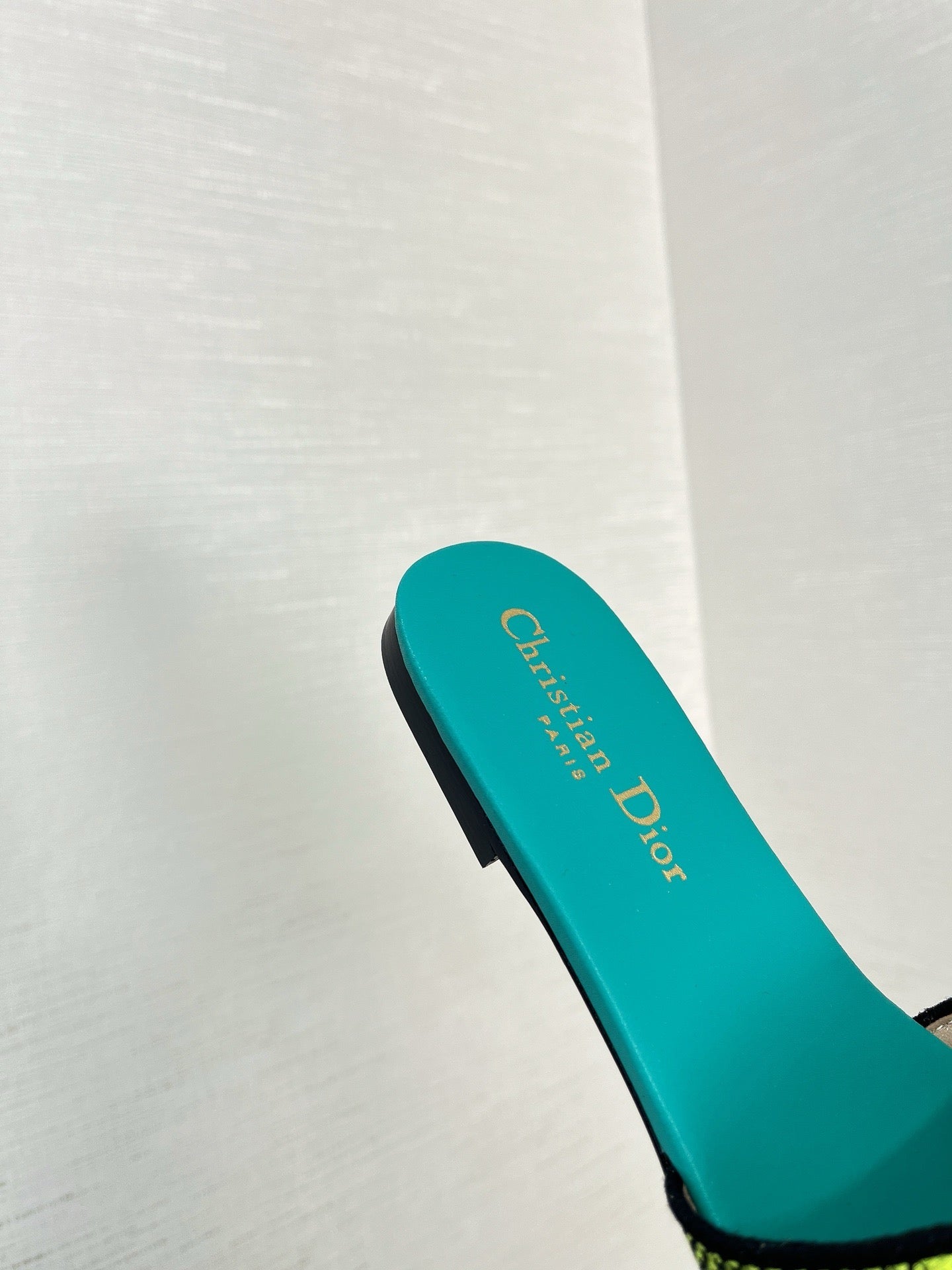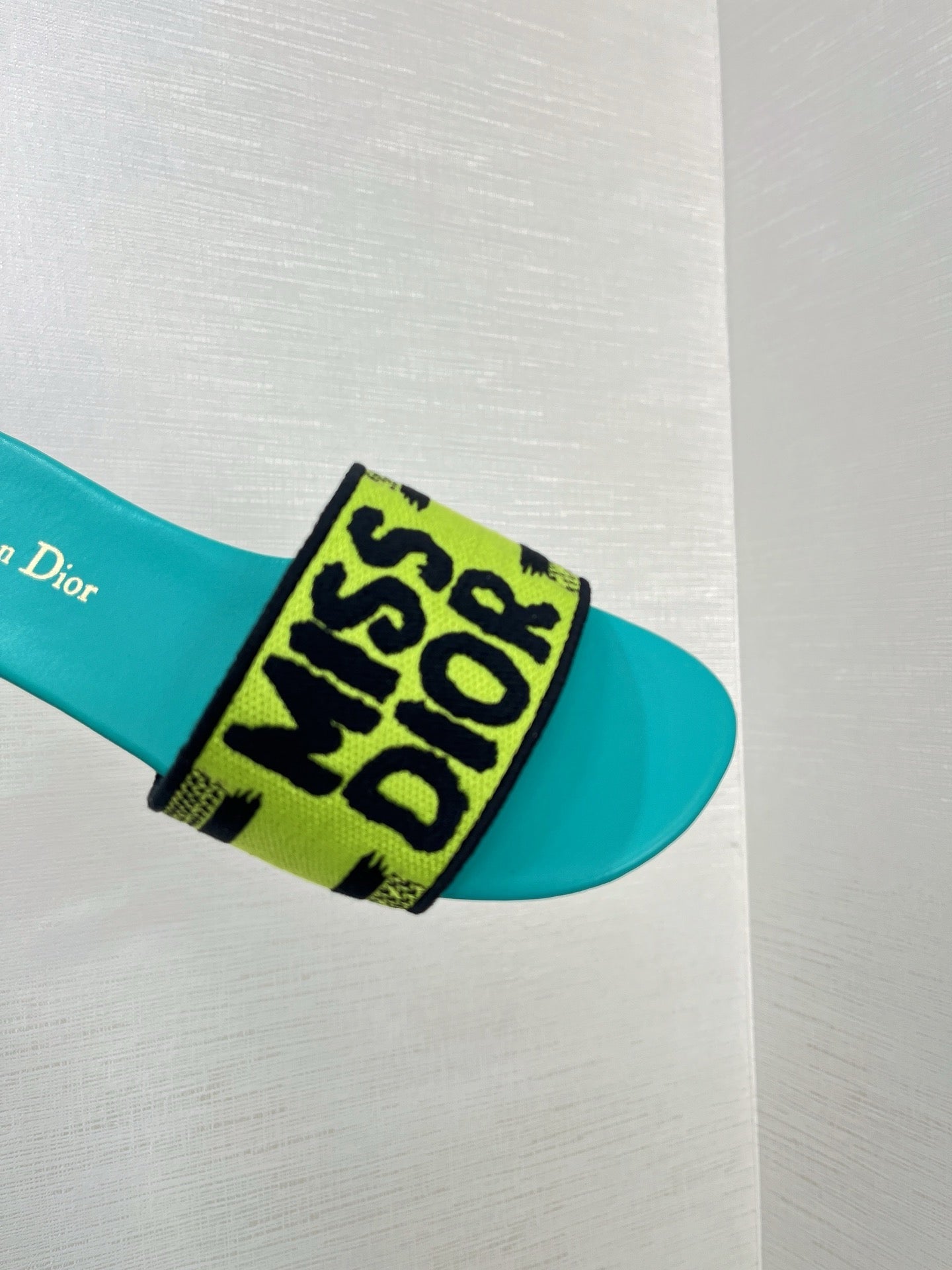 The Dway slide features the black Miss Dior Graffiti motif, a nod to the 1967 debut ready-to-wear collection and a manifesto to Maria Grazia Chiuri's signature celebration of feminism. The lime and black embroidered cotton upper is contrasted with the cobalt green leather insole. The sleek design slips on easily for a laid-back style. The shoe can be paired with other Miss Dior Graffiti creations.