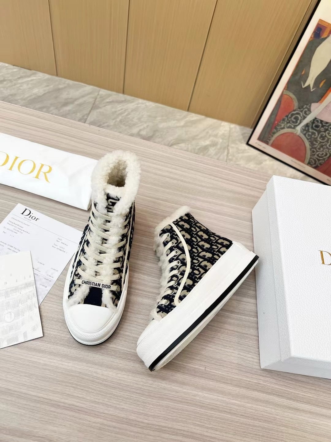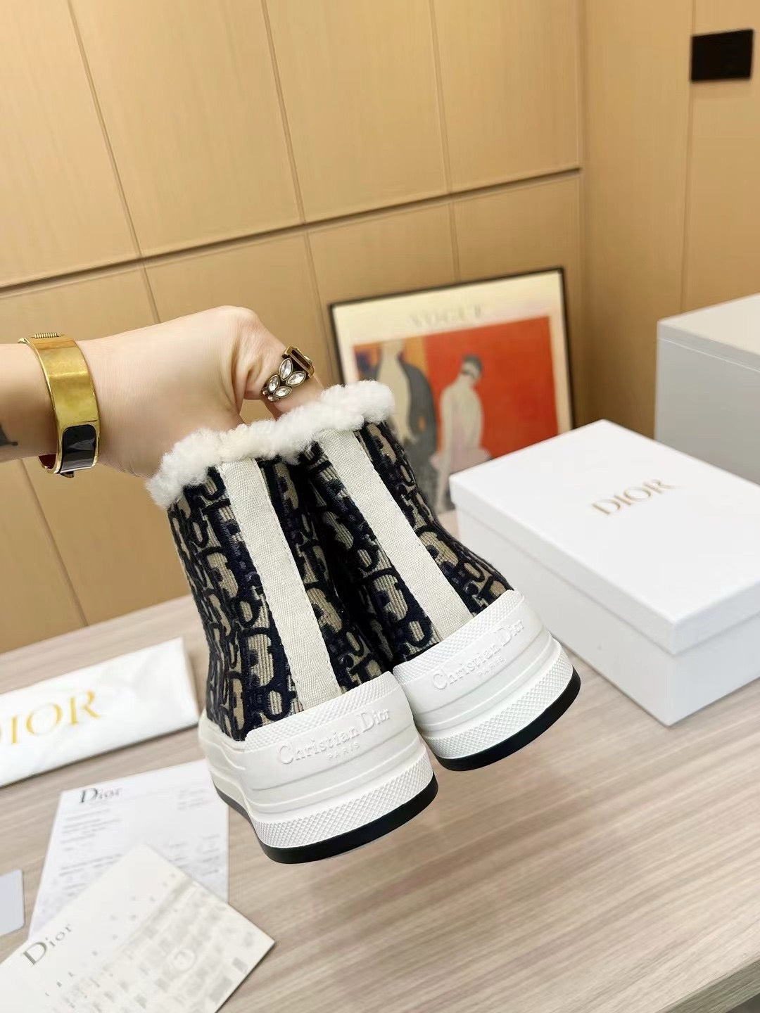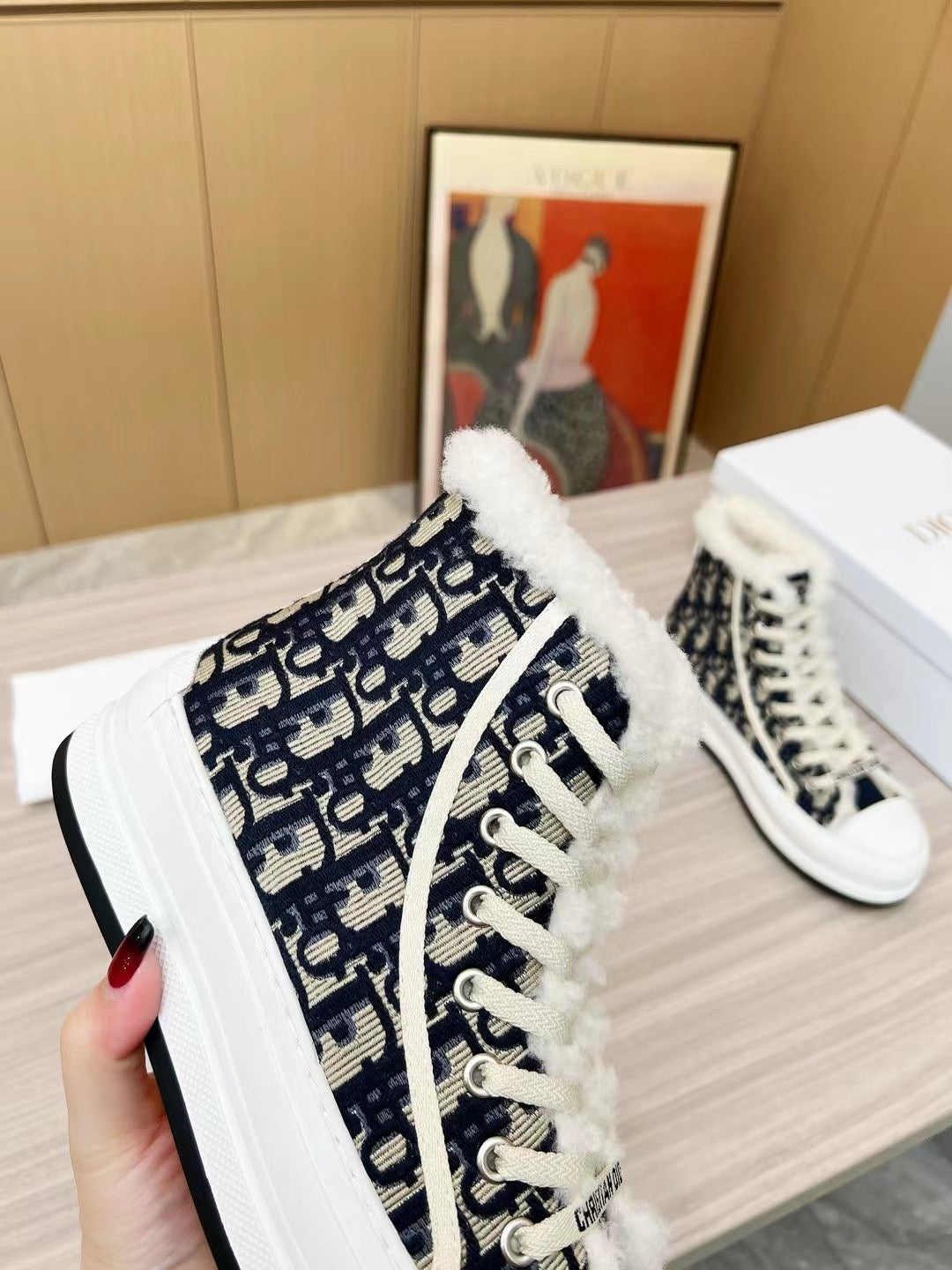 The Walk'n'Dior platform sneaker enhances the line with a modern creation. The deep blue Dior Oblique embroidered cotton upper is enhanced by white shearling lining. The style features a comfortable and lightweight thick sole, tongue and Christian Dior Paris laces. The sneaker will add a contemporary touch to any laid-back look.
