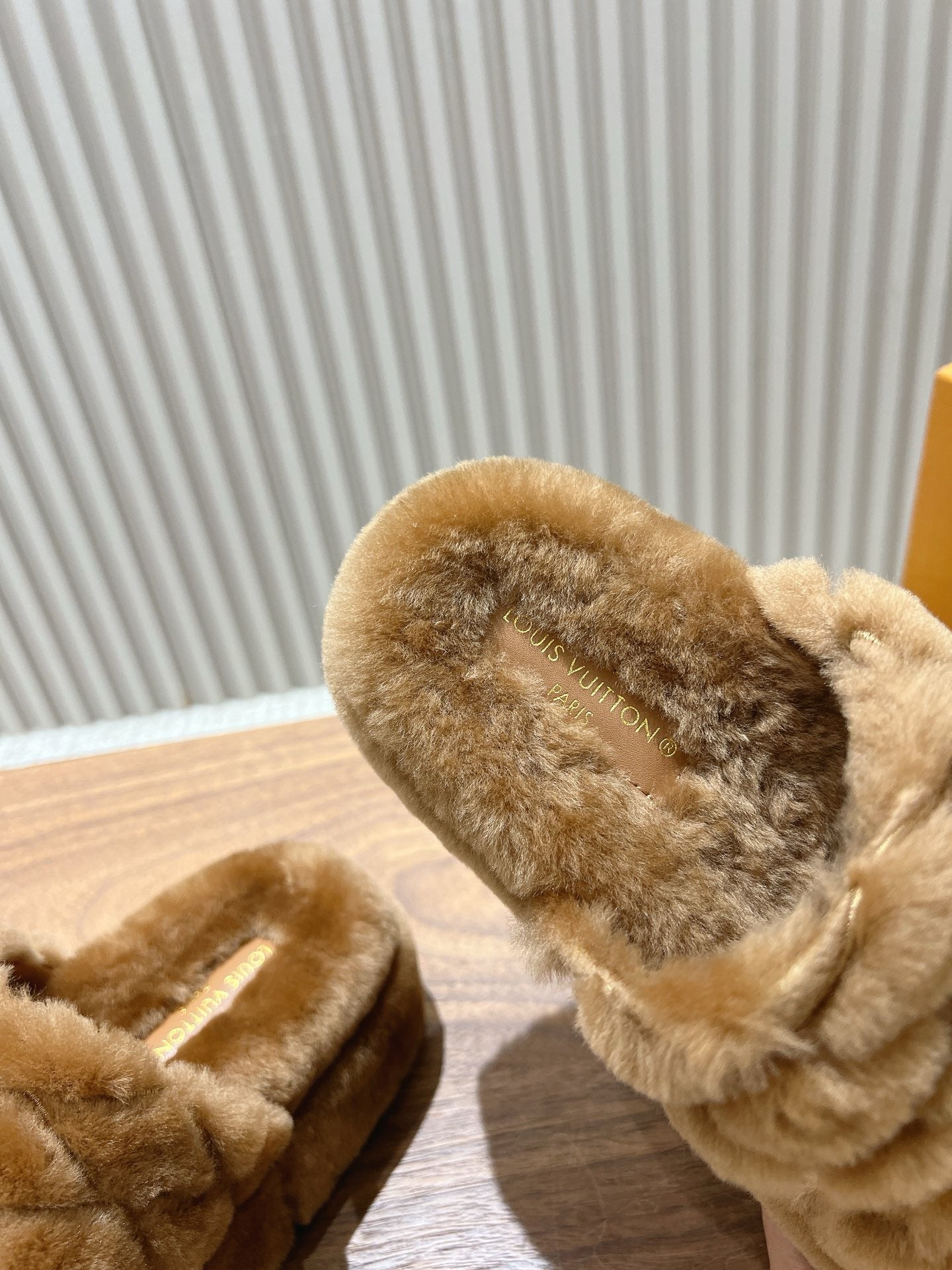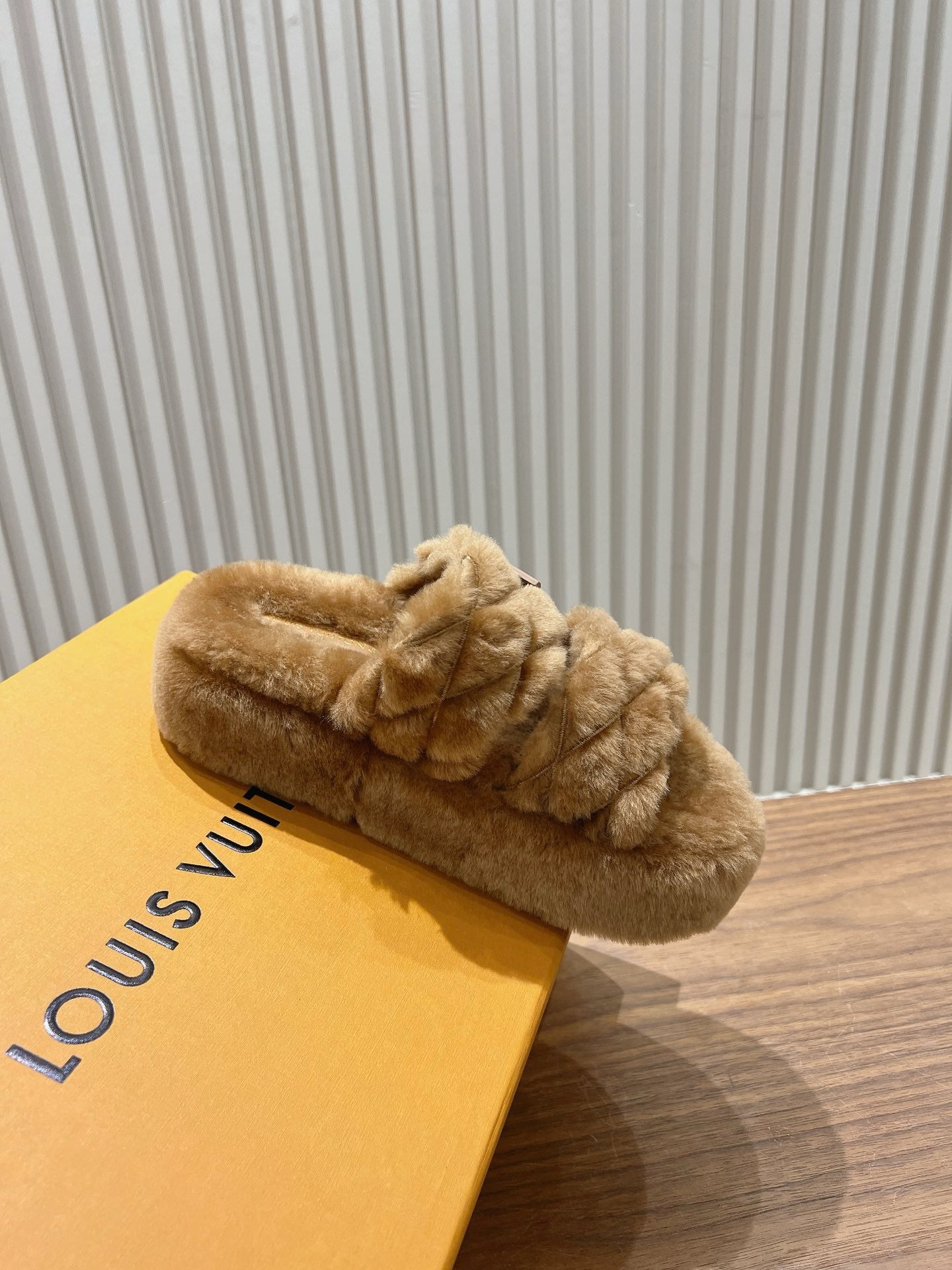 The LV Sunset platform comfort mule is entirely covered in shearling for an irresistibly fluffy appearance and soft feel. In an extra touch of refinement, this model's two wide straps are quilted with the Malletage pattern, inspired by the lining of historic Louis Vuitton trunks. A tonal LV Twist accessory signs this design.