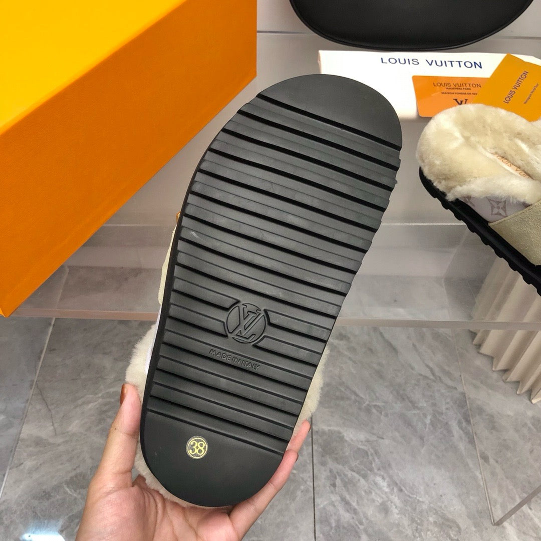 The LV Cosy flat comfort clog lives up to its name in soft Monogram cashgora wool, a material taken from the Women's Ready-to-Wear collection. A shearling-covered insole further enhances this casual-chic style, which comes on a lightweight micro outsole. On the upper, the adjustable strap in suede calf leather is signed with an LV Twist accessory.