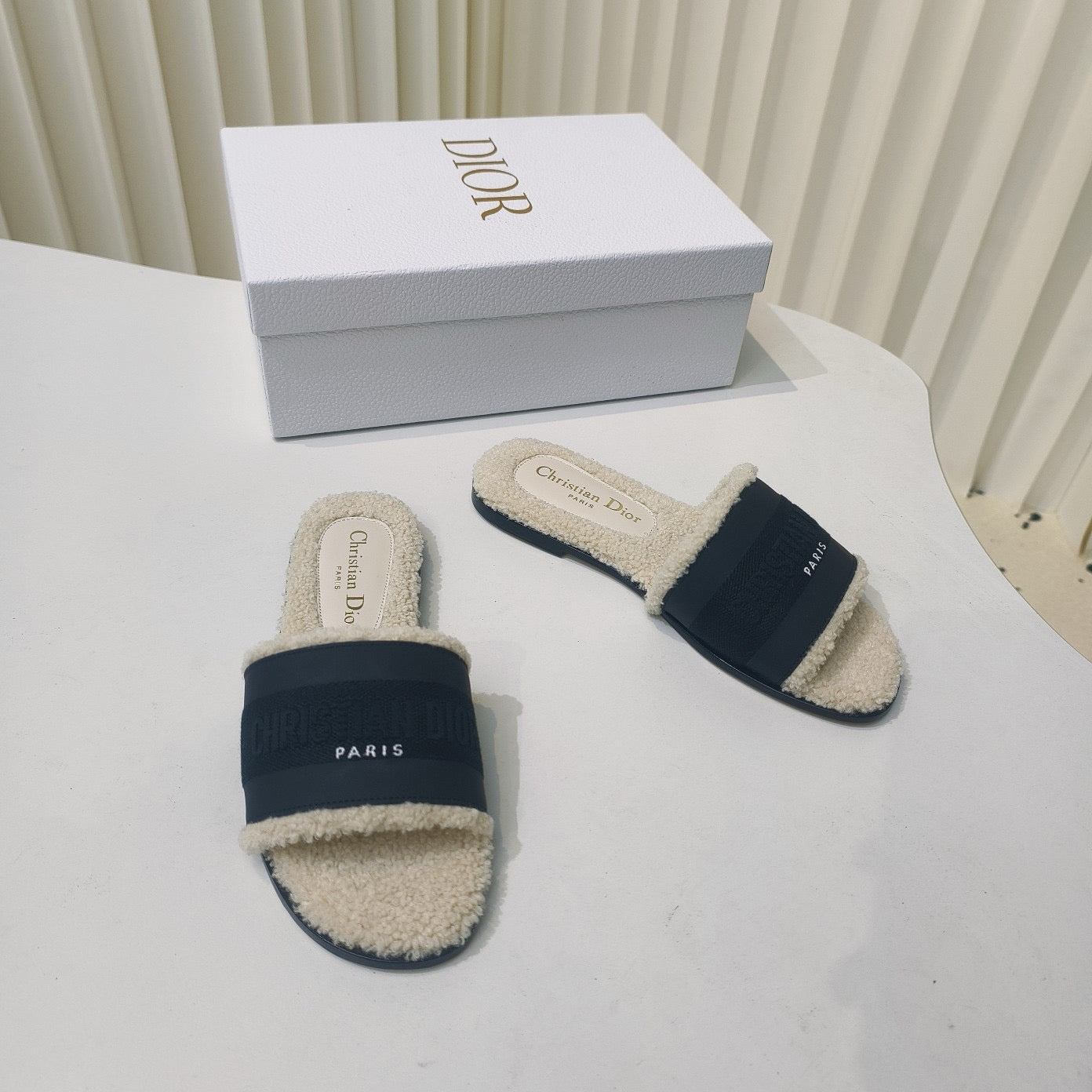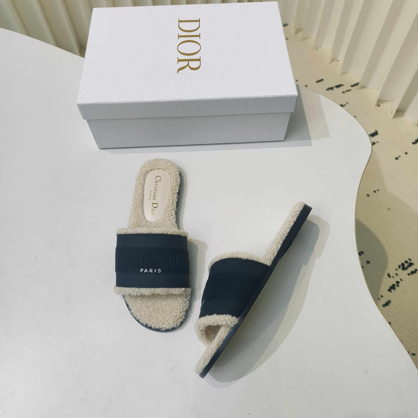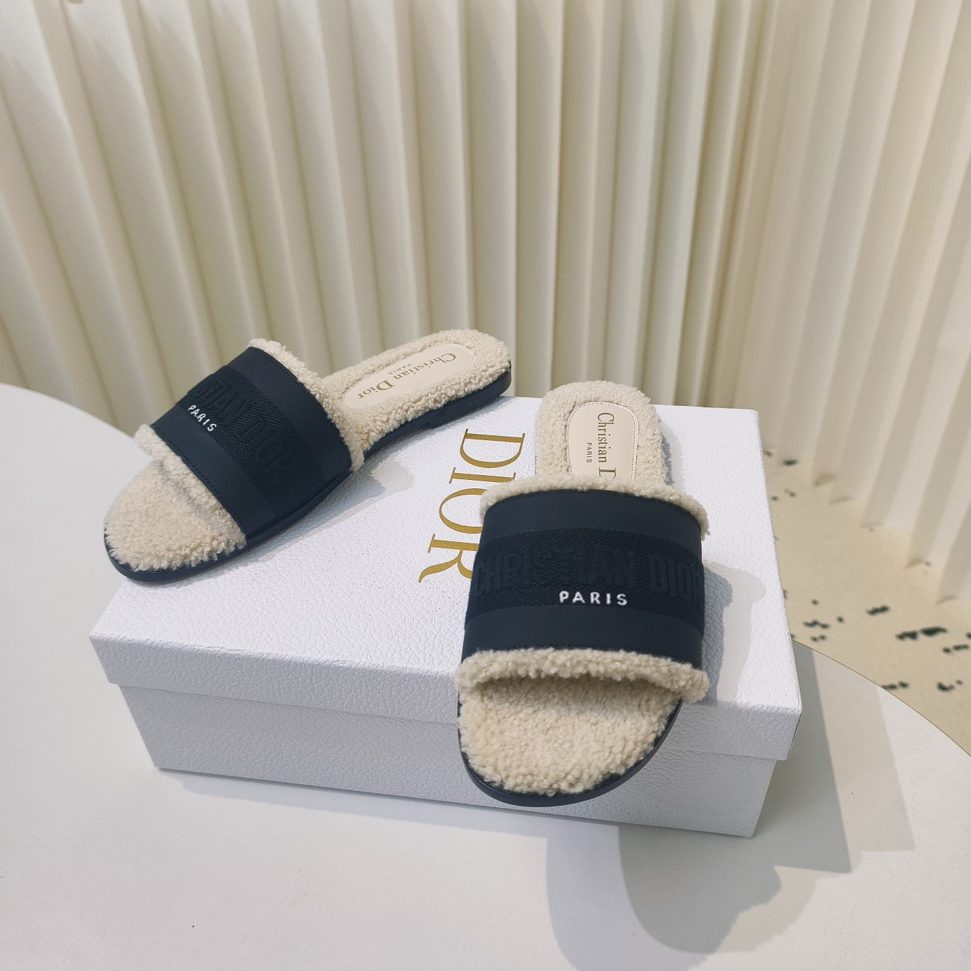 The Dway slide revisits a timeless and emblematic silhouette. The upper in black calfskin and cotton embroidered with the Christian Dior Paris signature instantly stands out. The white sheepskin-effect lining and insole offer ultimate comfort. Its streamlined design allows it to be easily slipped on to complete a laid-back outfit.