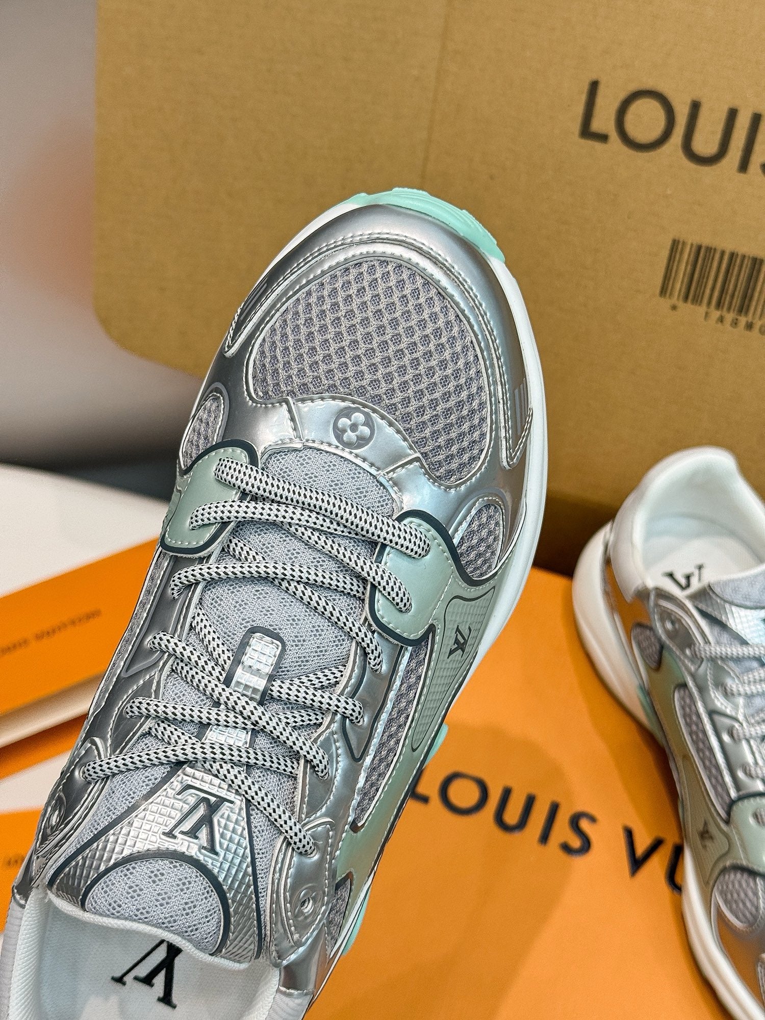The LV Olympia sneaker is a sleek, streamlined design inspired by running shoes. Its upper is crafted from a mix of technical materials, including mesh and metallic synthetic leather, while its lightweight EVA outsole is engineered for optimum bounce and comfort. This model is notable for its rich detailing, including an embossed Monogram pattern and the LV Initials.