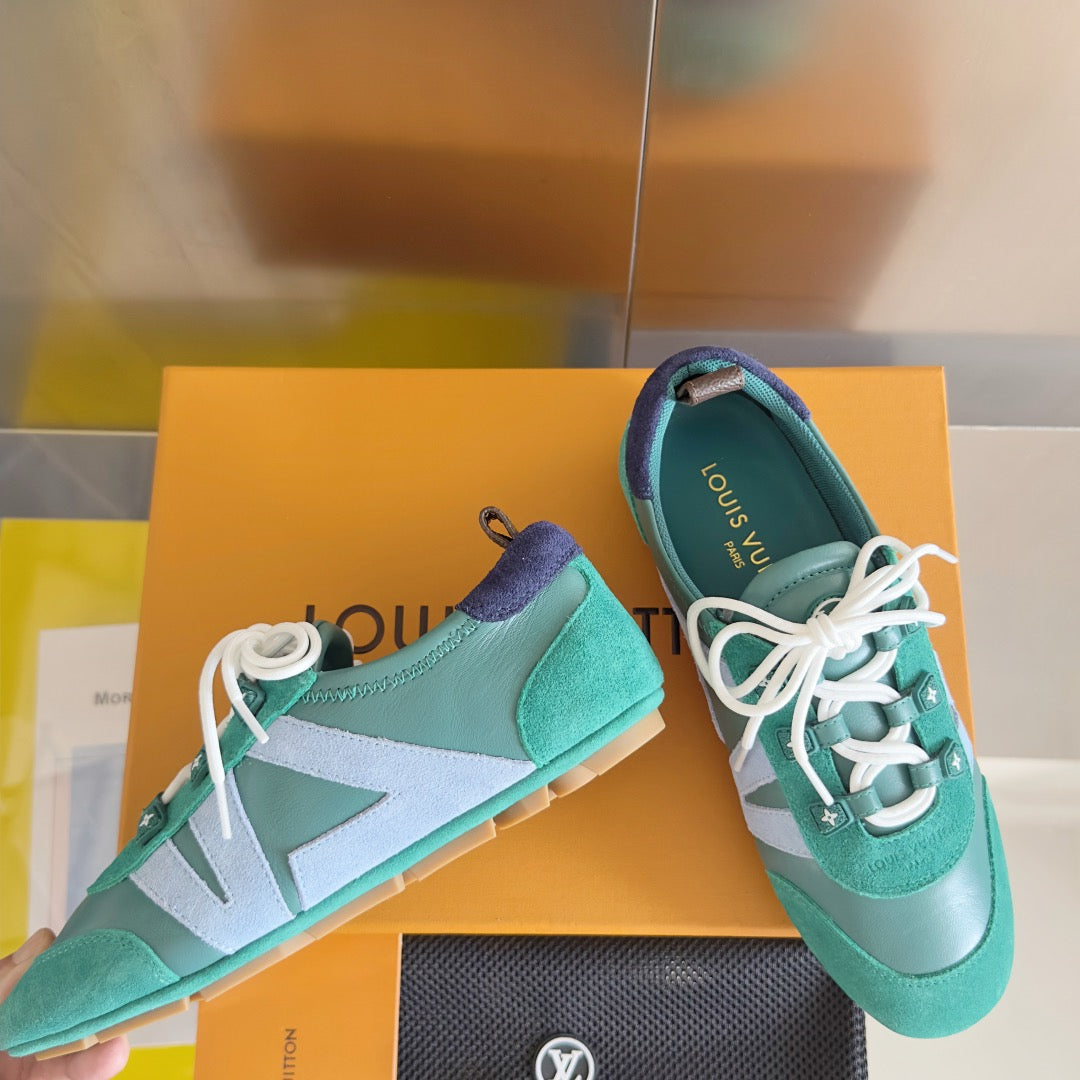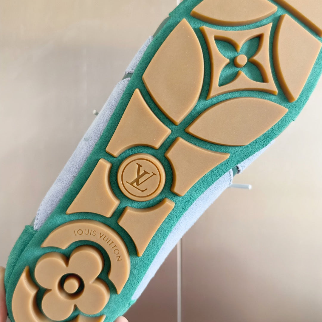 The LV Sneakerina is a fashion-forward style combining the qualities of a sneaker and a ballerina. This version comes in metallic grained calf leather with contrasting trim, including an LV signature on the side. Stylish and versatile, this model features a sacchetto construction, a testament to Louis Vuitton craftsmanship, and TPU outsole for lightness and suppleness. If you are in-between sizes, order one size down.