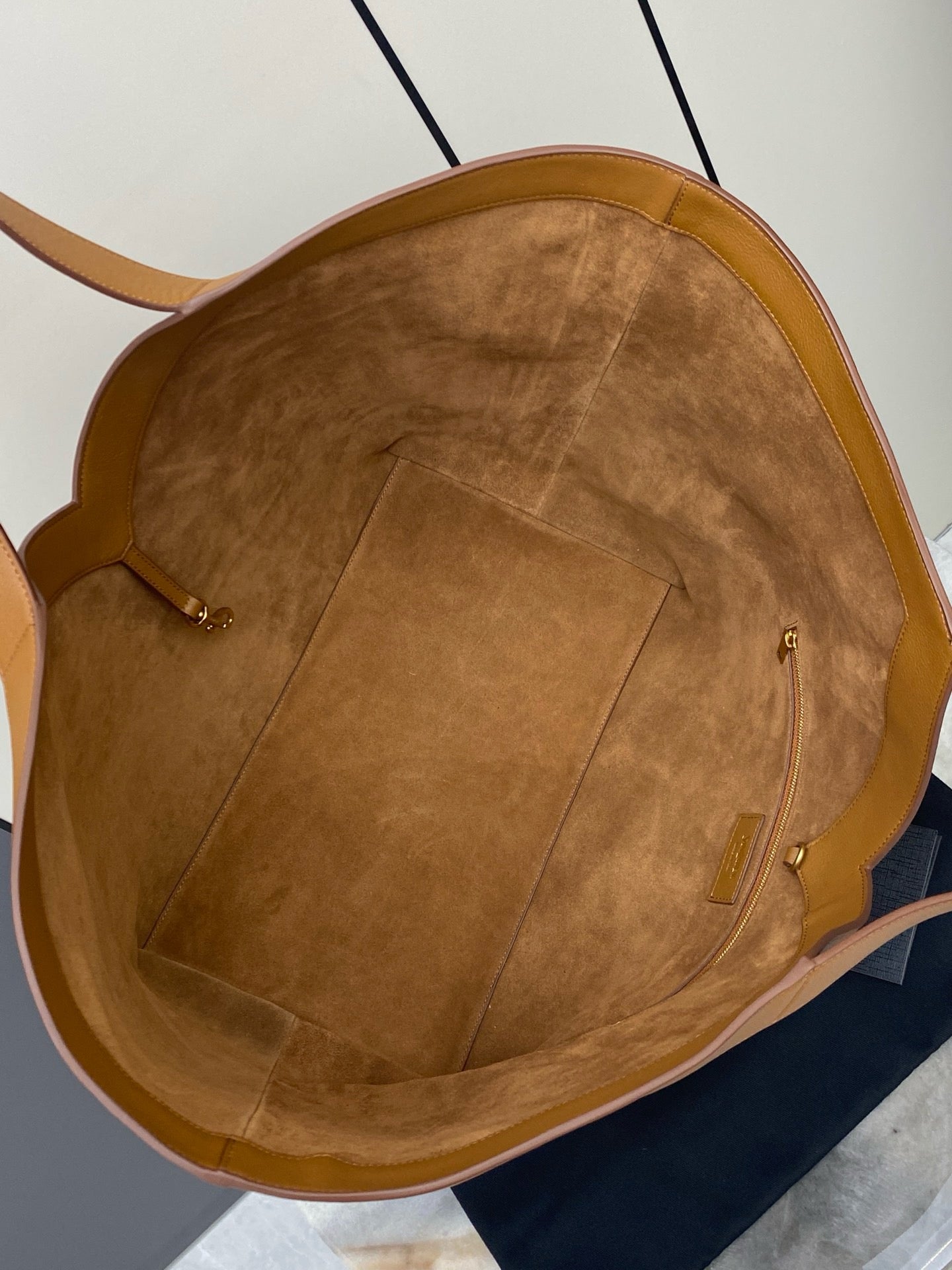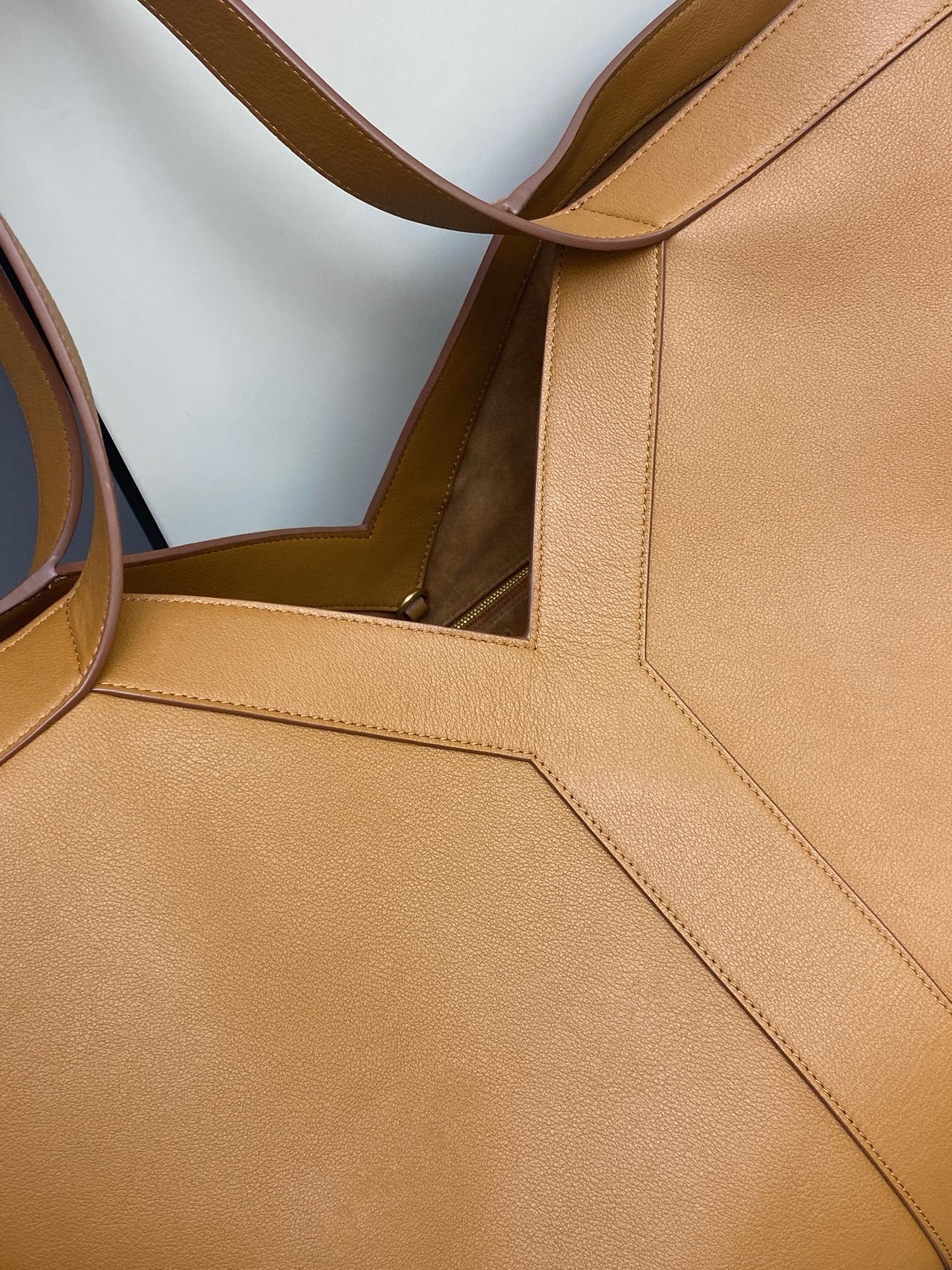 TOTE IN FINELY GRAINED LEATHER, fully LINED IN TONAL SUEDE.