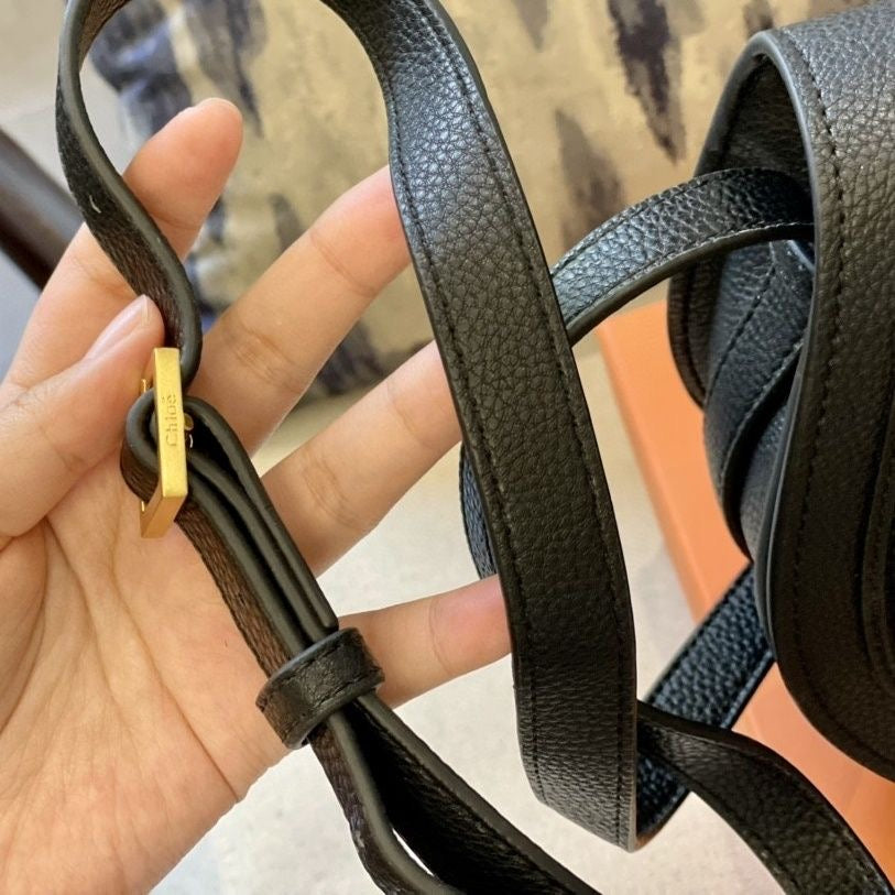 - 1 roomy compartment - 1 front slip pocket - Internal flat card pocket - Adjustable leather strap thanks to square buckle - Antique gold finishing - Cotton lining Comes with a dust bag