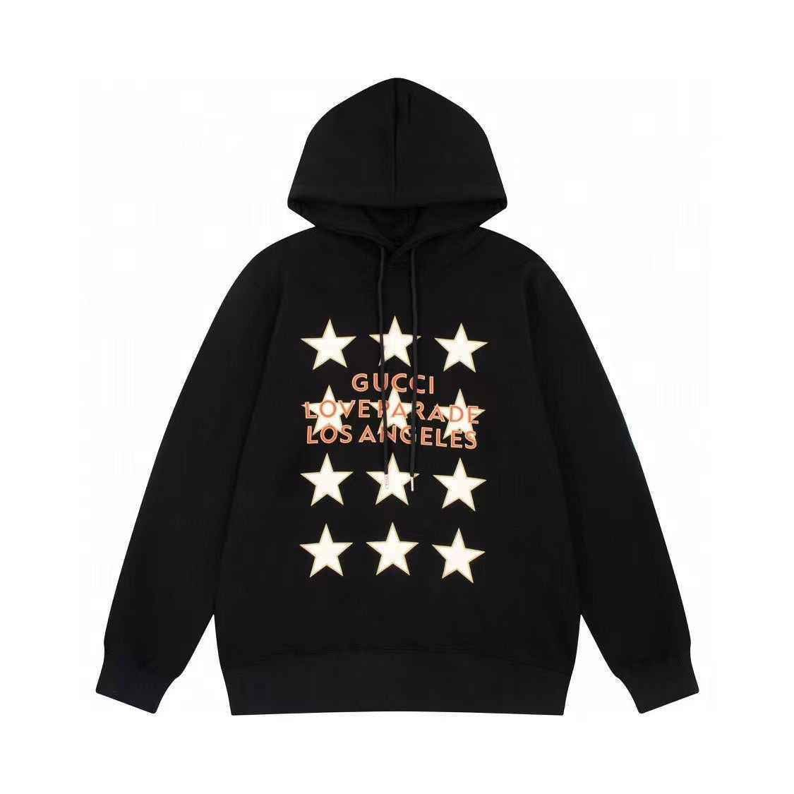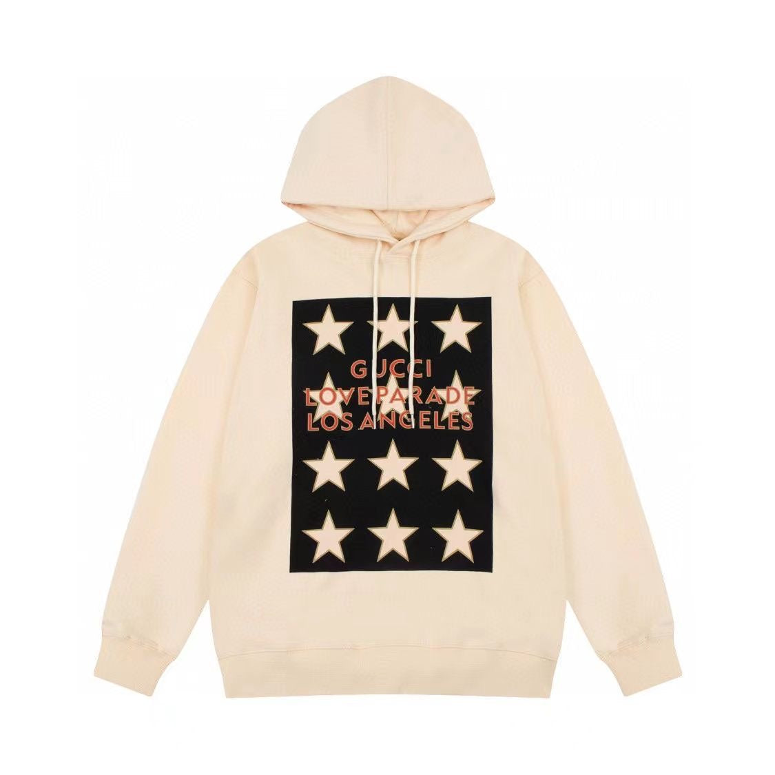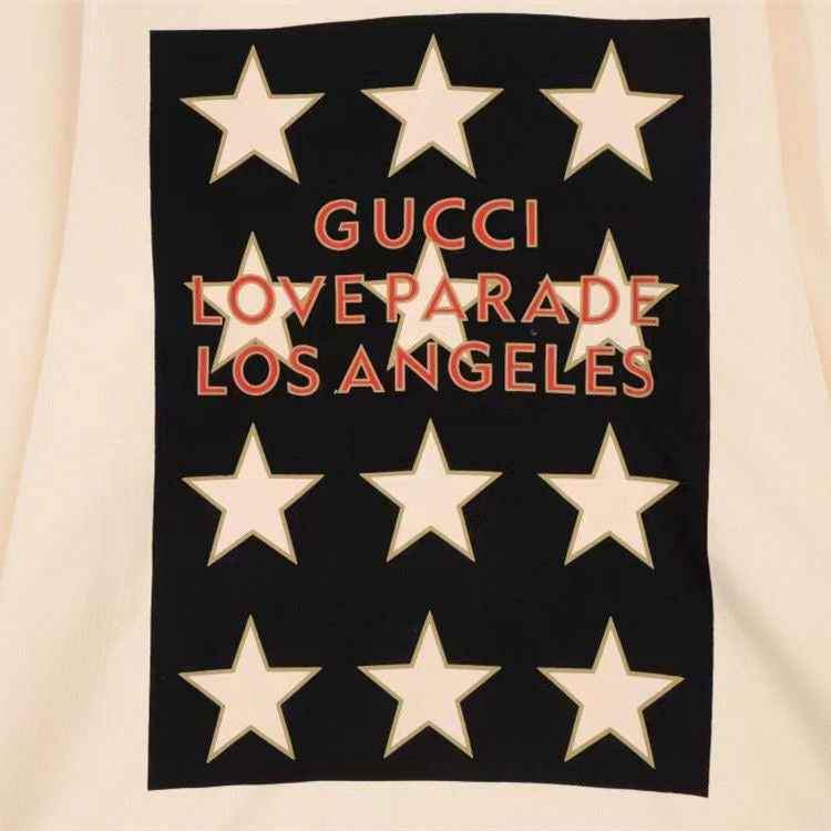 Paying homage to the city that created a fascination with the movie industry, Gucci Love Parade is a collection inspired by Hollywood's glamour and pop culture—mixing old Hollywood with new Hollywood. This sweatshirt depicts the print 'Gucci Love Parade Los Angeles' with stars. The layering of different styles shows the eclectic nature of the House, where the past seamlessly blends with the present.