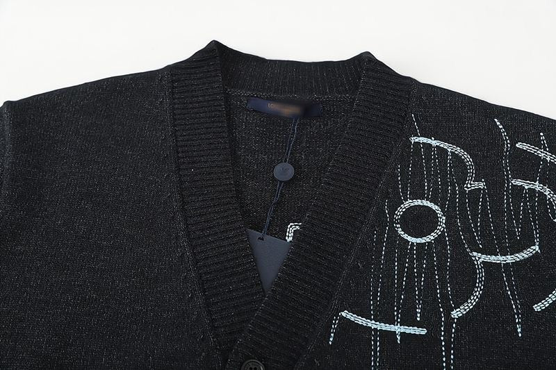 This cozy V-neck cardigan in Responsibly Sourced Mohair is elevated with LV Frequency motifs embroidered in contrasting wool on the front, back and sleeves. Chunky ribbing and two patch pockets complete this original piece.