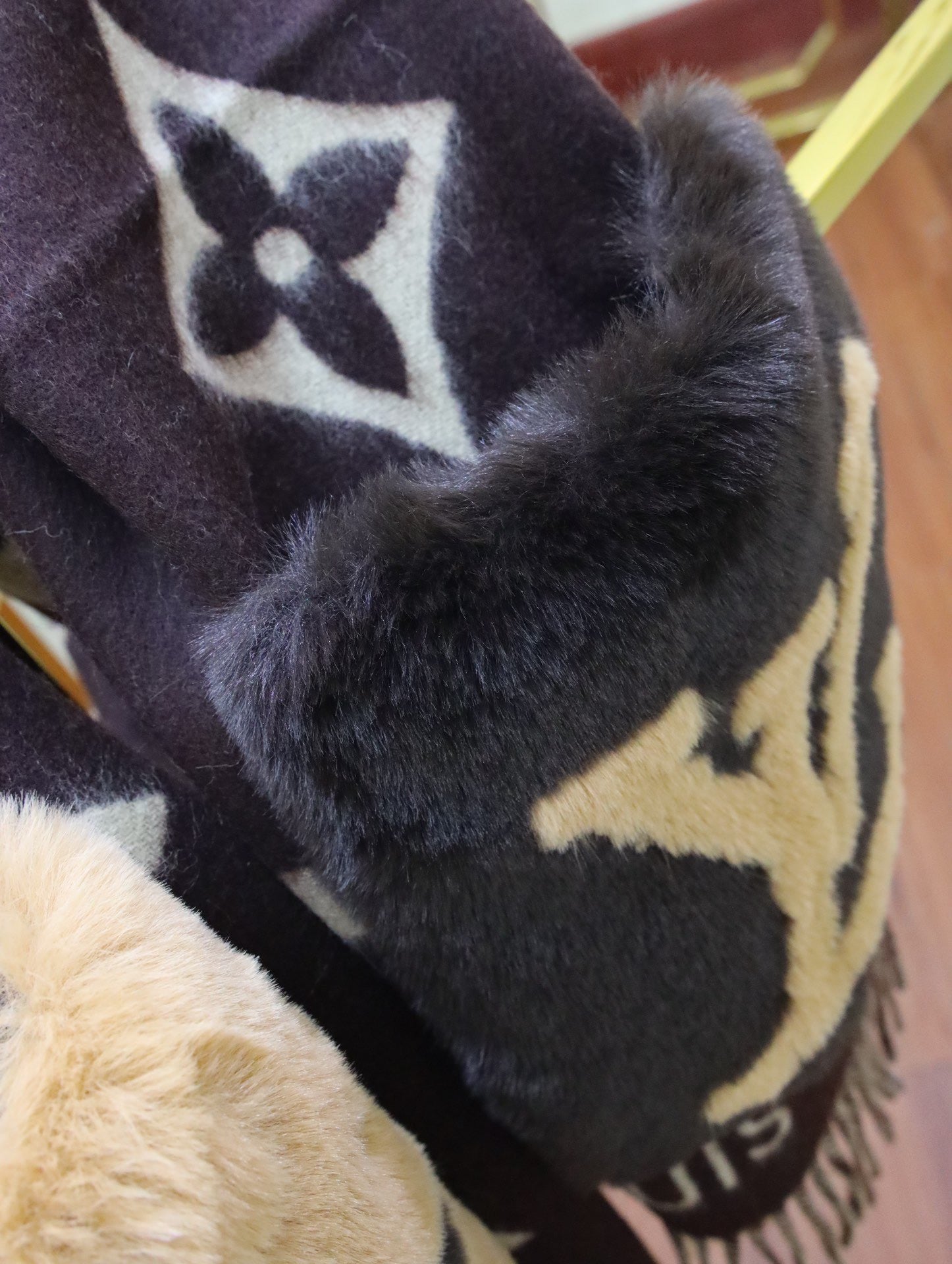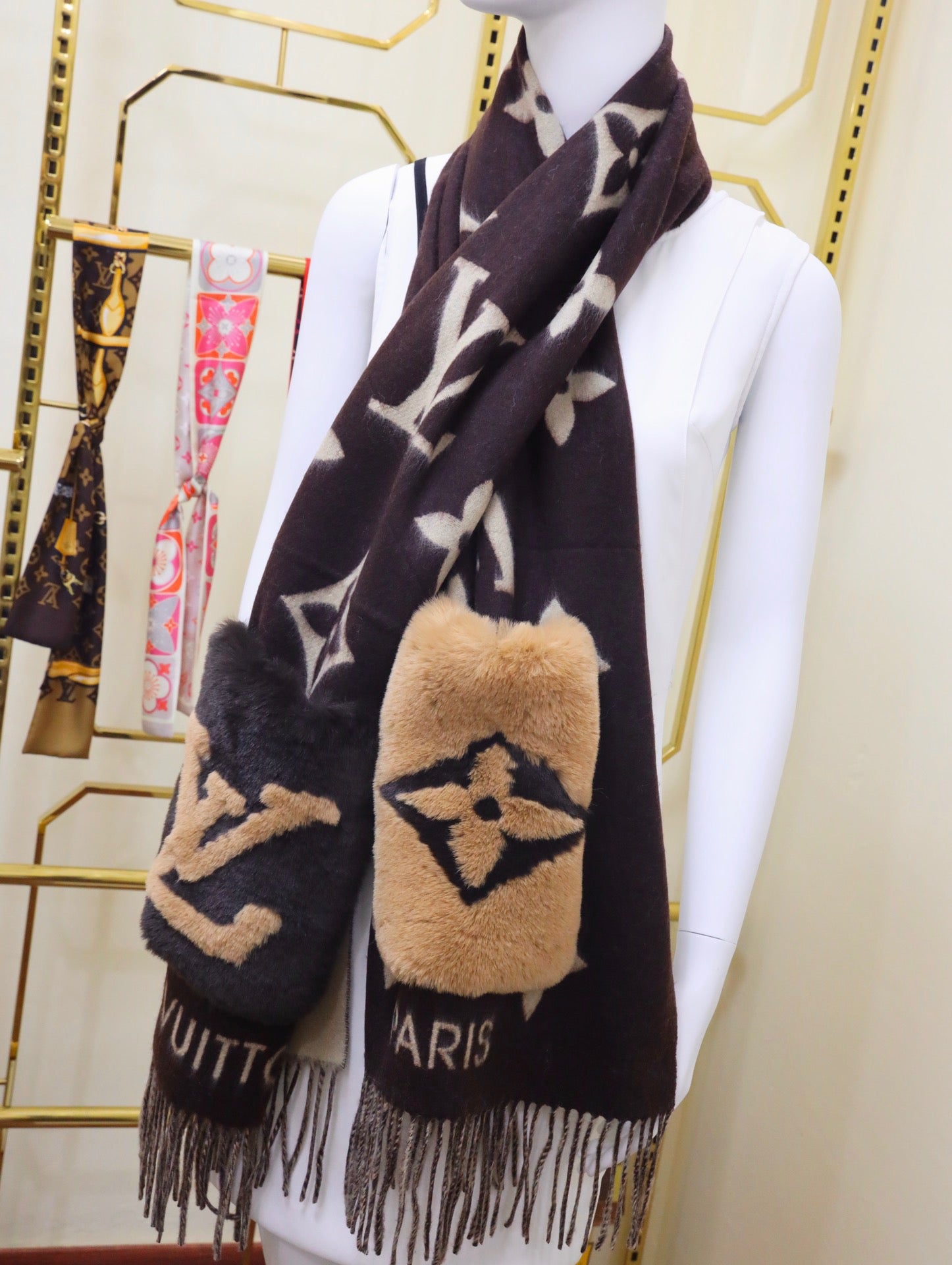 The Louis Vuitton Cold Reykjavik scarf is an iconic winter accessory. This new animation of the classic piece is elevated further by mink fur pockets on the plush cashmere base featuring a Monogram inlay. Long fringes frame the large-scale LV Initials and Monogram Flowers pattern.