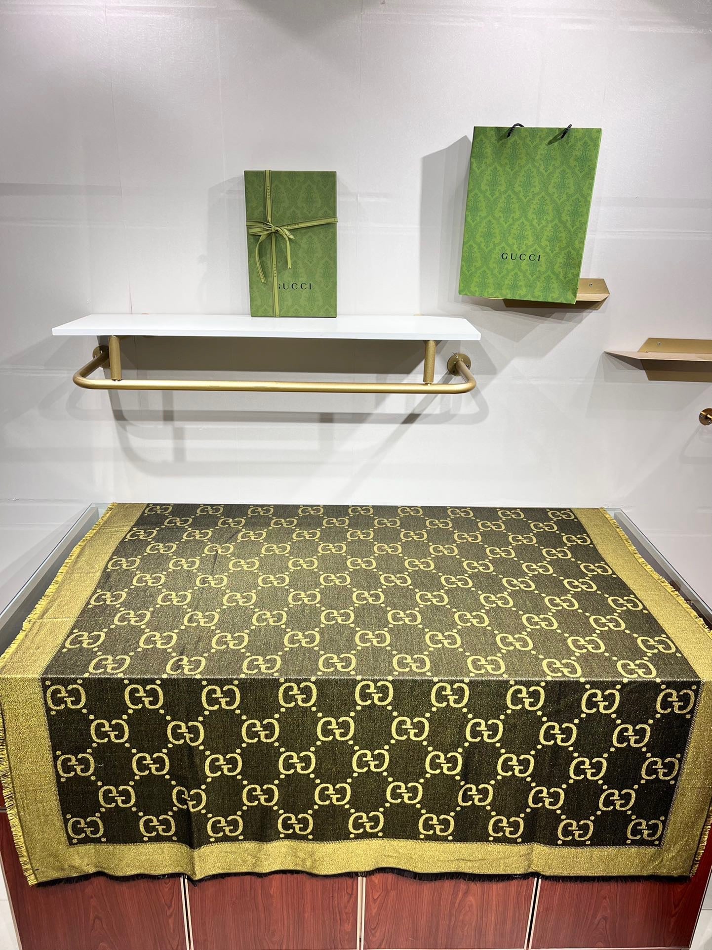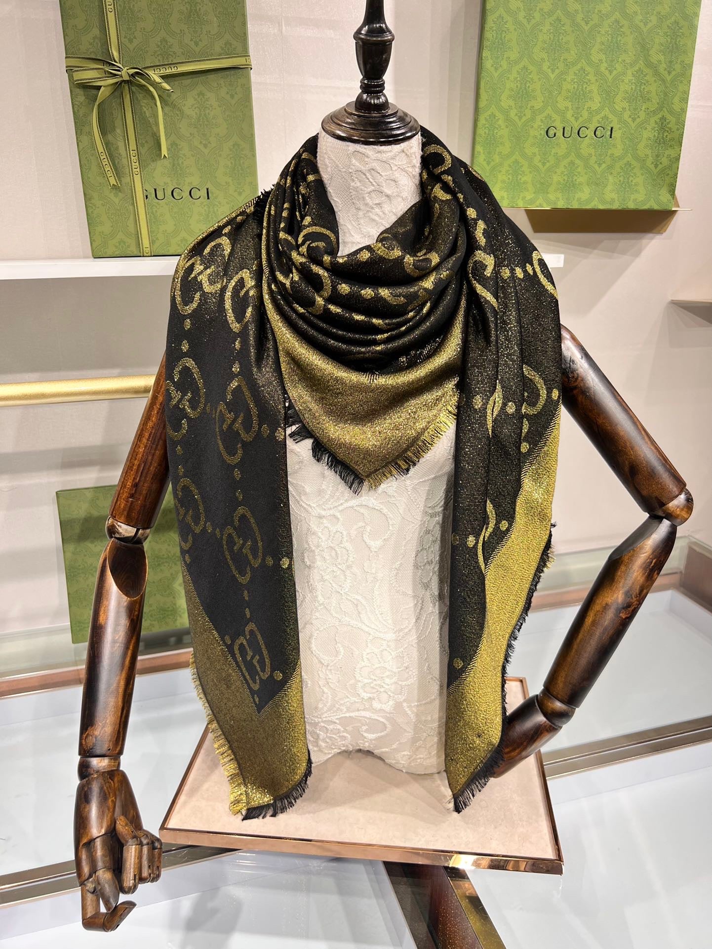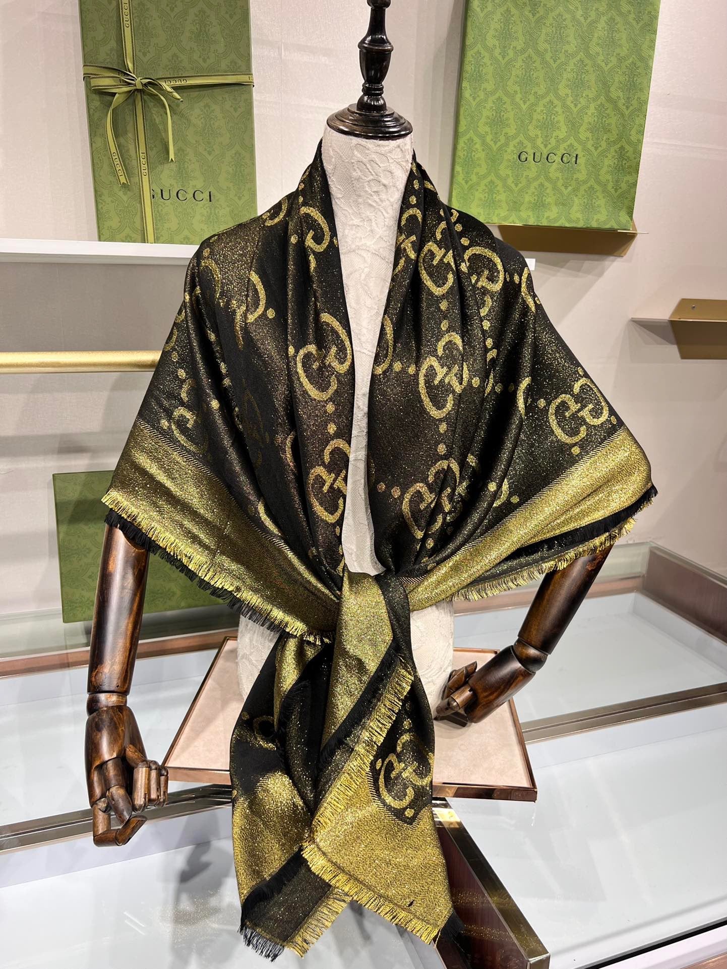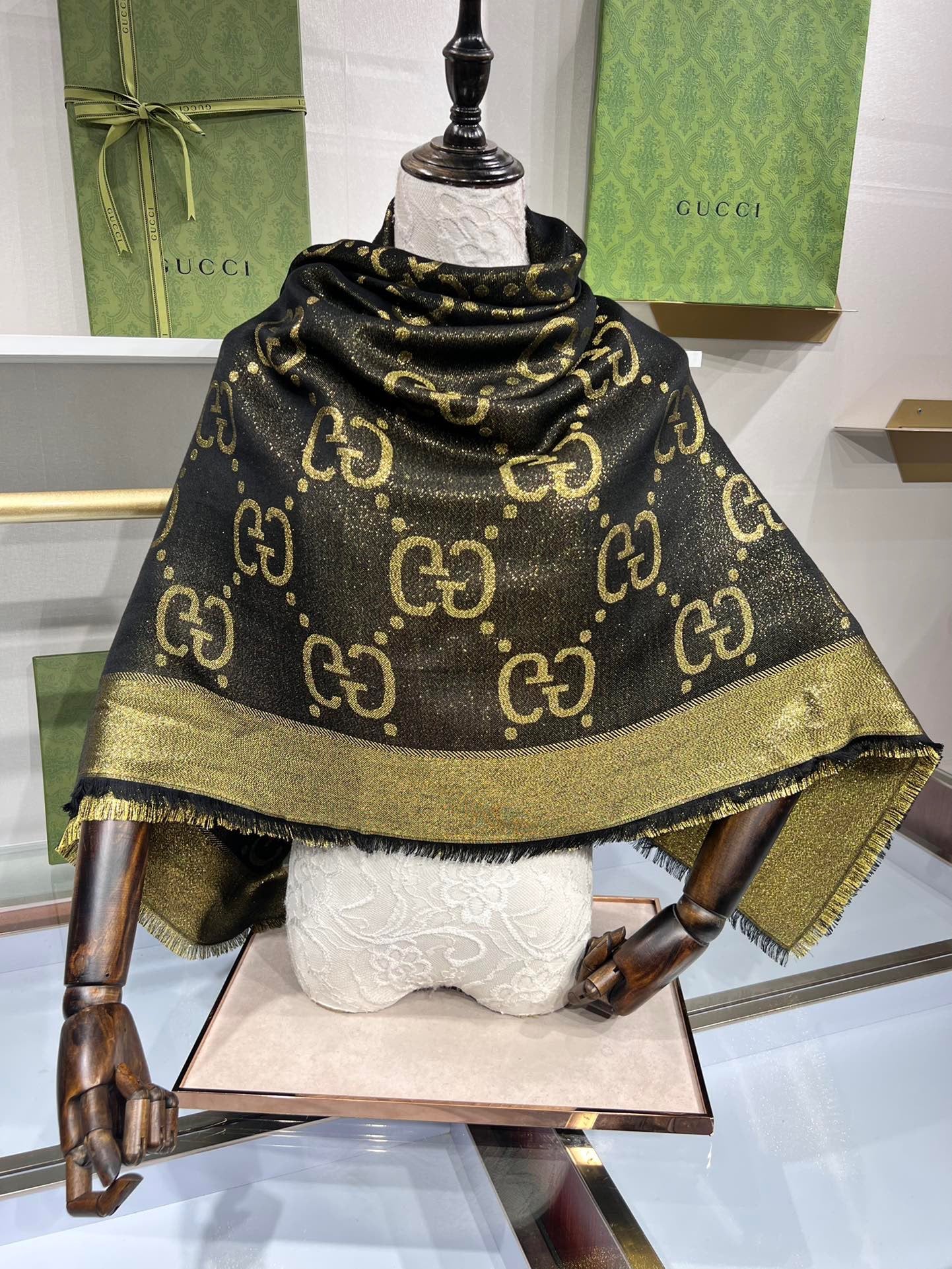 Staple accessories come to life with archival Gucci motifs, resulting in a series of logo-defined pieces. The emblematic GG appears here with a metallic glimmer, contributing a contemporary touch to this gold and black wool jacquard shawl.