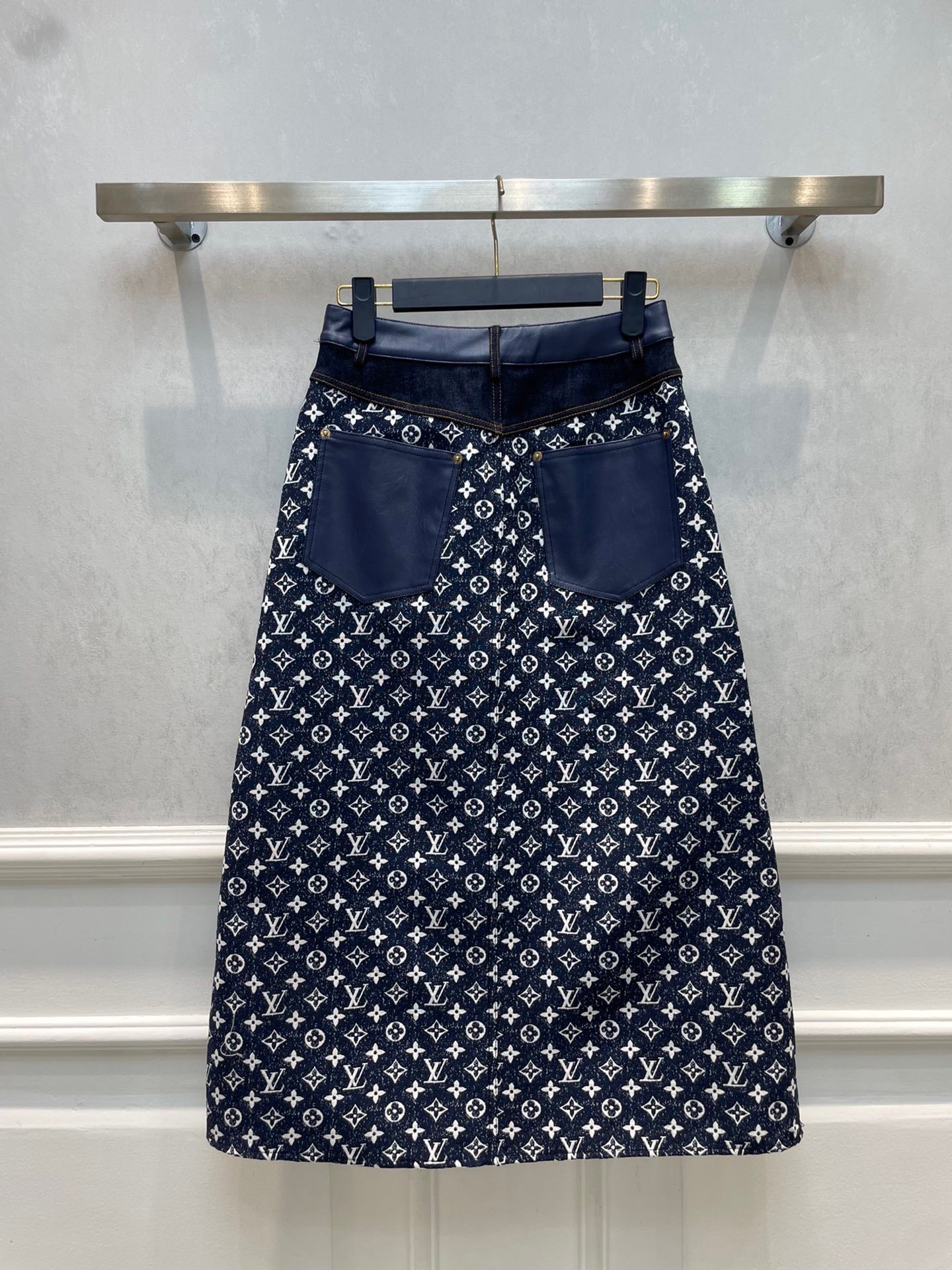 This season’s Monogram jacquard denim refreshes this chic midi skirt with a graphic allover signature. The silhouette is clean and casual in an A-line shape finished with a slit at the front. The waistband and back pockets strike a subtle contrast in tonal leather, while contrasting yellow topstitching completes the look with a nod to vintage styles.