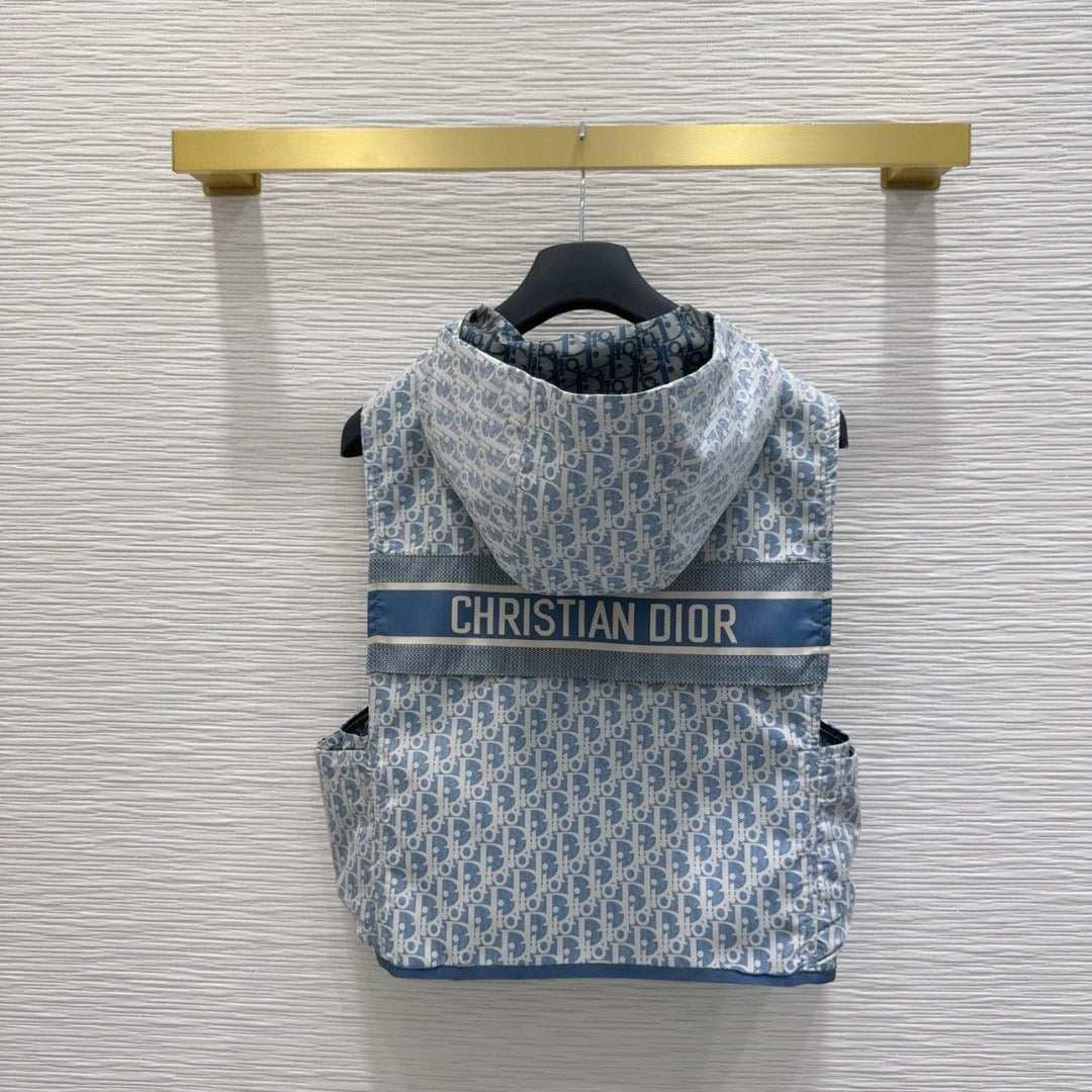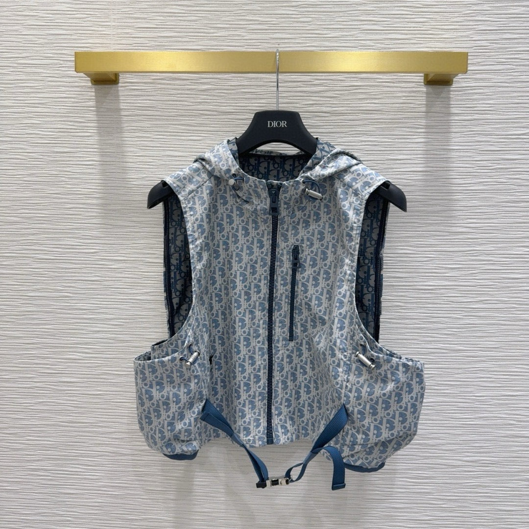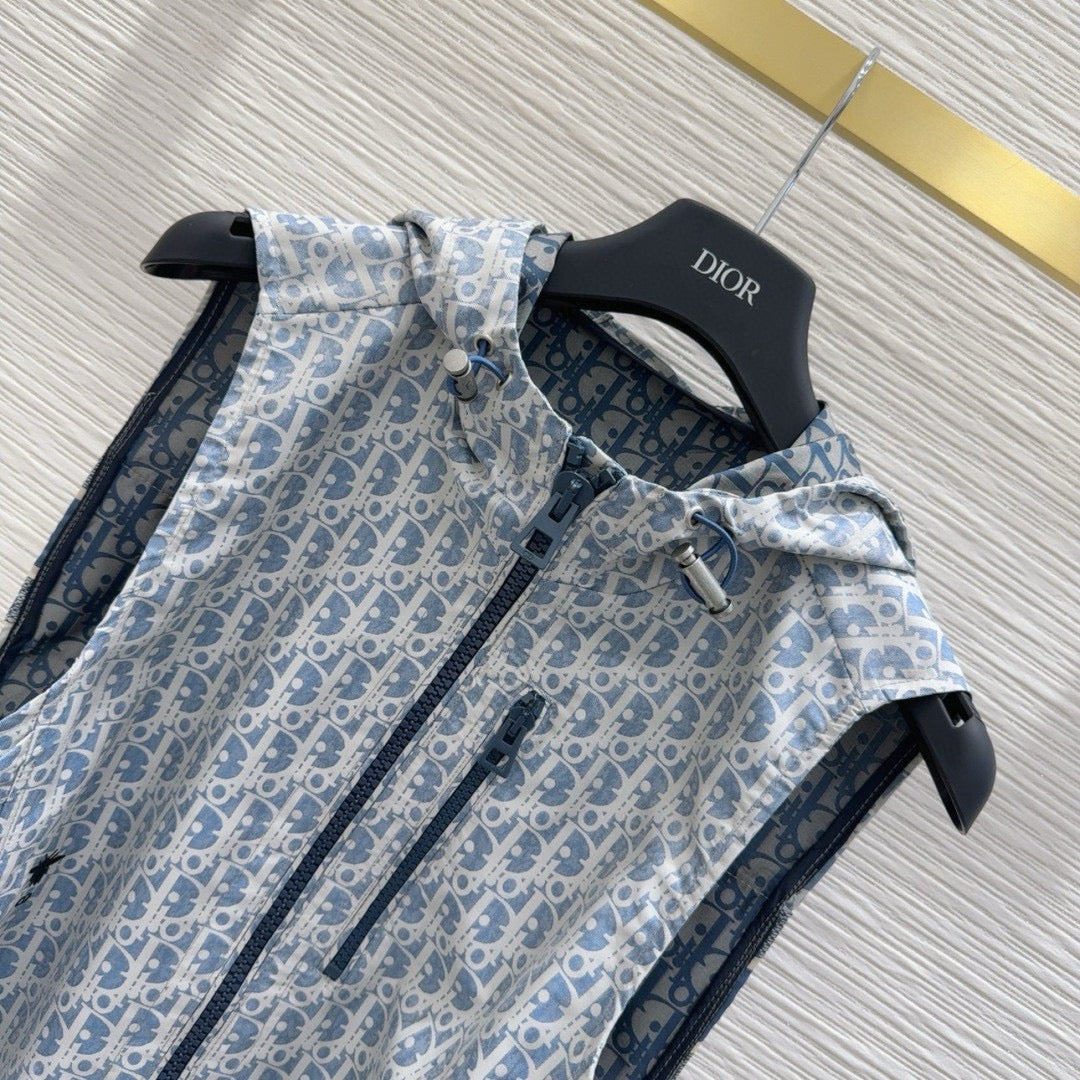 Part of the Dioriviera capsule, the vest showcases the blue and white Dior Oblique motif, a Dior symbol since its debut in 1969. Crafted in jacquard technical taffeta, it is enhanced by a contrasting Christian Dior signature band on the back. The hooded vest can be worn with other Dioriviera creations to complete the look.