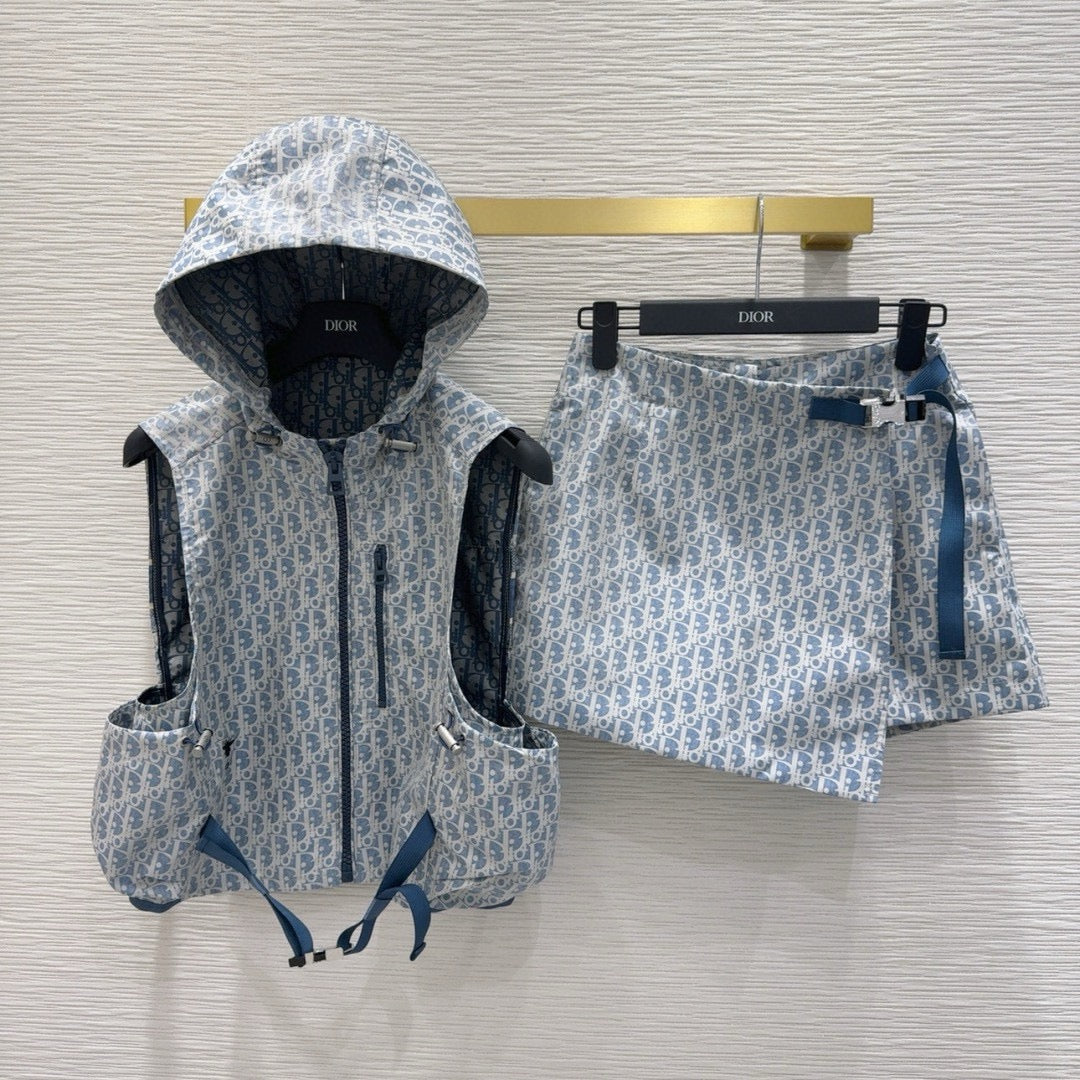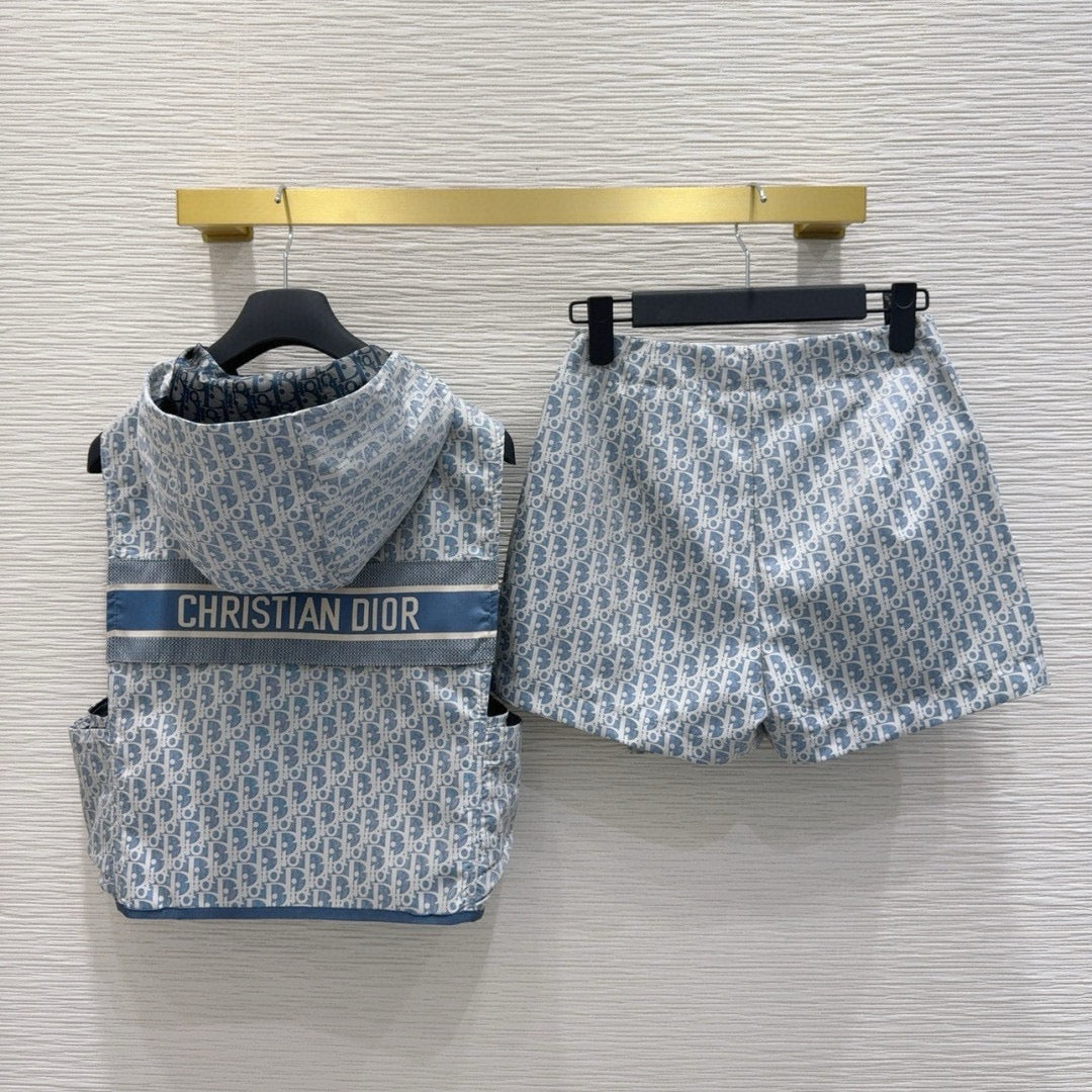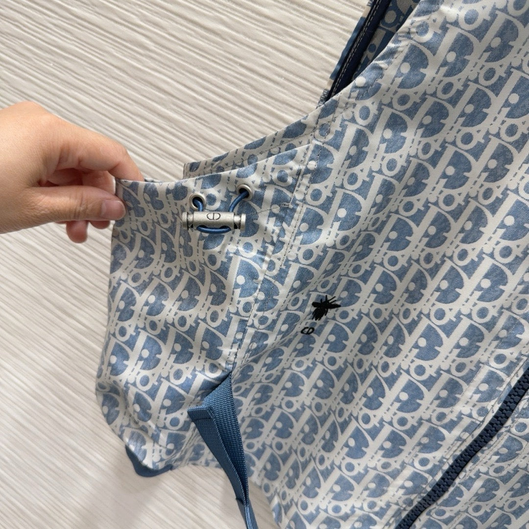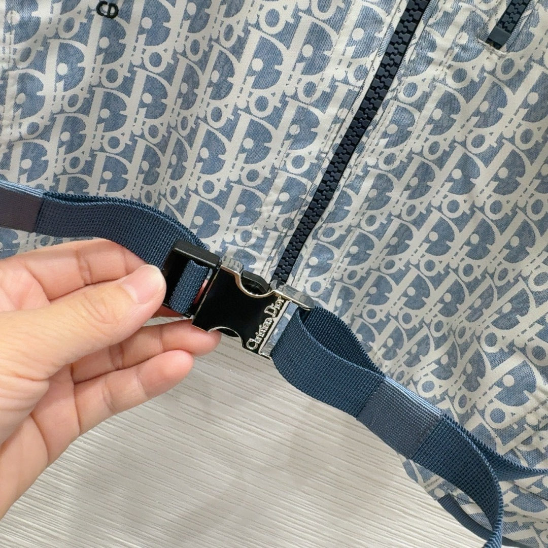 Part of the Dioriviera capsule, the vest showcases the blue and white Dior Oblique motif, a Dior symbol since its debut in 1969. Crafted in jacquard technical taffeta, it is enhanced by a contrasting Christian Dior signature band on the back. The hooded vest can be worn with other Dioriviera creations to complete the look.