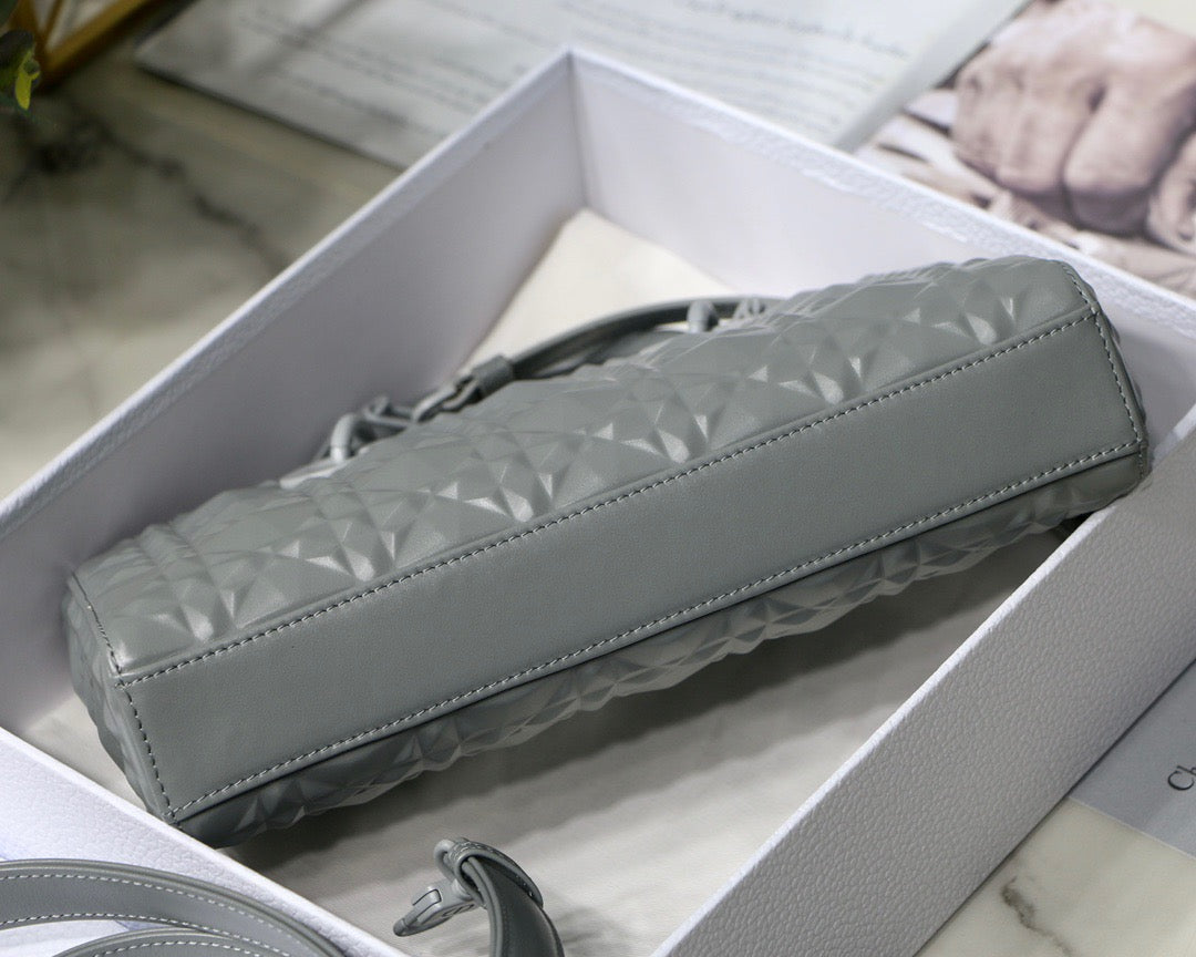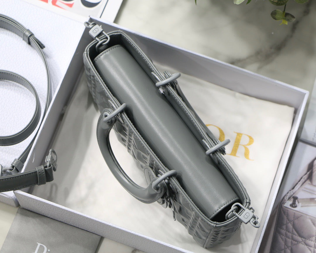 Design: The Lady D-Joy bag captures the House's vision of elegance and beauty by showcasing the iconic streamlined aesthetic of the Lady Dior line. Crafted in Cannage calfskin featuring a black Diamond motif, the refined and timeless style is enhanced by tonal matte metal 'D.I.O.R.' charms elegantly embellishing its silhouette;