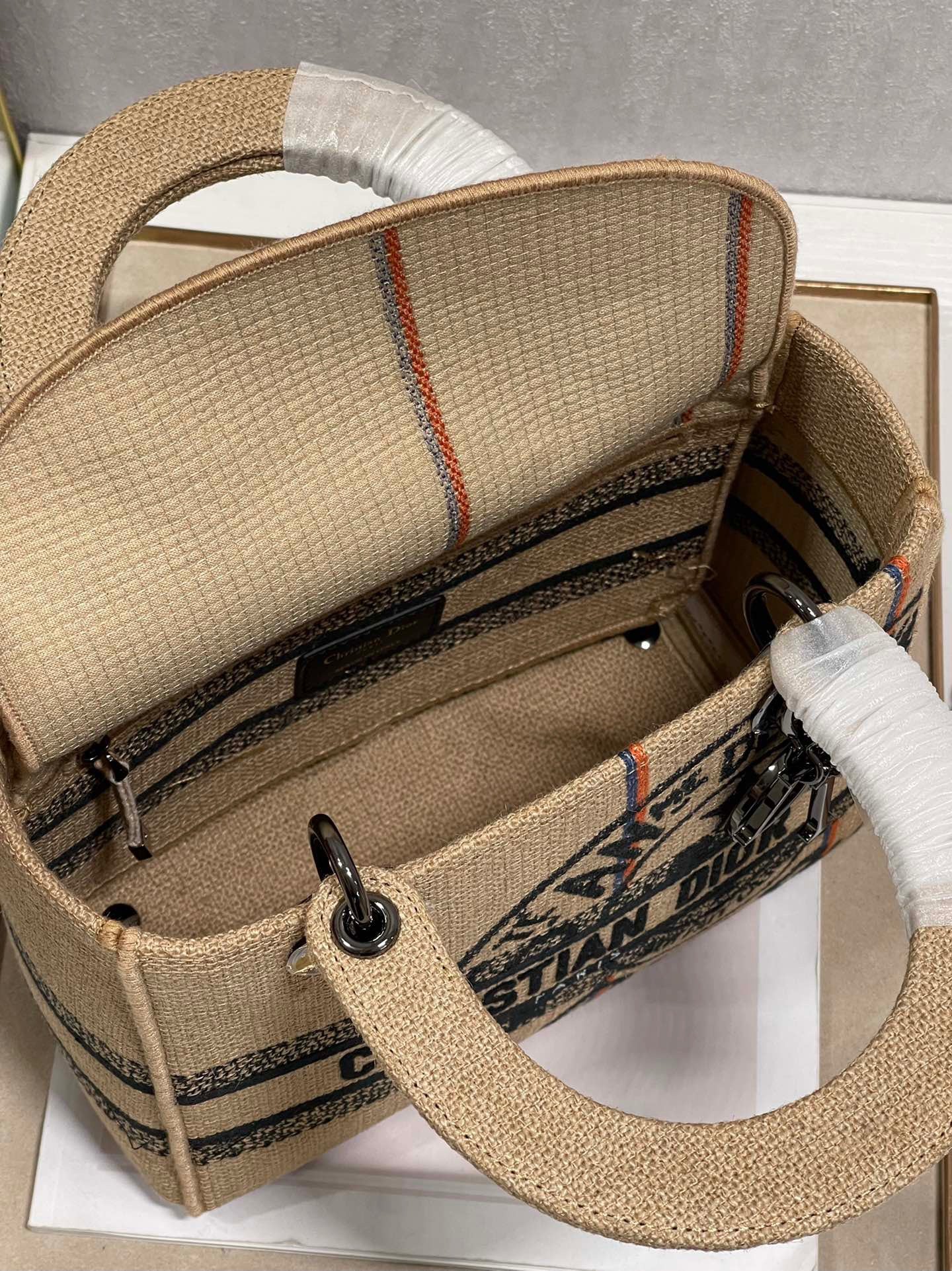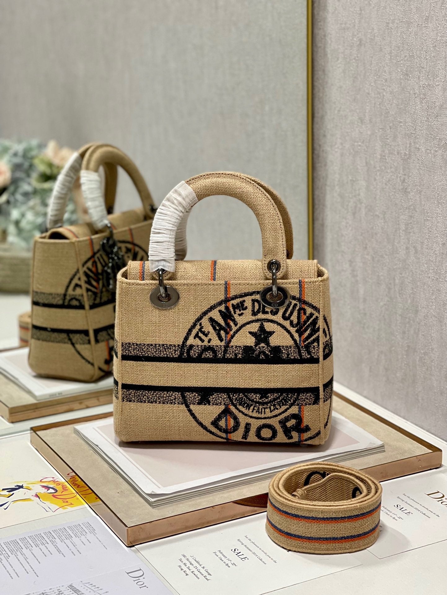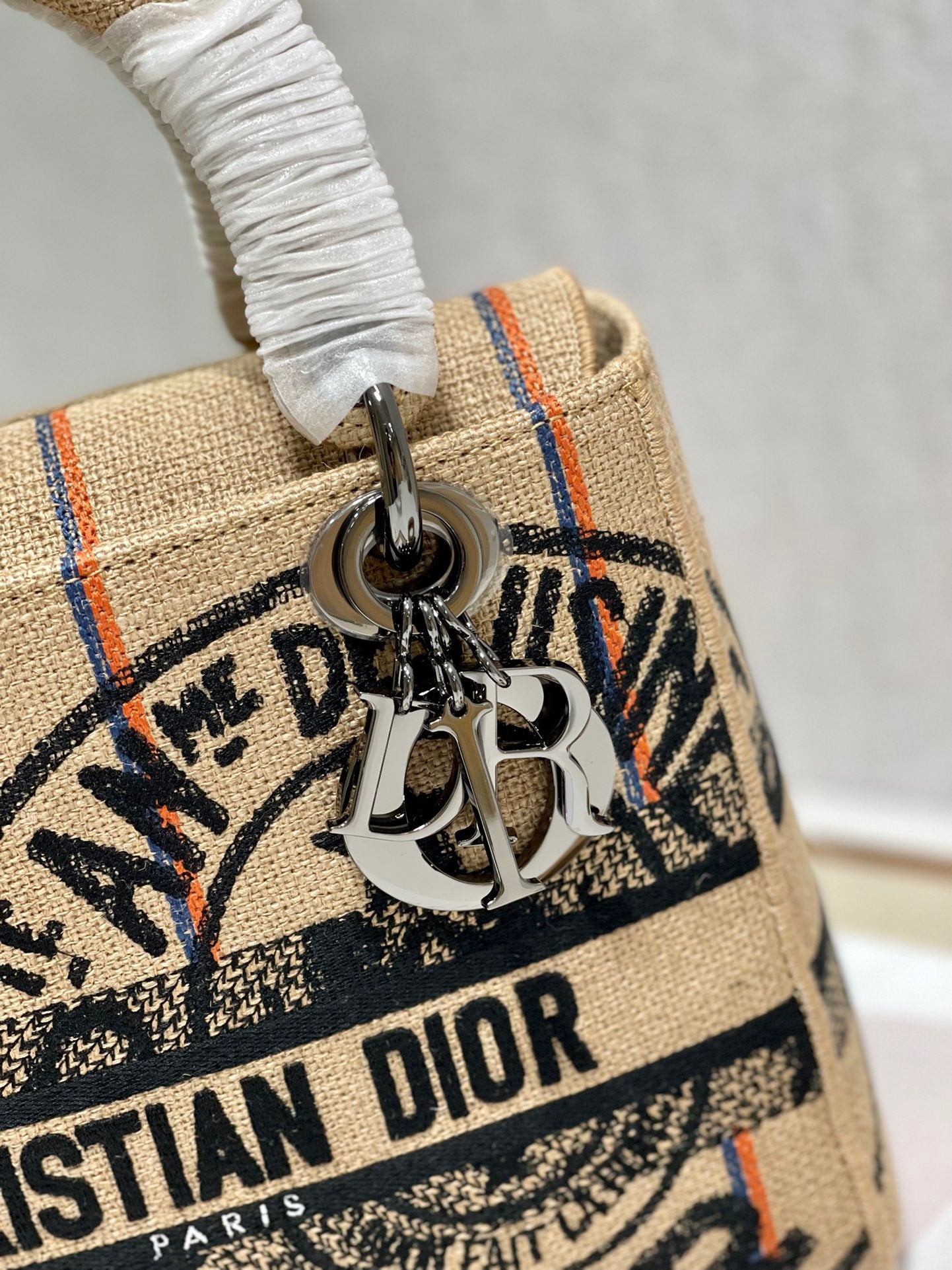 The Lady D-Lite bag embodies the classic elegance and modernity of the House. Crafted in beige embroidered jute canvas, it features the 'L'Union Fait la Force' motto, inspired by the atelier's jute bags and reaffirming the participative dimension dear to Maria Grazia Chiuri. A 'CHRISTIAN DR PARIS' signature adorns the front, while ruthenium-finish metal 'D.R.' charms enhance the silhouette. Boasting a removable and adjustable wide embroidered shoulder strap, the medium bag can be carried by hand or worn crossbody.