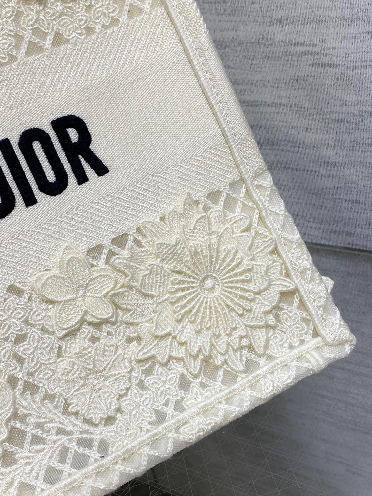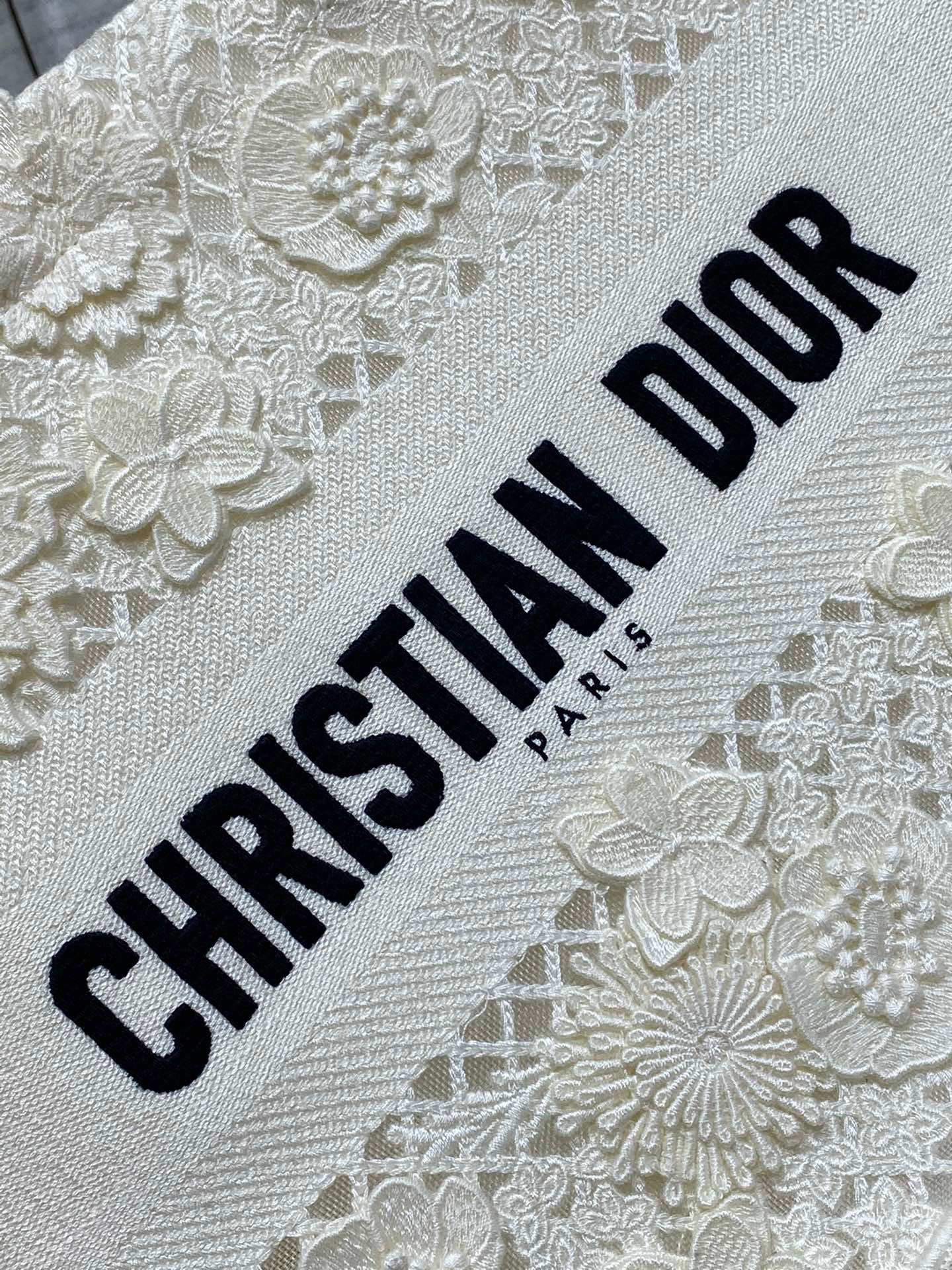 Introduced by Maria Grazia Chiuri, Creative Director of Christian Dior, the Dior Book Tote has become a staple of the Dior aesthetic. Designed to hold all the daily essentials, the style is fully embroidered with a white multicolor D-Lace motif with Macramé effect, inspired by lace and displaying the House's savoir-faire through refined embroidery. Enhanced by the Christian Dior Paris signature on the front, the medium tote exemplifies the signature Dior craftsmanship and may be carried by hand or worn over the shoulder.