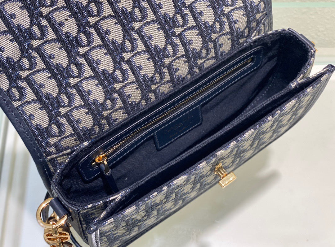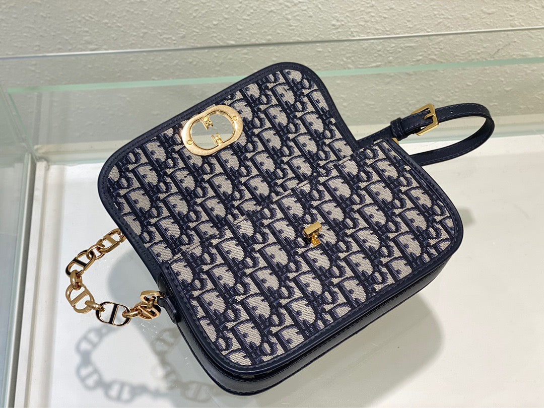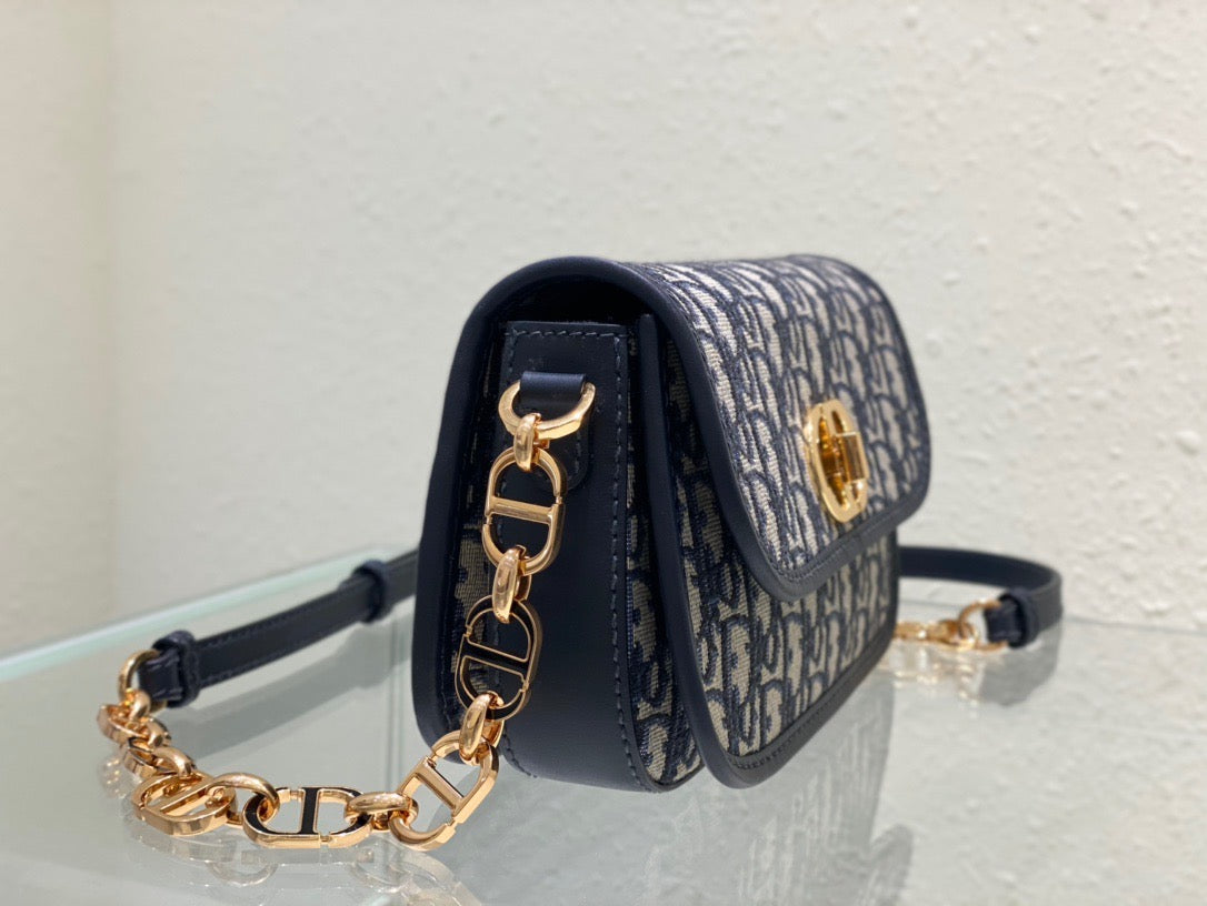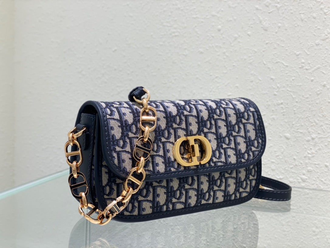 The 30 Montaigne Avenue bag enhances the hallmark line with a timeless and elegant style. Crafted in blue Dior Oblique jacquard, the rounded flap with delicate curves is punctuated by an antique gold-finish metal CD twist clasp inspired by the seal of a Christian Dior perfume bottle. The design is completed by other details, like the 30 Montaigne signature embossed on the back and the signature chain alternating gold-finish metal and enamel links. The small, gusseted bag features a refined silhouette that can be carried by hand, worn over the shoulder or crossbody.