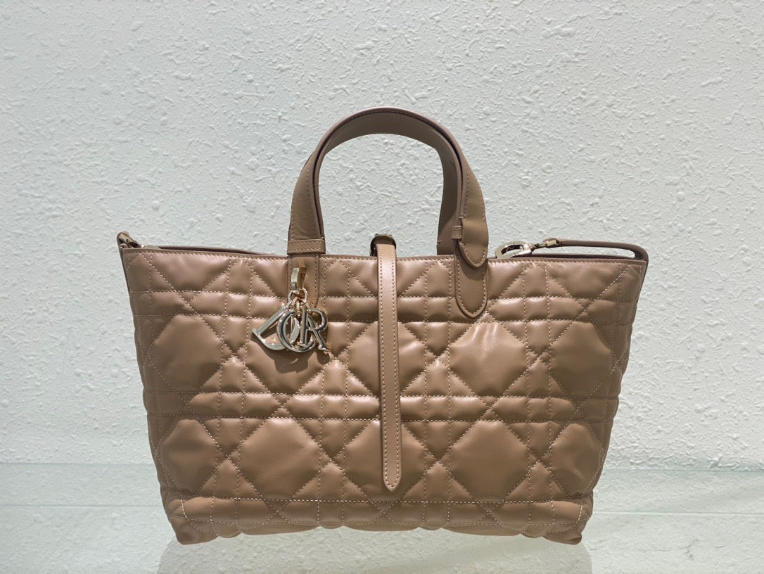 Unveiled at the Spring-Summer 2023 fashion show, the Dior Toujours bag is distinguished by a casual and practical design. Crafted in medium tan calfskin with Macrocannage topstitching, it showcases a spacious interior compartment with a matching pouch to organize essentials. Its leather strap closure keeps items secure while the D of the CD Lock closure twists to adjust the sides and enhance the bag's silhouette. The leather handles can be adjusted using the small notches in order to be able to carry the medium bag by hand or wear it over the shoulder.