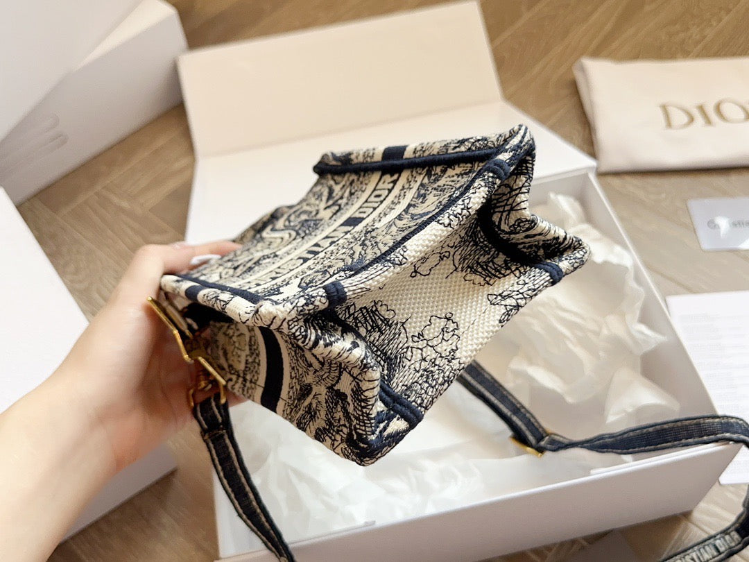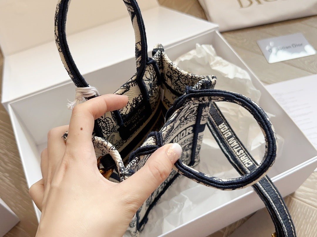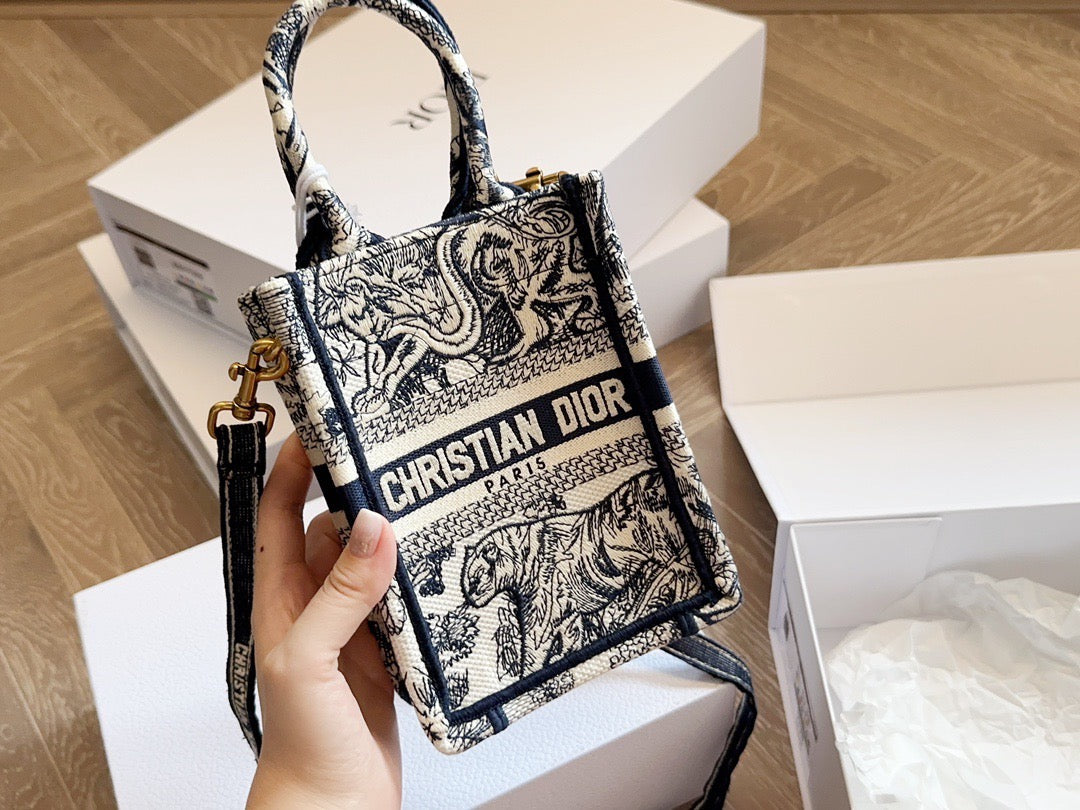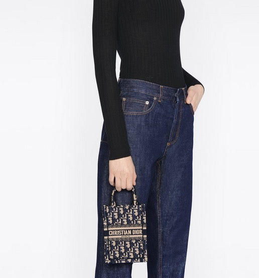 This season, Maria Grazia Chiuri's phone bag is enriching the iconic Dior Book Tote line. A perfect example of the House's savoir-faire, the style is entirely embroidered with the blue Dior Oblique motif, and is enhanced by the 'CHRISTIAN DIOR PARIS' signature on the front. The miniature bag will accommodate a phone as well as small daily essentials. Completed by an adjustable and removable embroidered shoulder strap, the modern accessory can be worn in the hand, on the shoulder or crossbody.
