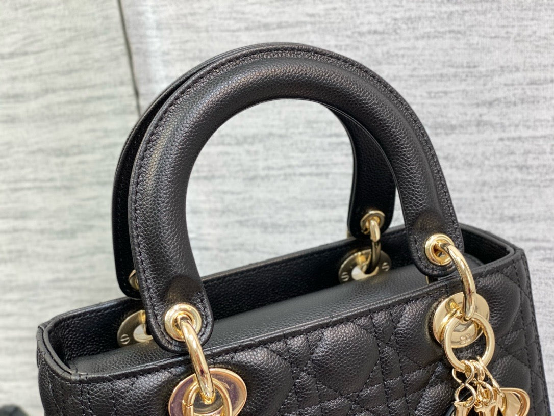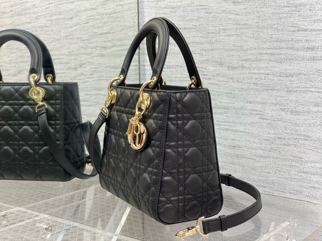 The Lady Dior bag epitomizes the House's vision of elegance and beauty. Sleek and refined, the timeless creation is crafted in black lambskin with Cannage stitching, creating the instantly recognizable quilted texture. The pale gold-finish metal D.I.O.R. charms offer an elegant allure. Featuring a thin, removable leather shoulder strap, the medium Lady Dior bag can be carried by hand or worn crossbody.