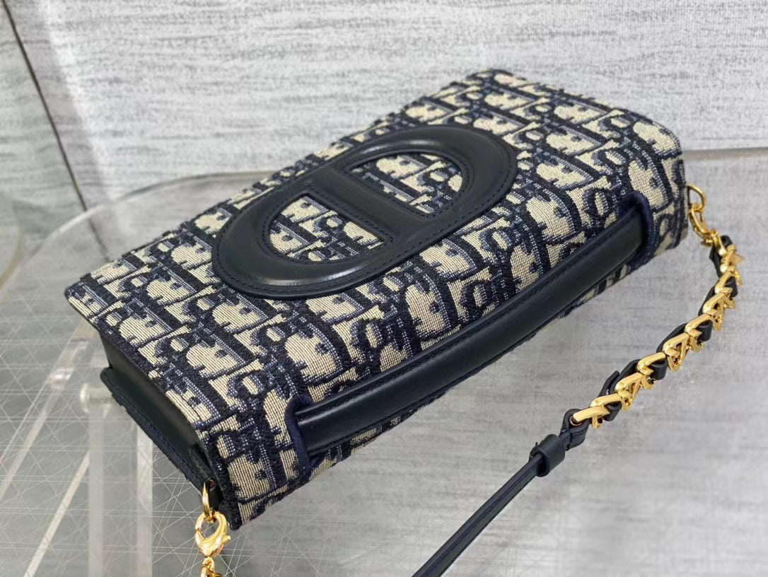 New for Winter 2023, Maria Grazia Chiuri's CD Signature mini bag combines functional design with the House's modern spirit. Crafted in blue Dior Oblique jacquard, it is distinguished by an embossed CD signature on the front that showcases the House savoir-faire. The practical accessory will accommodate your essentials and is the ideal day and evening companion. A top handle completed by an adjustable and removable chain interlaced with leather allows the bag to be carried by hand or worn crossbody.