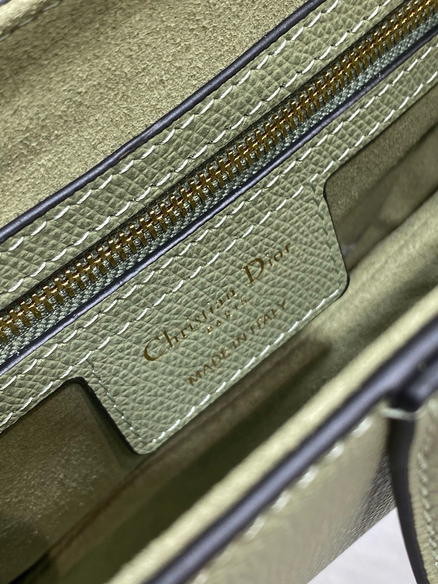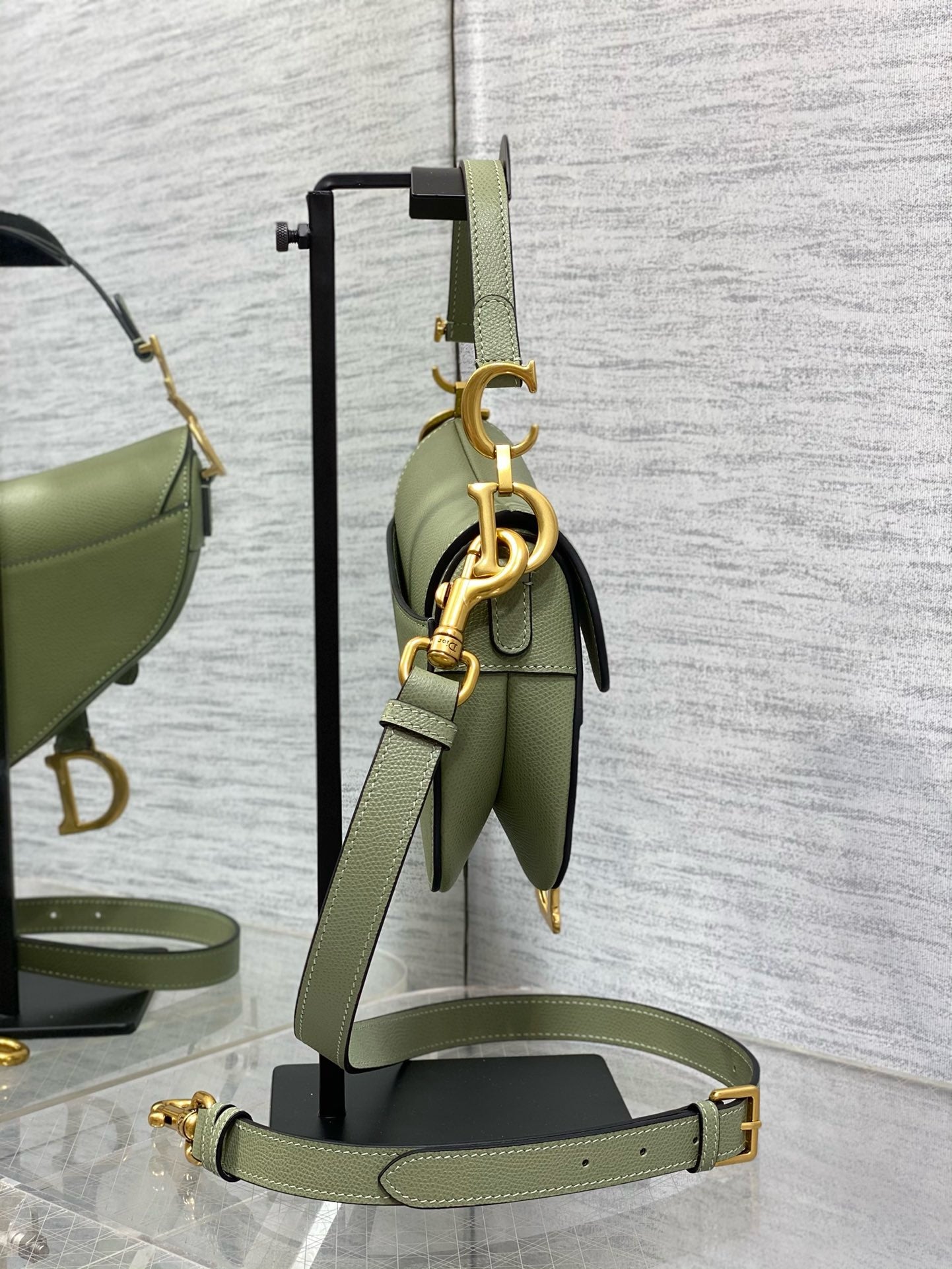 Maria Grazia Chiuri brings a fresh update to the iconic Saddle bag. Crafted in pastel peyote green deerskin with a subtle pearlescent effect, the legendary design features a Saddle flap with a D stirrup clasp on a magnetic strap with pulls, as well as an antique gold-finish metal CD signature on either side of the shoulder strap. Equipped with a thin, adjustable and removable shoulder strap, the miniature Saddle bag may be carried by hand, worn over the shoulder or crossbody.
