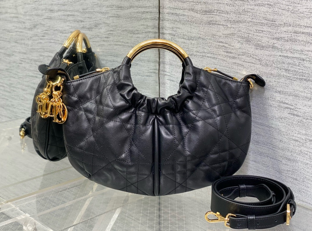 Unveiled at the Autumn-Winter 2024-2025 Fashion Show, the new Walk in Dior purse has a modern design with couture appeal, perfect for day or evening. Demonstrating the House's savoir-faire, it is crafted in black calfskin and enhanced by the quilted effect of the Macrocannage motif and D.I.O.R. charms. The zip closures reveal a practical interior, while the structured top handles in antique gold-finish metal are completed by an adjustable and removable leather strap, allowing it to be carried by hand, worn over the shoulder or crossbody.