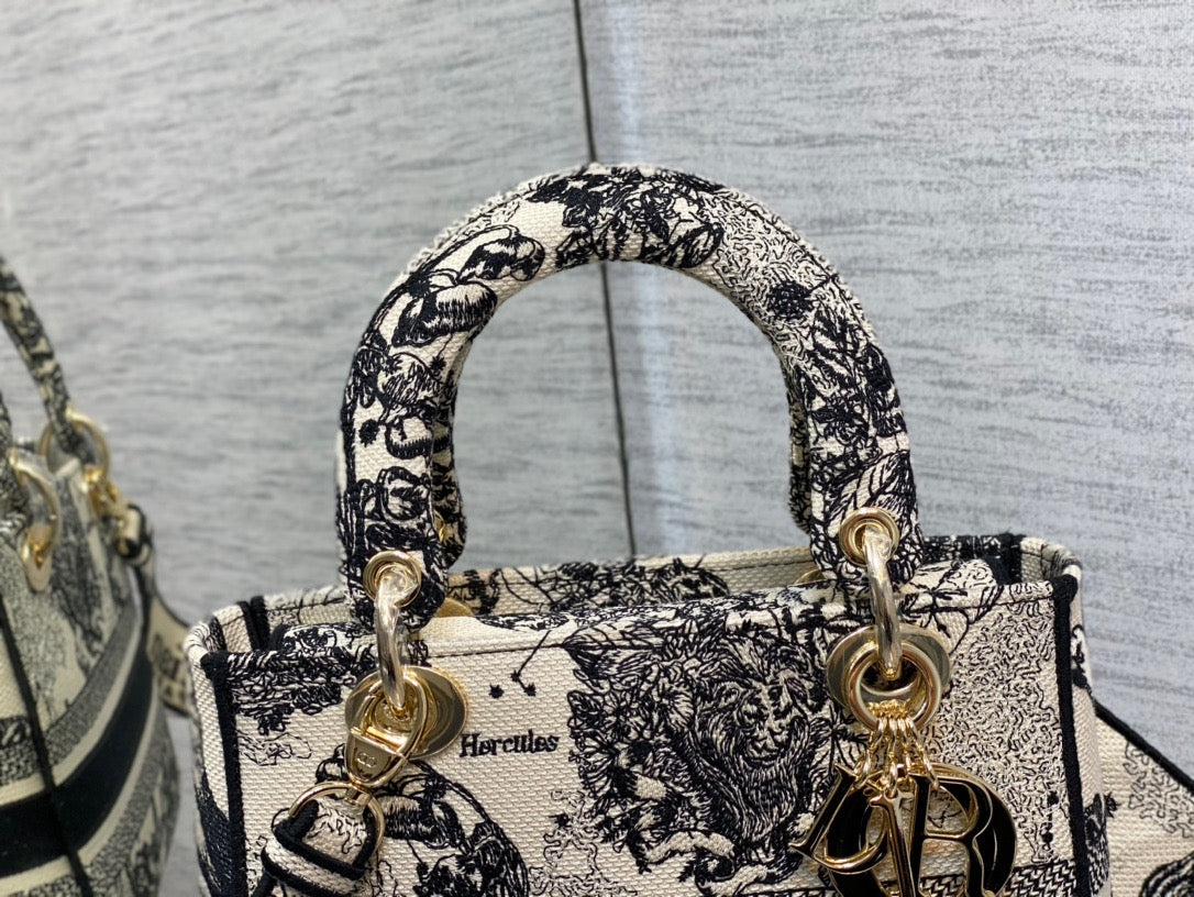 The Lady D-Lite bag combines classic elegance with House modernity. The style is fully embroidered with the latte Toile de Jouy Zodiac motif, a new take on the iconic pattern inspired by Mr. Dior's passion for astrology. A 'CHRISTIAN DIOR PARIS' signature adorns the front, while thick 'D.I.O.R.' charms in pale gold-finish metal further enhance and highlight the silhouette. Featuring a wide, reversible and removable embroidered shoulder strap, the medium Lady D-Lite bag can be carried by hand or worn crossbody.