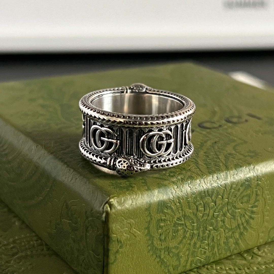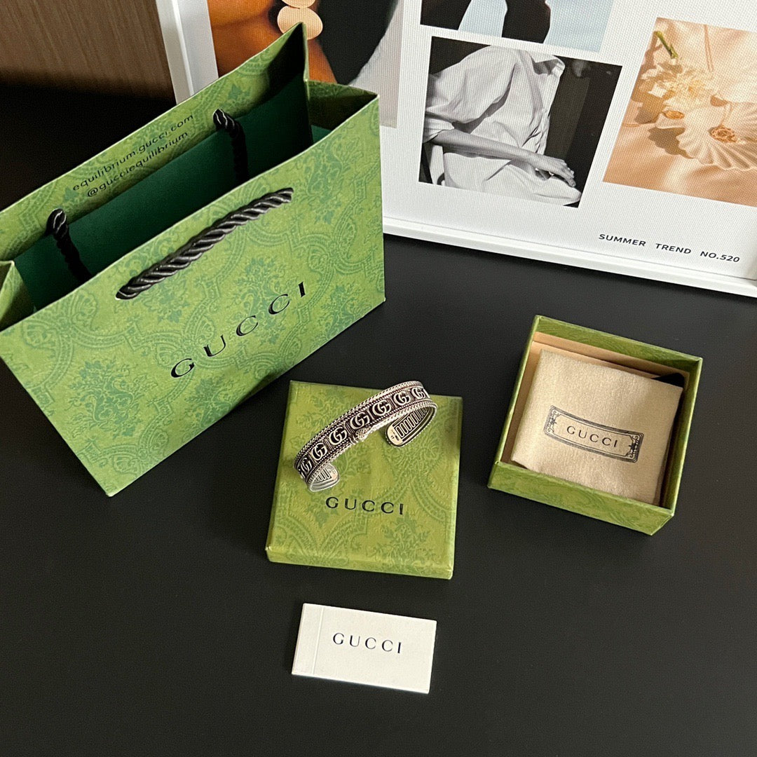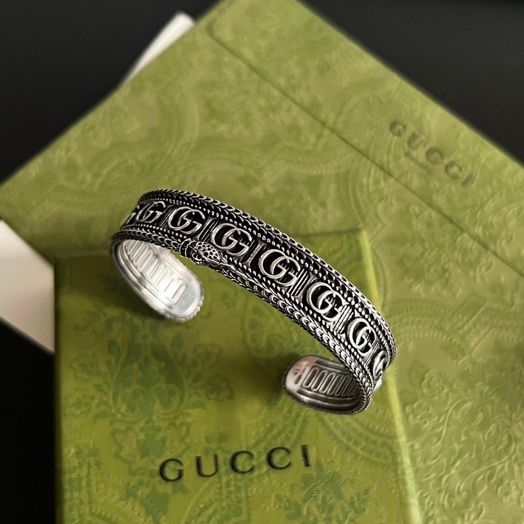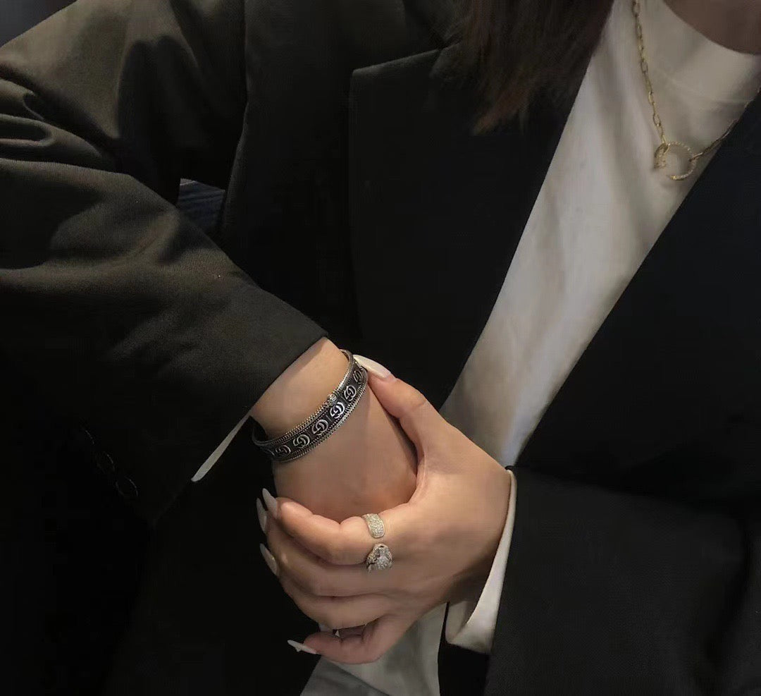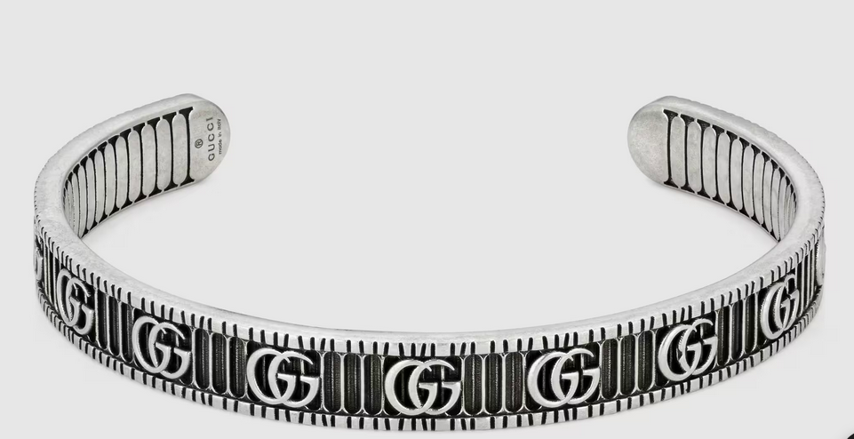The Double G continues to define House designs. A contemporary take on an archival Gucci belt from the '70s, the distinctive symbol is combined with engraved patterns on a collection of silver jewelry. Set against a three-dimensional striped design with a bicolor effect, the emblematic code brings dimension to a thin cuff bracelet.