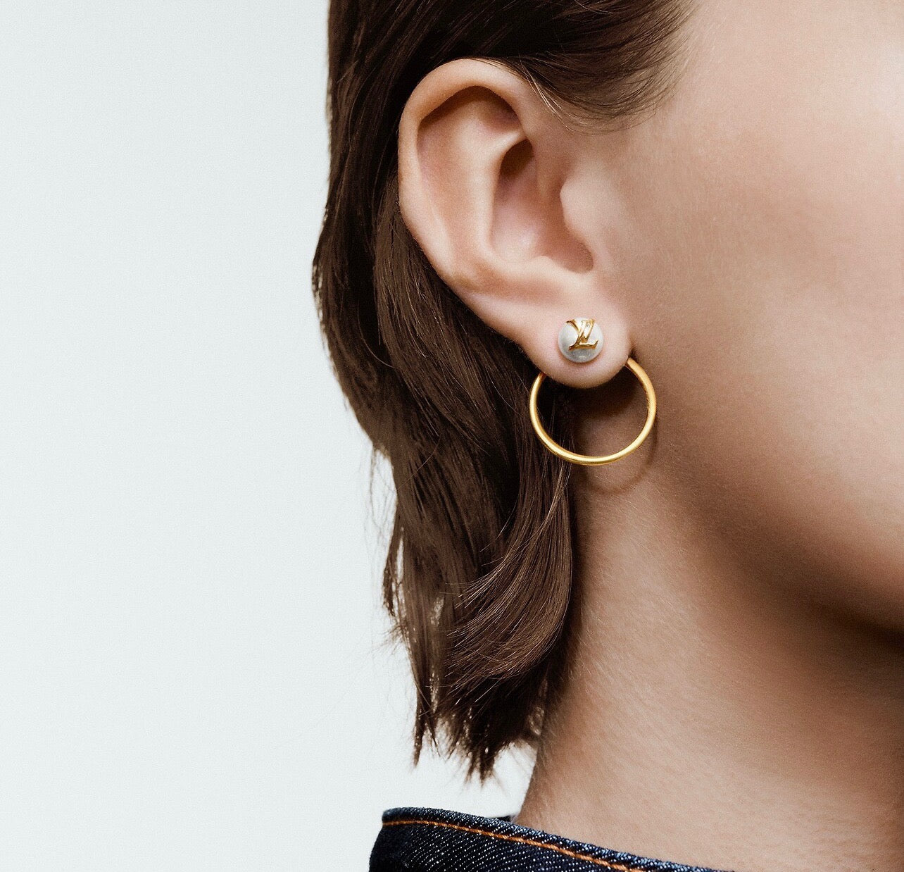 The LB Eclipse Pearls earrings underline the shape of the ears with ethereal elegance. A thin hoop of gold-tone brass is anchored to a gleaming white resin pearl marked with the LB Initials for a discreet signature. Their spare, contemporary design adds a precious touch of refinement to any look.