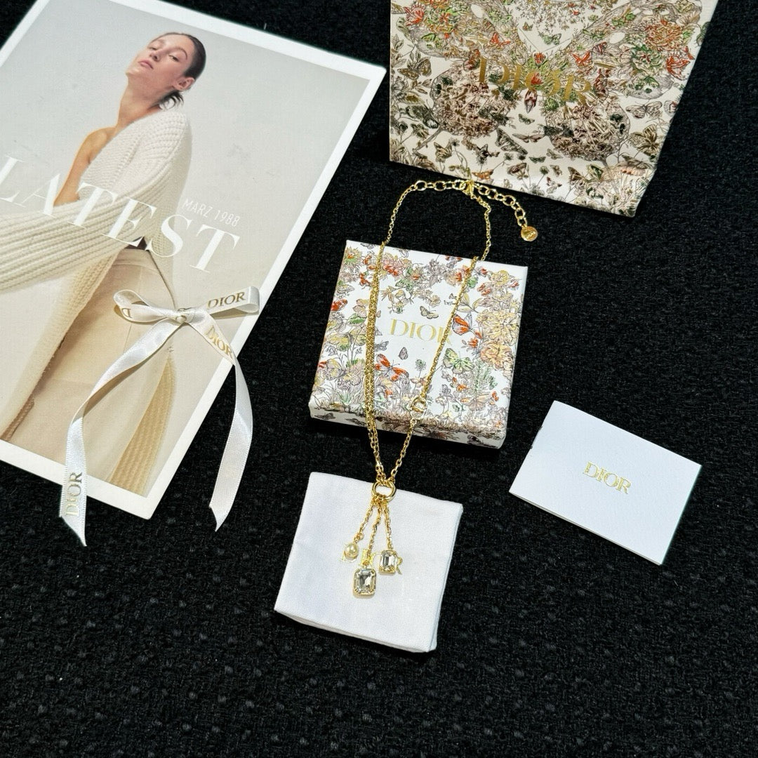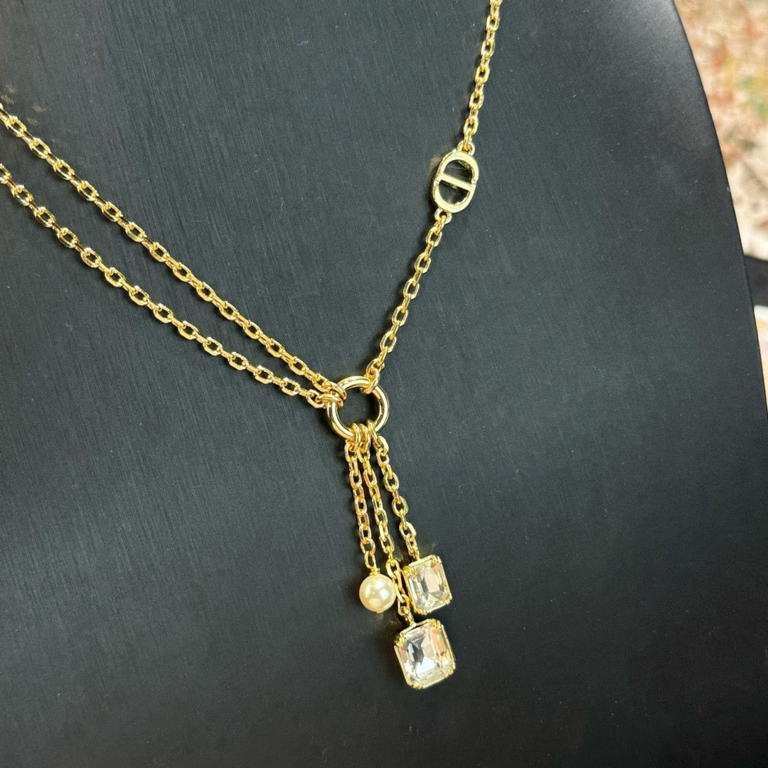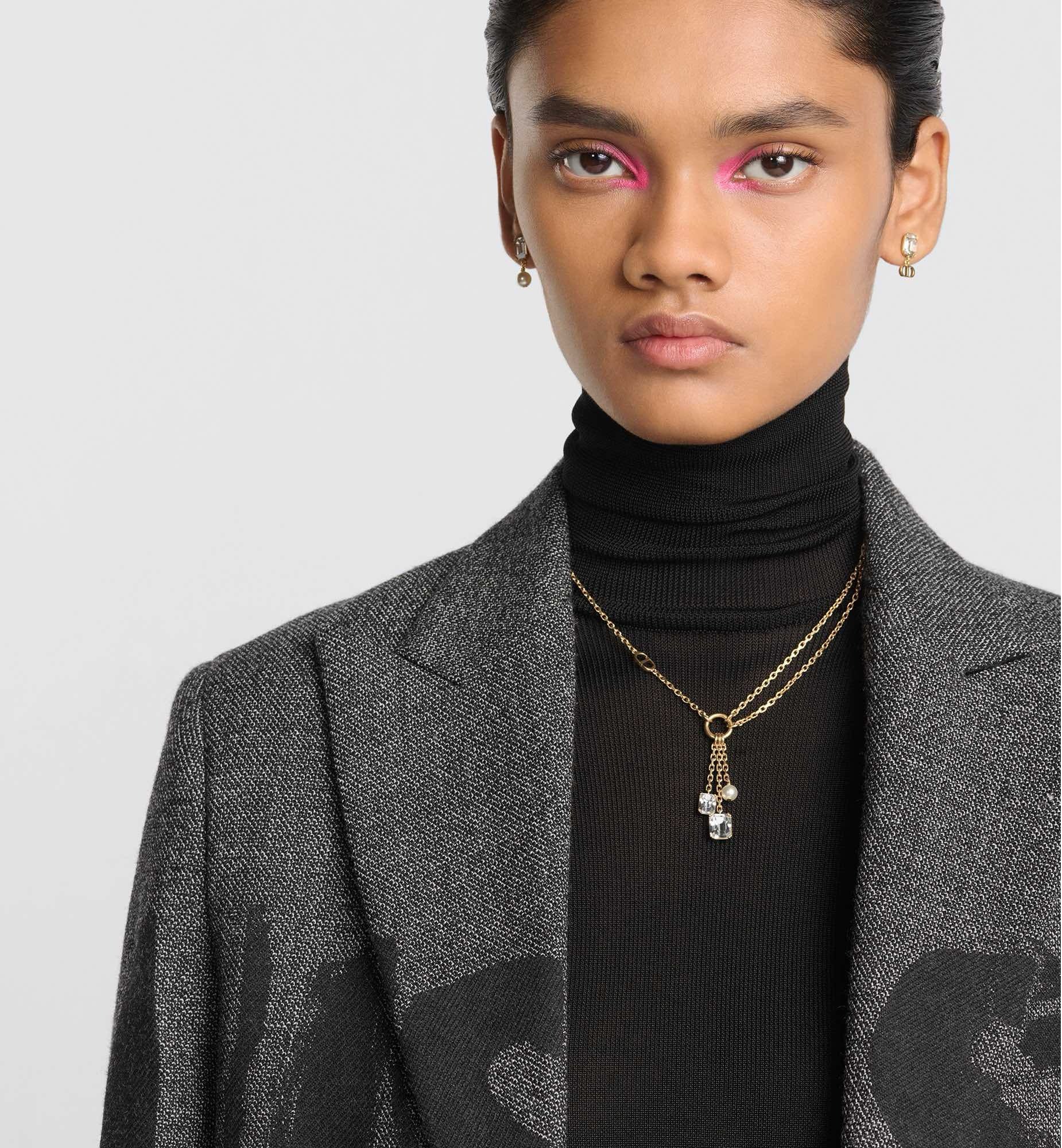 The Petit CD necklace has an elegant, modern design. The asymmetric gold-finish metal style is accented by the CD signature and embellished with a white resin pearl and silver-tone faceted crystals hanging from a ring. The sophisticated necklace can be coordinated with other Petit CD creations.