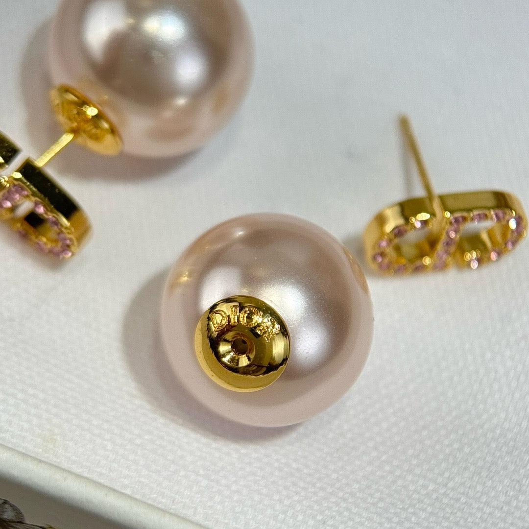 The Dior Tribales earrings are offered in an elegant and timeless variation. The back showcases an iridescent pink resin pearl, while the front features a gold-finish metal CD signature with pavé-set pink crystals. The earrings can be coordinated with other creations from the Petit CD line.