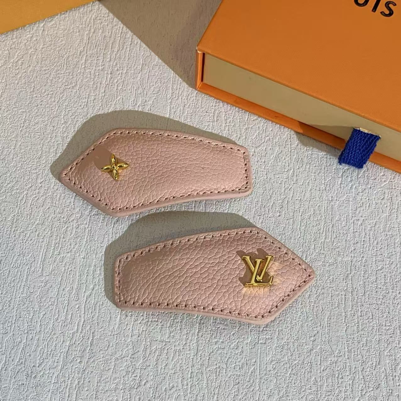 The LV Backstage hair clips come in a set of two for a double signature look. Crafted in leather, they feature an angular shape accented with a pair of House icons in gold-tone metal: the LV Initials on one and a Monogram Flower on the other. A refined, elegant finishing touch for a striking hairstyle.