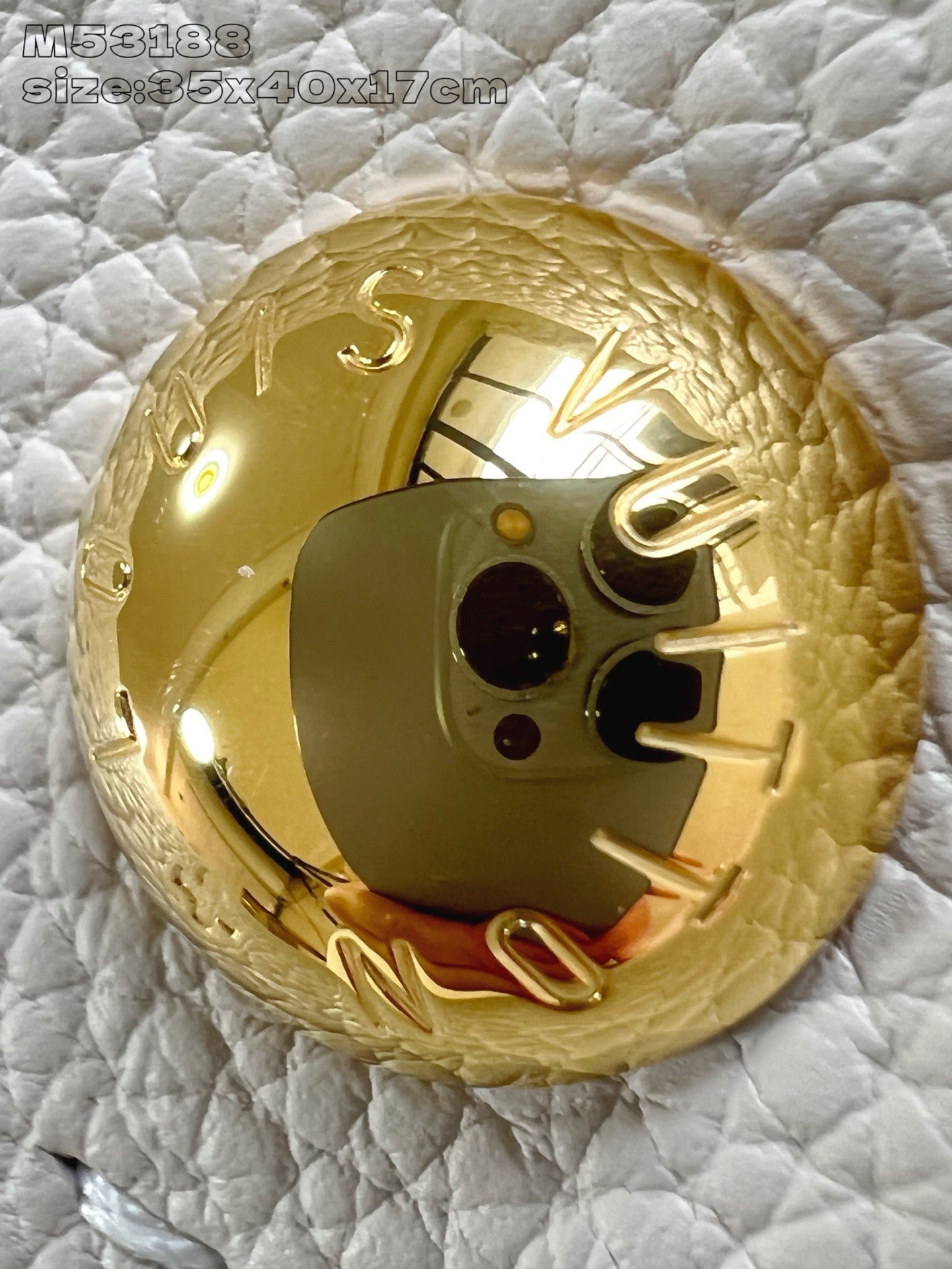 This elegant edition of the Carmel handbag belongs to the Dream animation. Crafted from signature Mahina leather, it is patterned with Monogram perforations depicted using a unique watercolor technique – look closely to note the intricate color variations. The capacious style is sized to fit a laptop and features a removable LV braided charm and an address tag, both of which can be removed if desired.