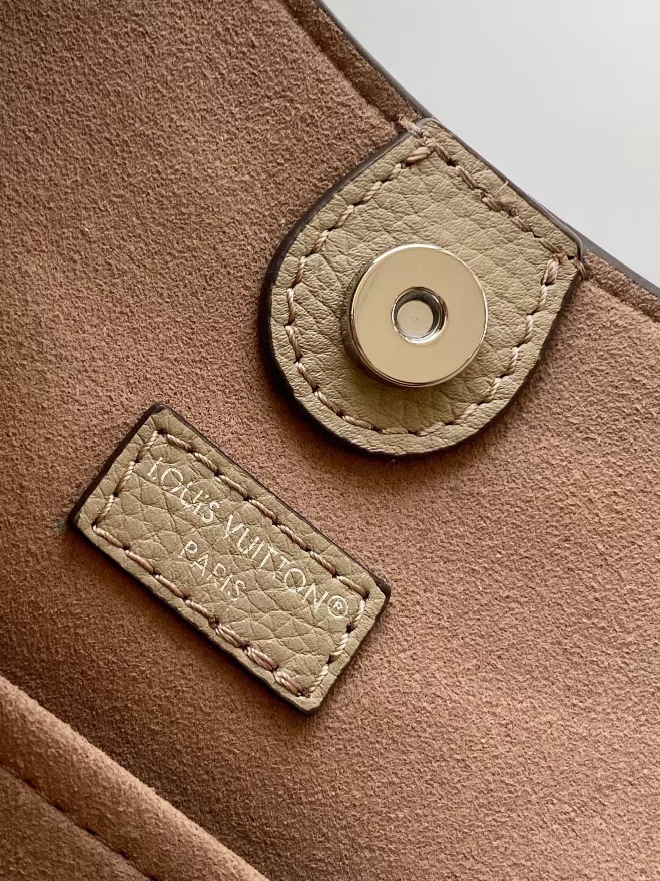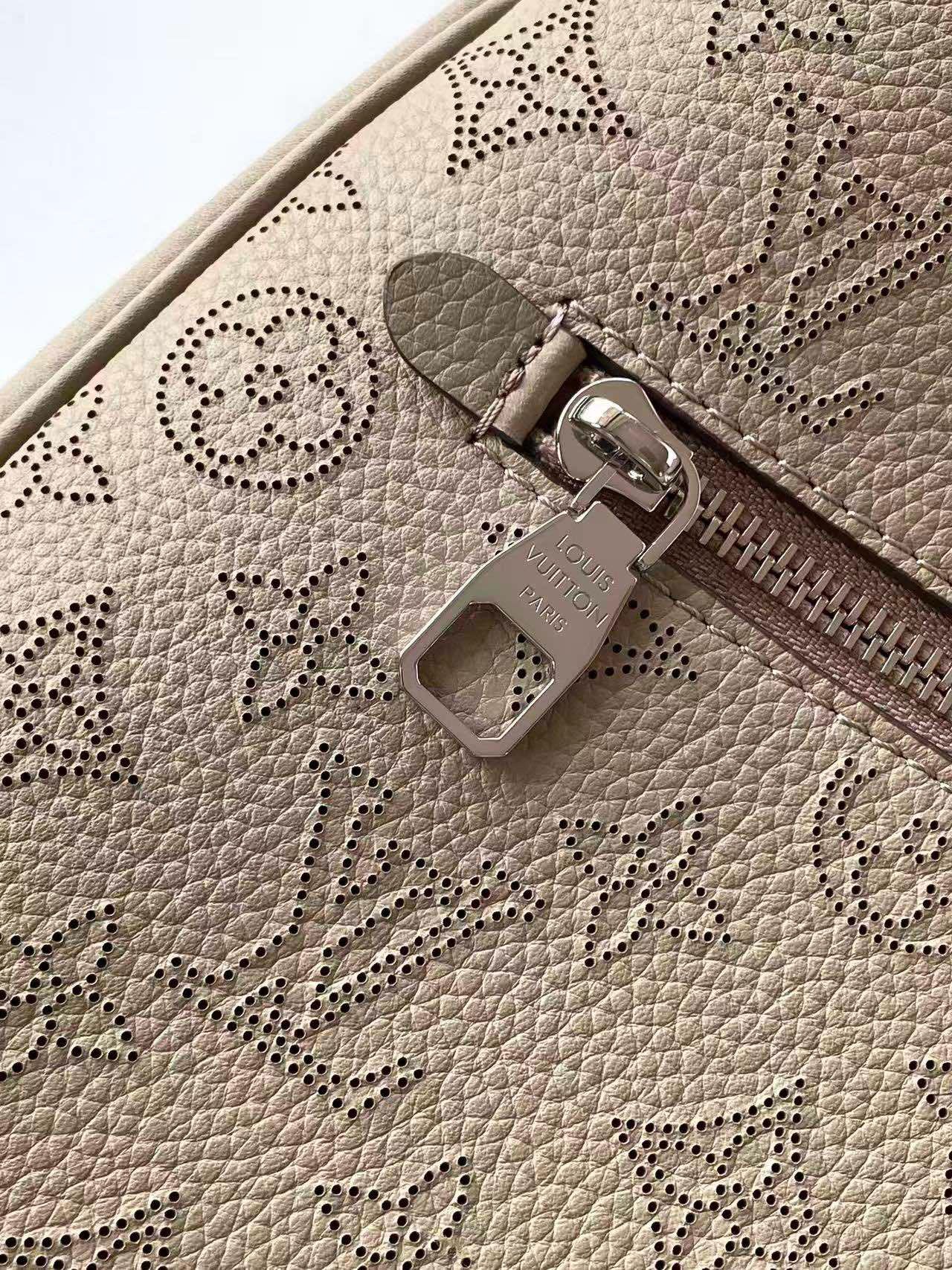 The All Around MM is a sophisticated everyday style. It is crafted from signature Mahina leather patterned with Monogram perforations, and is elevated with gold-toned hardware, including a decorative padlock that elevates the magnetic closure. The versatile design also features an LV leather charm and can be worn cross-body or over one shoulder.